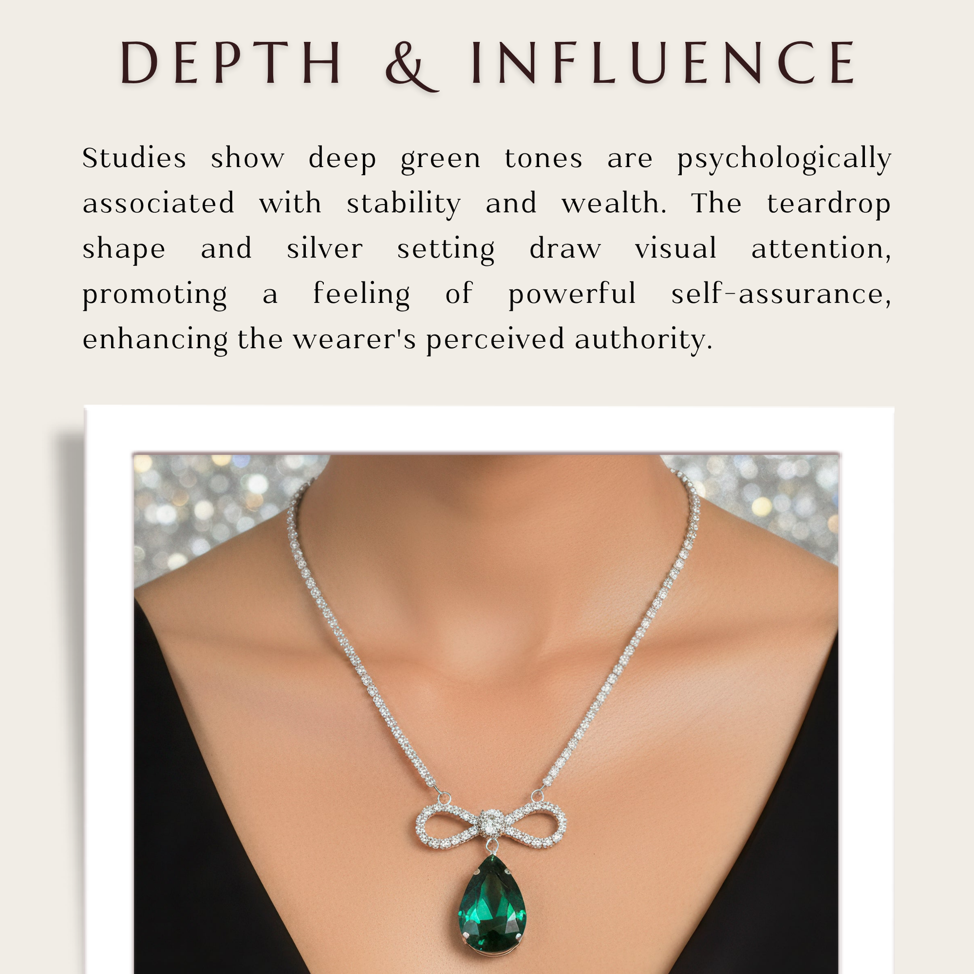 With its opulent accents and classic elegance, this necklace is sure to turn heads wherever it goes. The item is ideal for both daytime and nighttime use because of its brilliant rhinestone chain, which gleams exquisitely with each movement. An elegant, symbolic touch is added at its center by the infinity bow, which stands for boundless beauty and charm. An enormous drop crystal in a gorgeous emerald color, glistening with refinement and brilliance, hangs from the bow. The necklace's rich green hue adds to its appeal and provides a striking yet elegant finish. This necklace is impactful yet lightweight, fits comfortably around the neck, and quickly makes any ensemble look better. It combines beauty with understated elegance, making it perfect for formal events, parties, and special occasions.