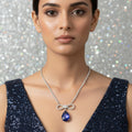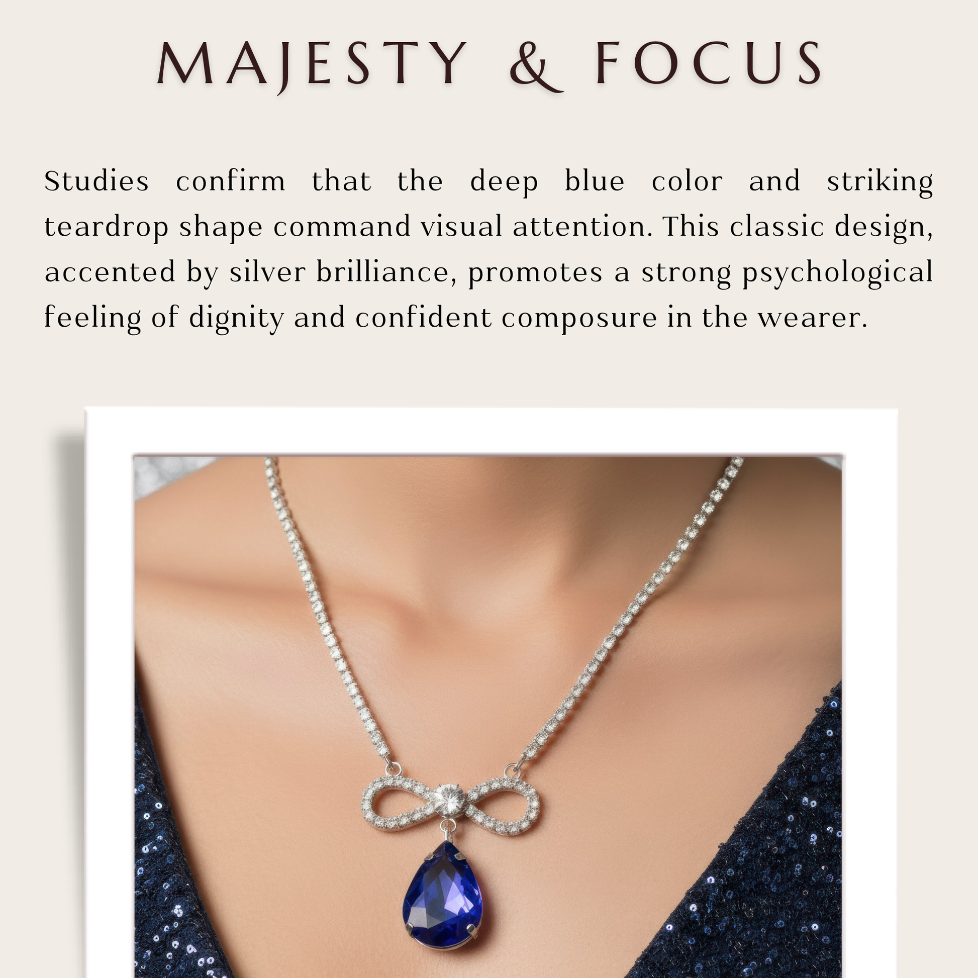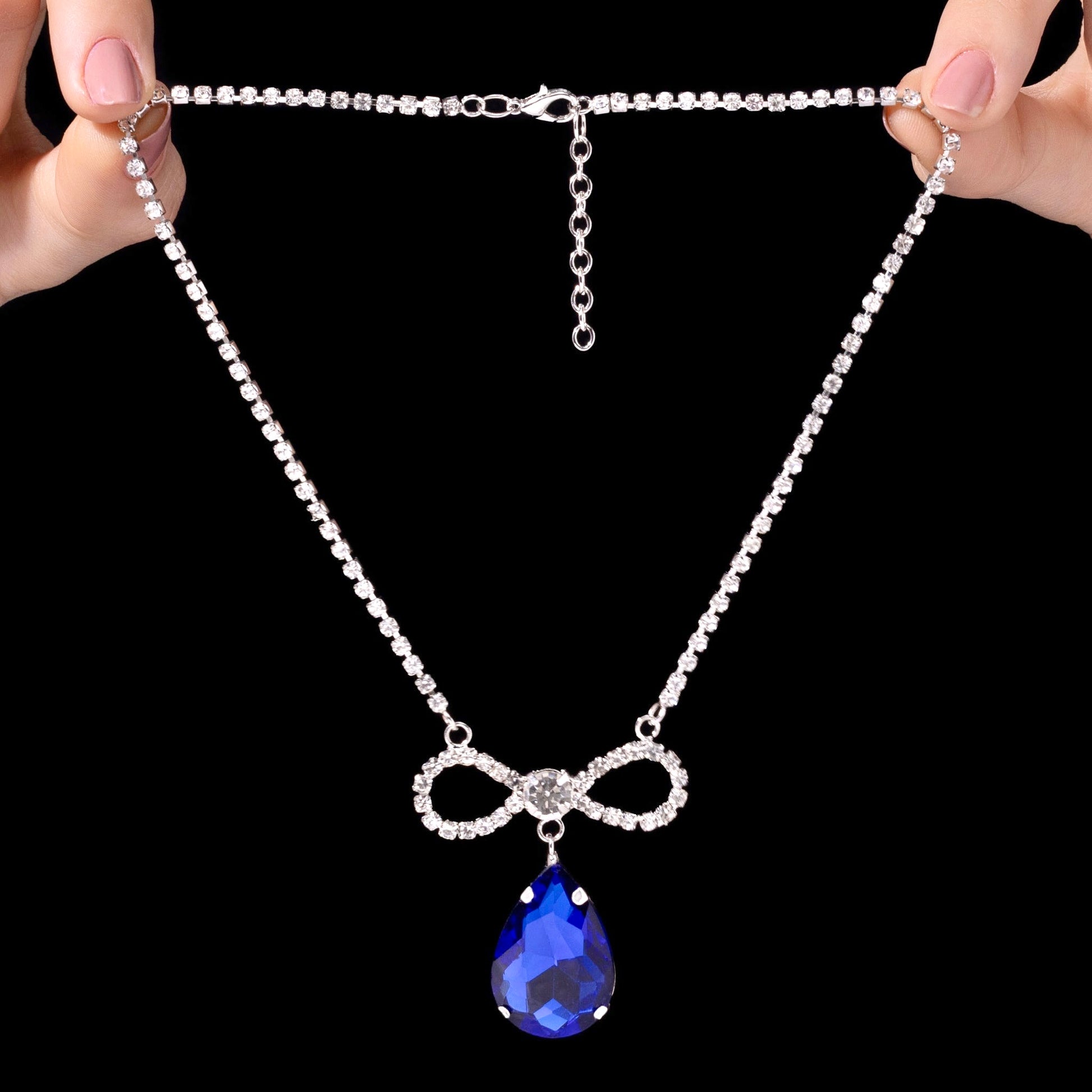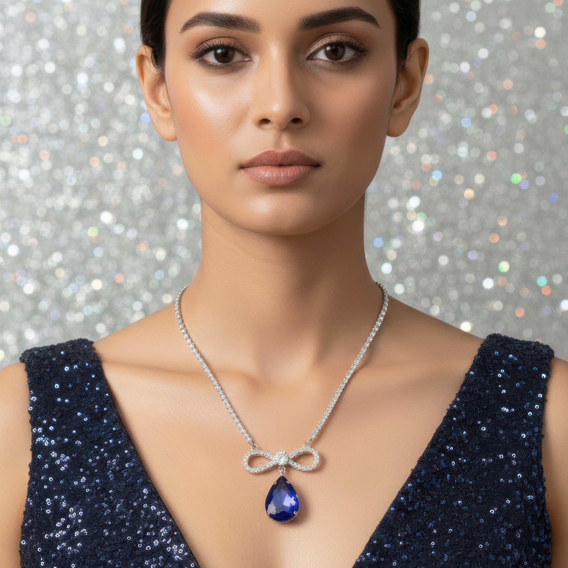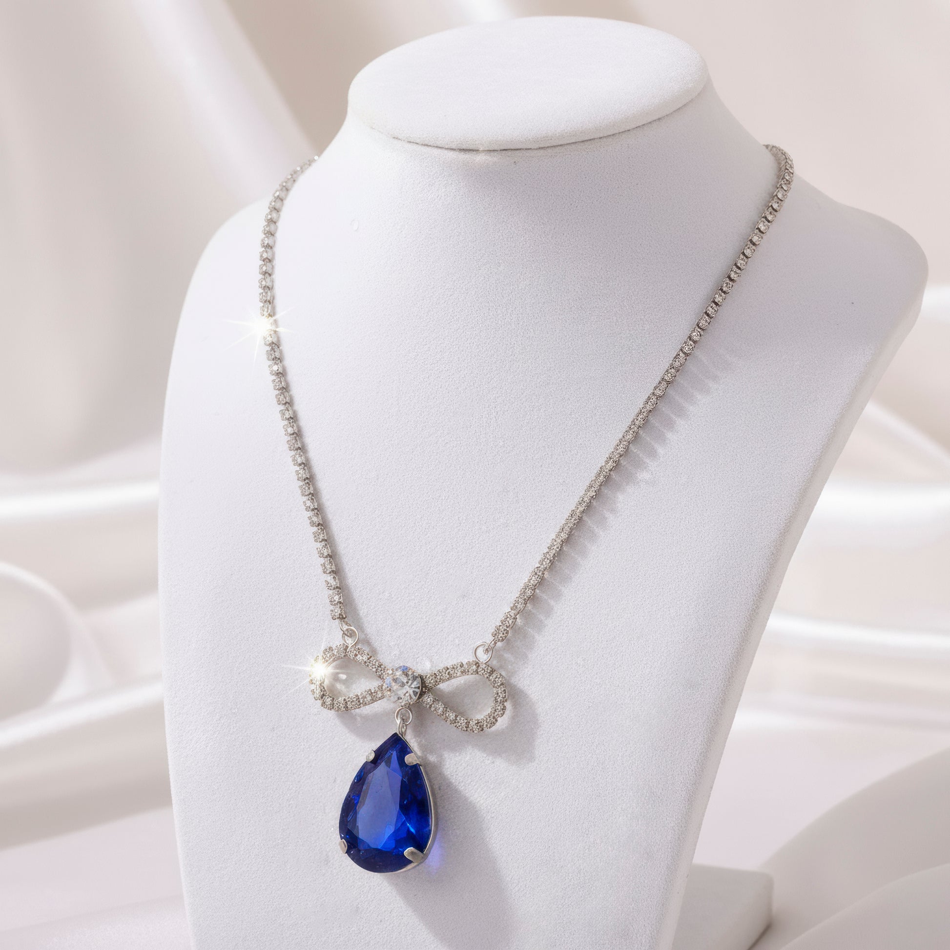This gorgeous necklace is the ideal statement item for any event since it blends classic elegance with brilliant brilliance. The neckline is elegantly framed by a glittering rhinestone chain that gleams in every direction. A delicate infinity bow, representing timeless beauty and grace, sits at its center. It is embellished with exquisite embellishments for a sophisticated appearance. An enormous drop crystal with a deep blue sapphire hue that is suspended below oozes sophistication and regal beauty. The striking blue stone ensures a dramatic yet refined appearance by adding depth and character. Its comfy and lightweight design easily goes with both evening and formal attire. Wearing this necklace at weddings, parties, or other special occasions draws attention and gives your look a dash of opulent glitz.