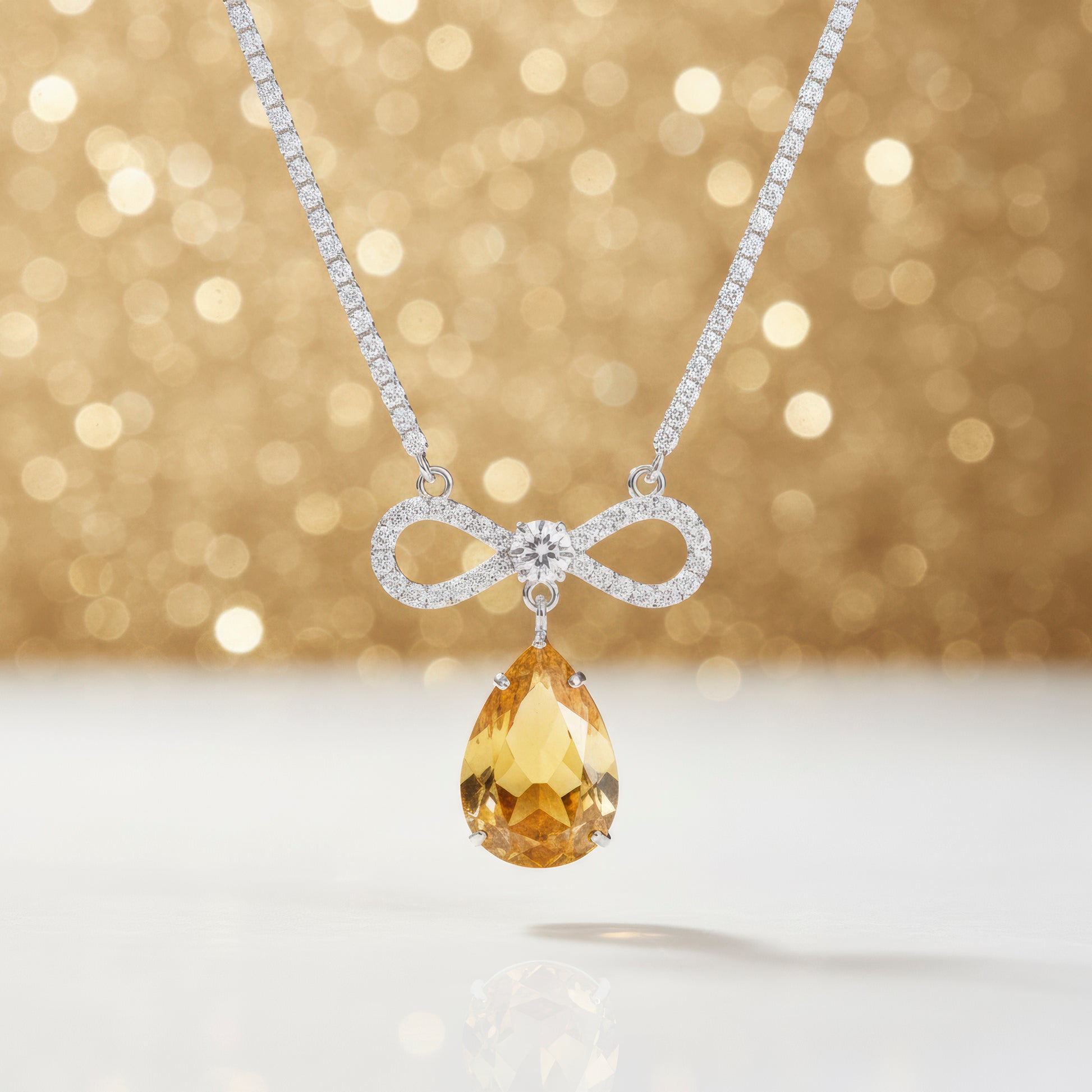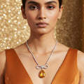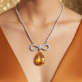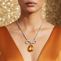 Every element of this stunning necklace is intended to exude coziness, grace, and sophistication. The delicately sparkling, expertly created rhinestone chain gives the neckline a faint yet alluring glitter. A delicately crafted infinity bow, a representation of eternal grace and continuity, with sparkling accents, sits at its center. An enormous drop crystal in a gorgeous yellow topaz color, glistening with golden brilliance and radiating happiness, optimism, and self-assurance, hangs from the bow. It stands out effortlessly with to its rich, vivid color, which contrasts sharply with the rhinestone setting. This elegant yet lightweight necklace adds a touch of glitz and charm to both contemporary and classic ensembles, making it ideal for special evenings, weddings, or celebrations.
