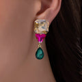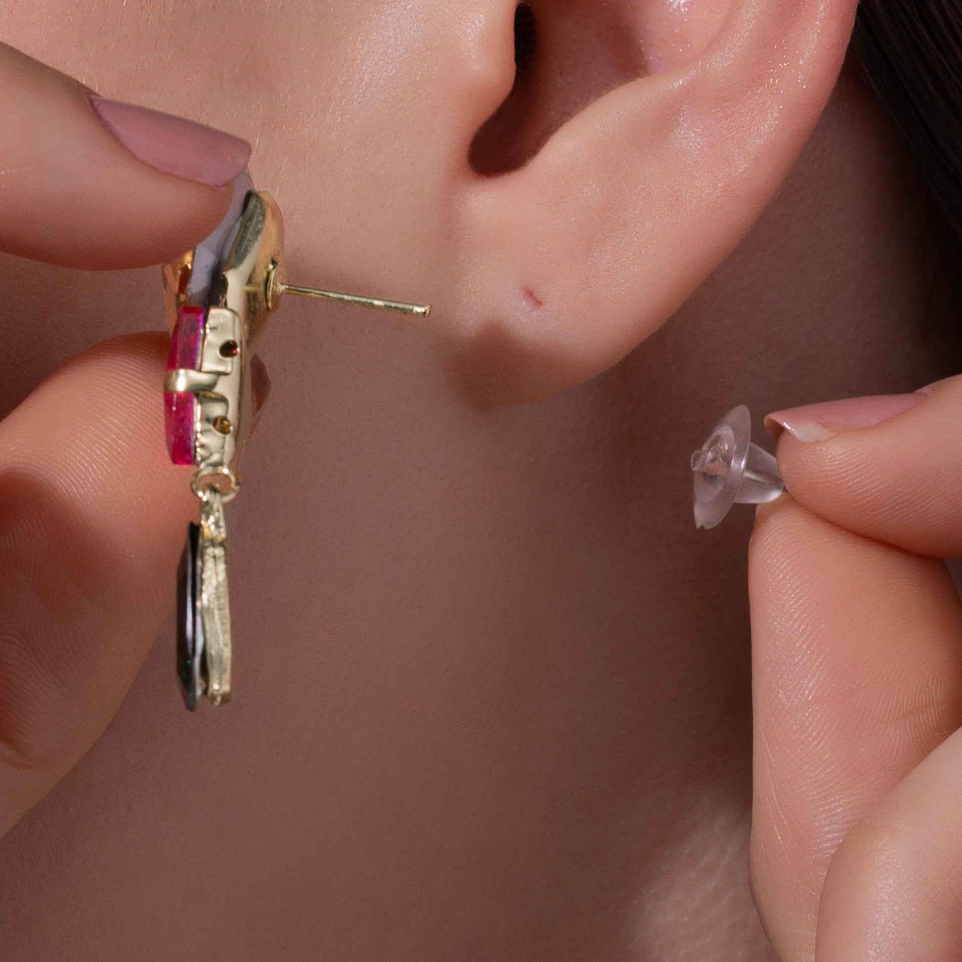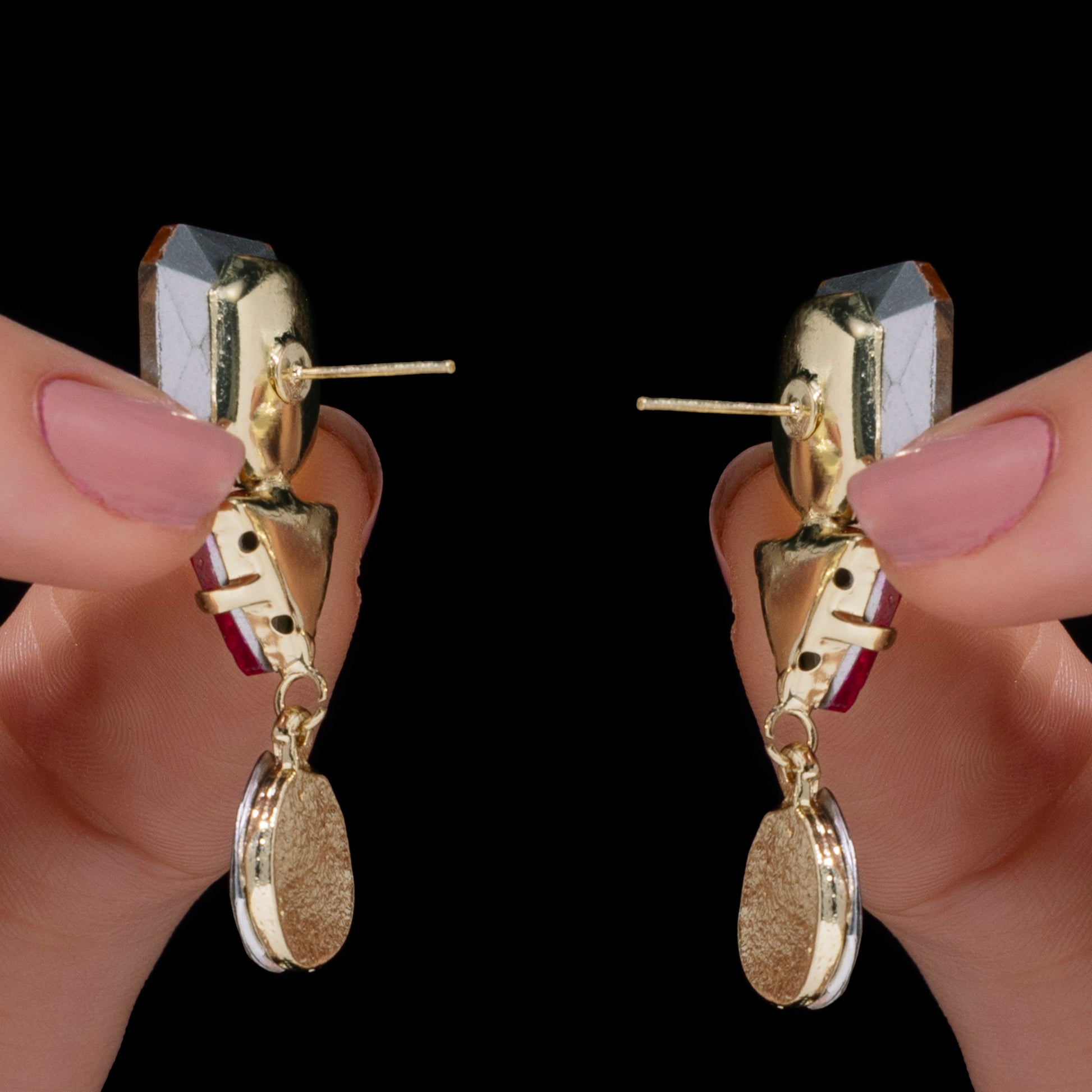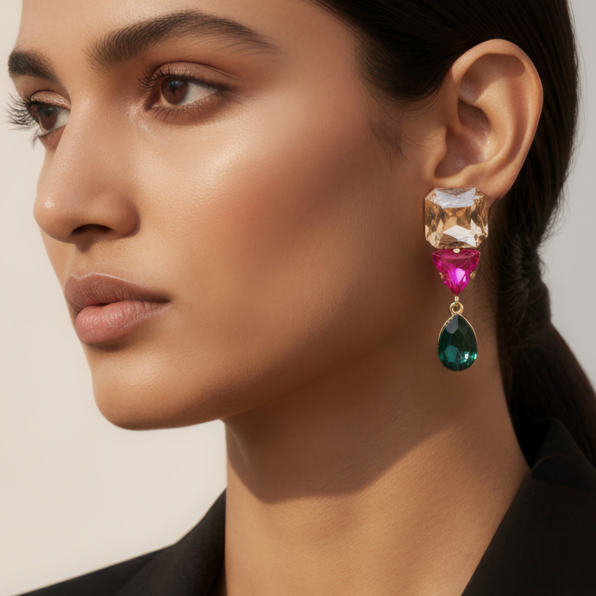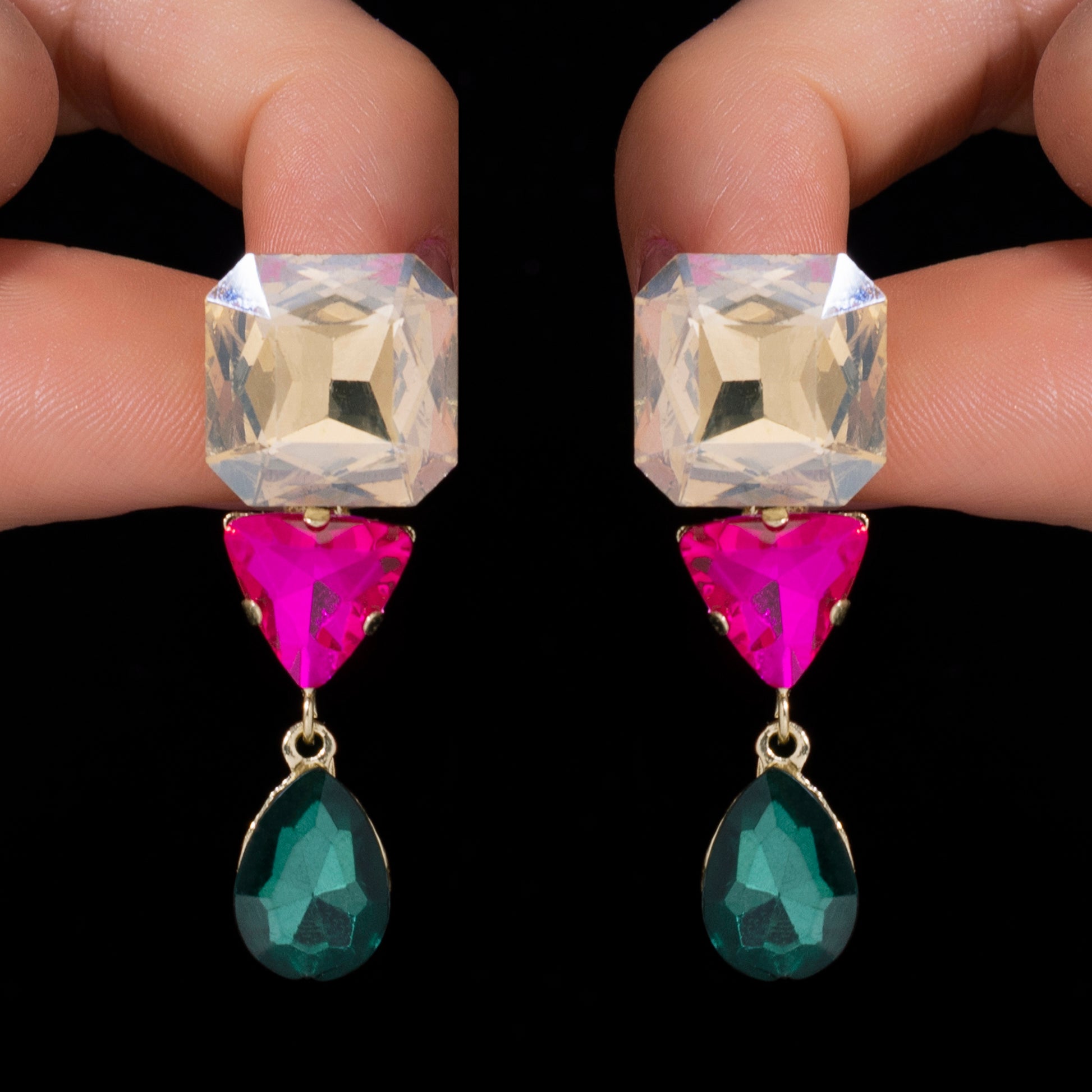 The creative tri-shape design of these exquisite dangle earrings skillfully blends cushion, trillion, and drop cuts for a chic and striking appearance. A beautiful flow of geometric brilliance is displayed by the meticulous setting of each shape to provide harmony and balance. The drop cut provides classic elegance, the trillion cut adds a sharp, contemporary edge, and the cushion cut gives softness with its rounded edges. When combined, they produce the ideal blend of traditional and modern design. With each movement, the delicately suspended earrings add dazzling brilliance as they capture light from all directions. Chic and versatile, they go well with both formal and casual ensembles, making them the perfect addition to daily ensembles or finishing off evening wear with understated grace and charm.