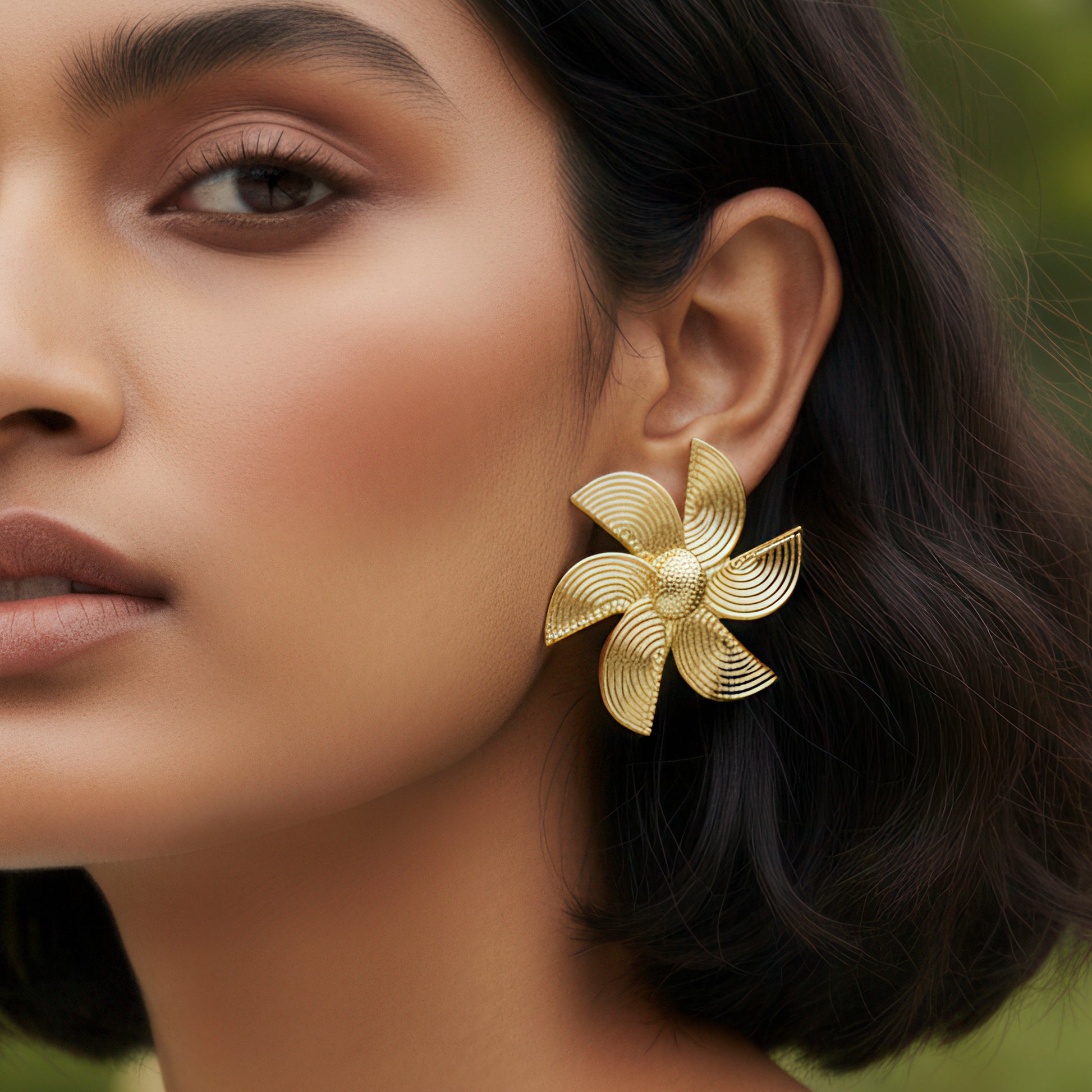 The exquisite fan-shaped design of these spectacular studs combines sophisticated sophistication with strong craftsmanship. They instantly stand out because to their wide, structural form, which also adds a distinctive touch to any ensemble. While the polished gloss guarantees a hint of classic appeal, their expertly made details add depth and texture. They are comfy and lightweight, which makes them ideal for all-day wear despite their striking design. These studs are perfect for people who like unusual jewelry because they can easily go with more formal wear or instantly dress up casual ensembles. They have a contemporary yet timeless appeal thanks to their adaptable design, which enables them to go from day to night with ease. An ideal piece to add flair and excitement without overpowering your overall look.
