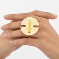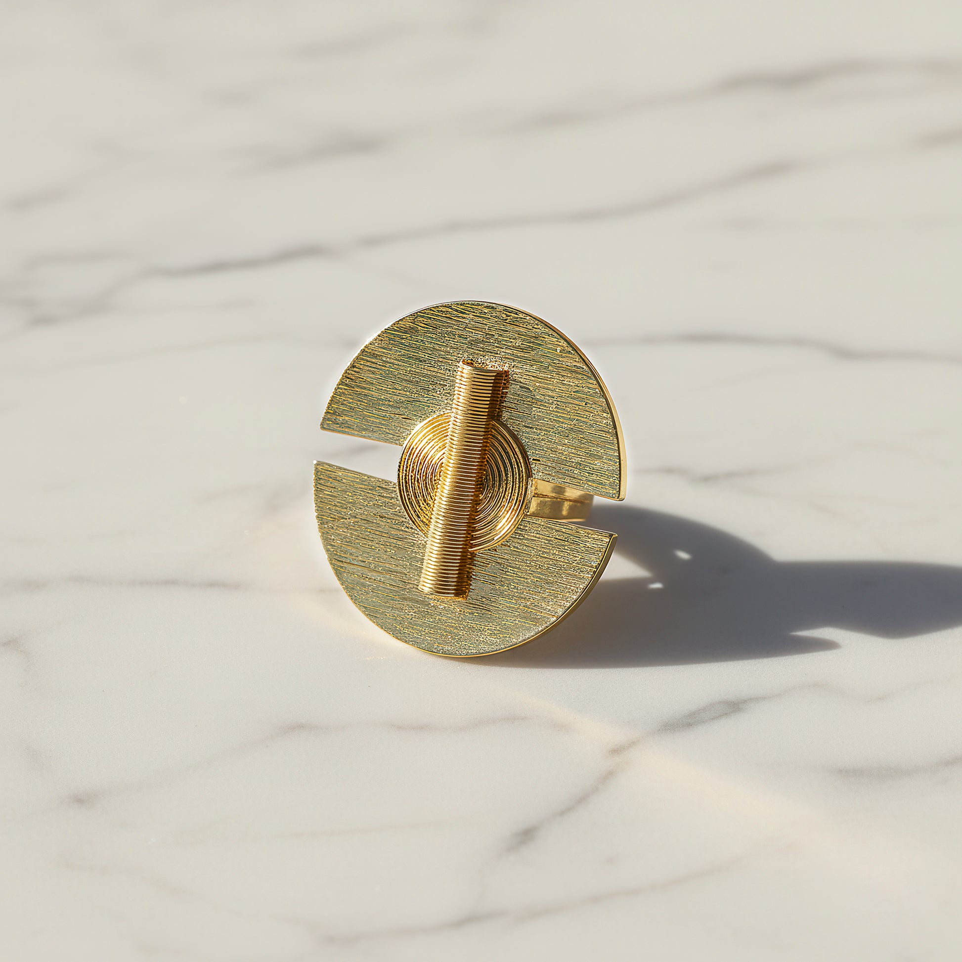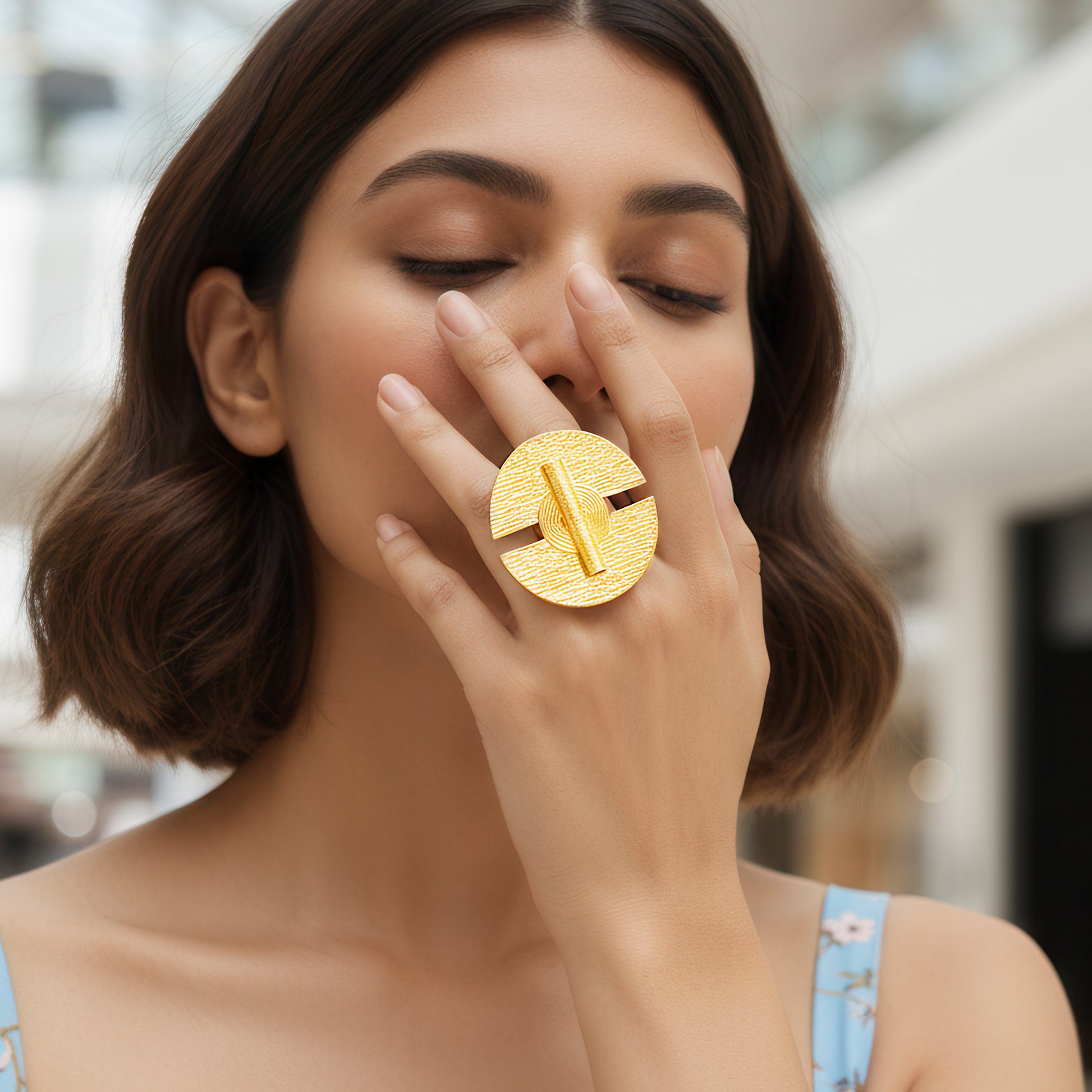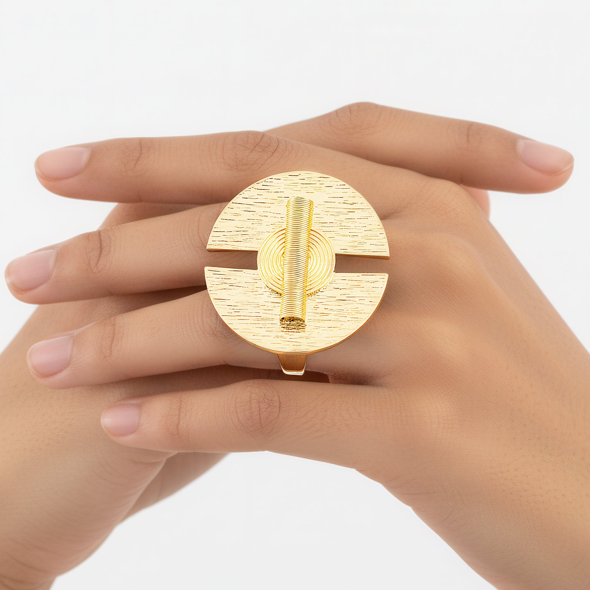 This ring's semi-circular statement shape adds a striking geometric flair while maintaining an understated elegance. The piece has a contemporary edge that appeals to those who enjoy one-of-a-kind jewelry because of the semi-circles' smooth curves, which harmoniously blend symmetry and current flair. Its simple yet eye-catching design makes it adaptable and goes well with both formal and casual settings. It adds a unique style without overpowering your attire and is comfy and lightweight. It gives a sophisticated artistic touch whether worn alone or stacked with other rings. This ring is ideal for people who enjoy accessories with geometric designs since it combines modern refinement with a stylish, original twist that is always noticed.