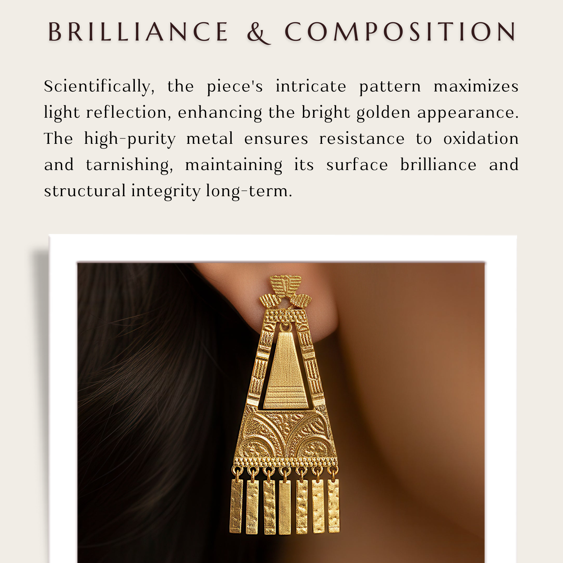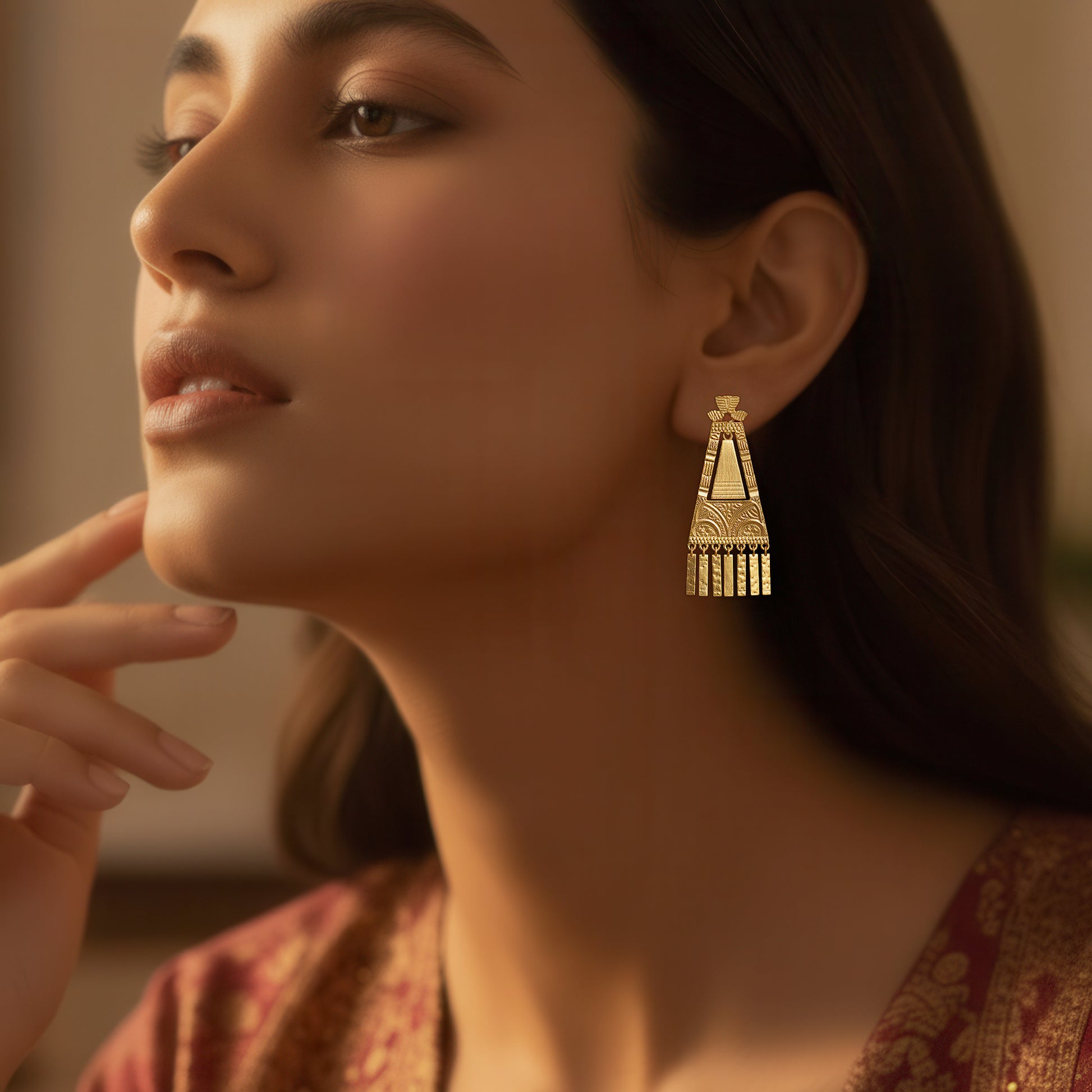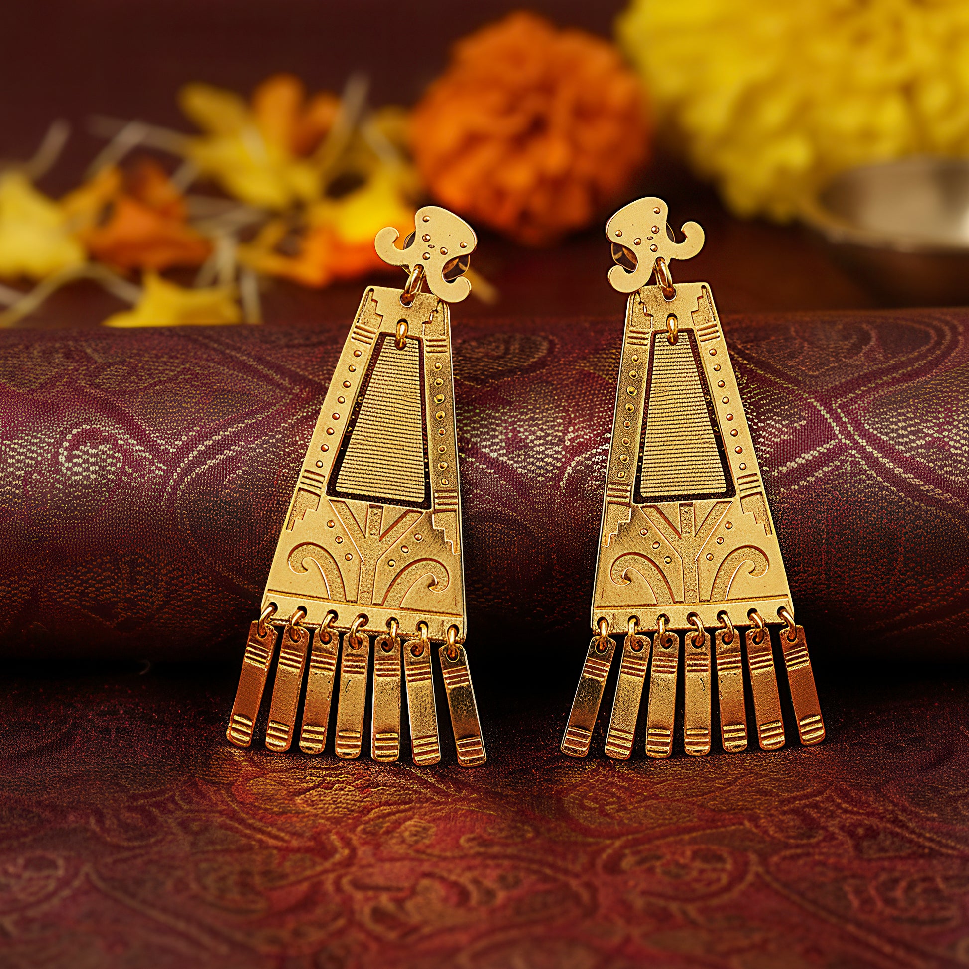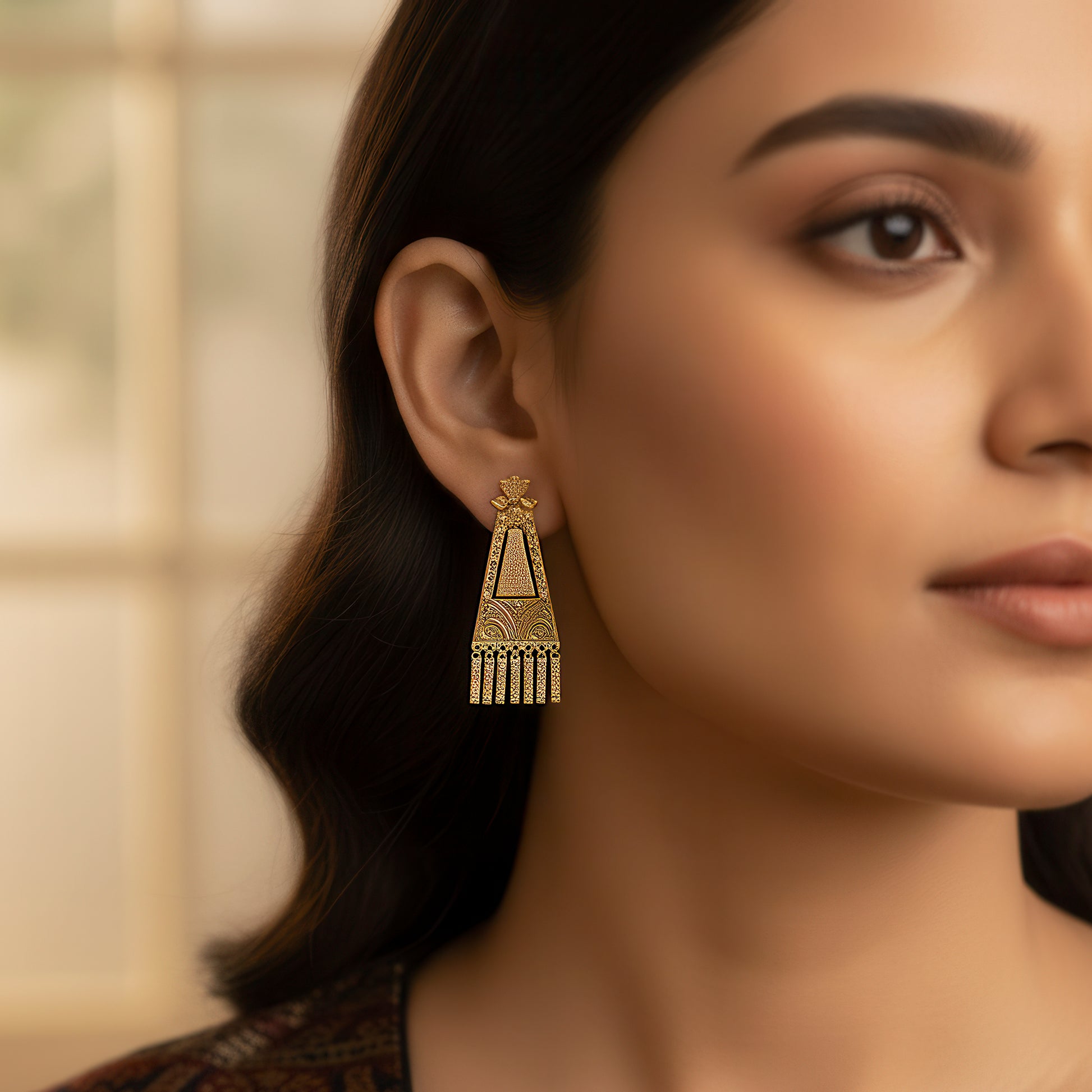 Delicate charms accentuate the ethnically inspired design of these exquisite long dangling earrings, which have a tapering form that radiates timeless appeal. They are a flexible accessory for a variety of settings because of their elegant design, which emphasizes classic artistry while keeping a contemporary edge. The charms give a delicate shine that effortlessly draws attention, and their elongated shape accentuates the neckline and creates a fluid flow with every movement. They are lightweight and stylish, making them ideal for cultural events, festive festivities, and incorporating a little bit of tradition into regular clothing. These earrings are a distinctive statement piece that effortlessly blends with both traditional and modern ensembles because they perfectly capture the charm of tradition mixed with modern elegance.