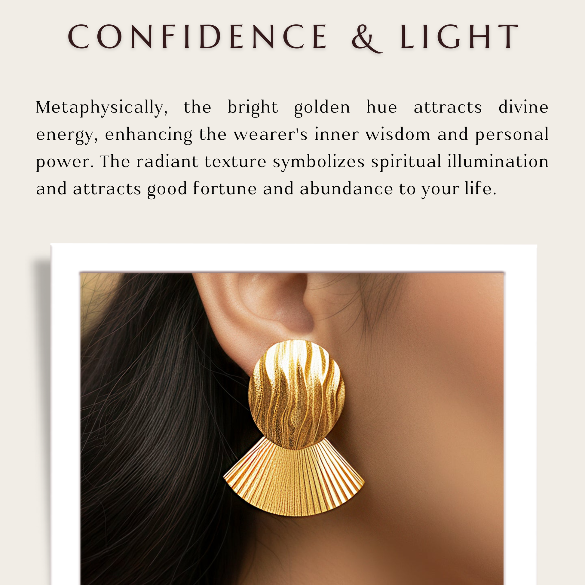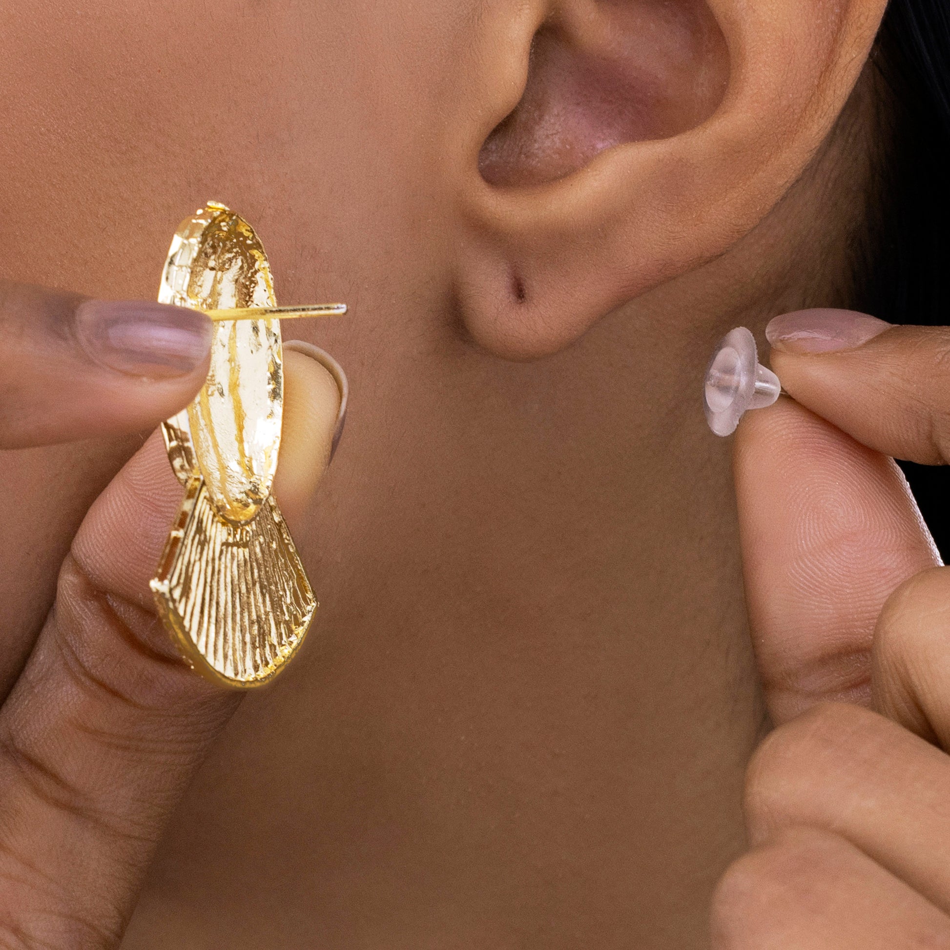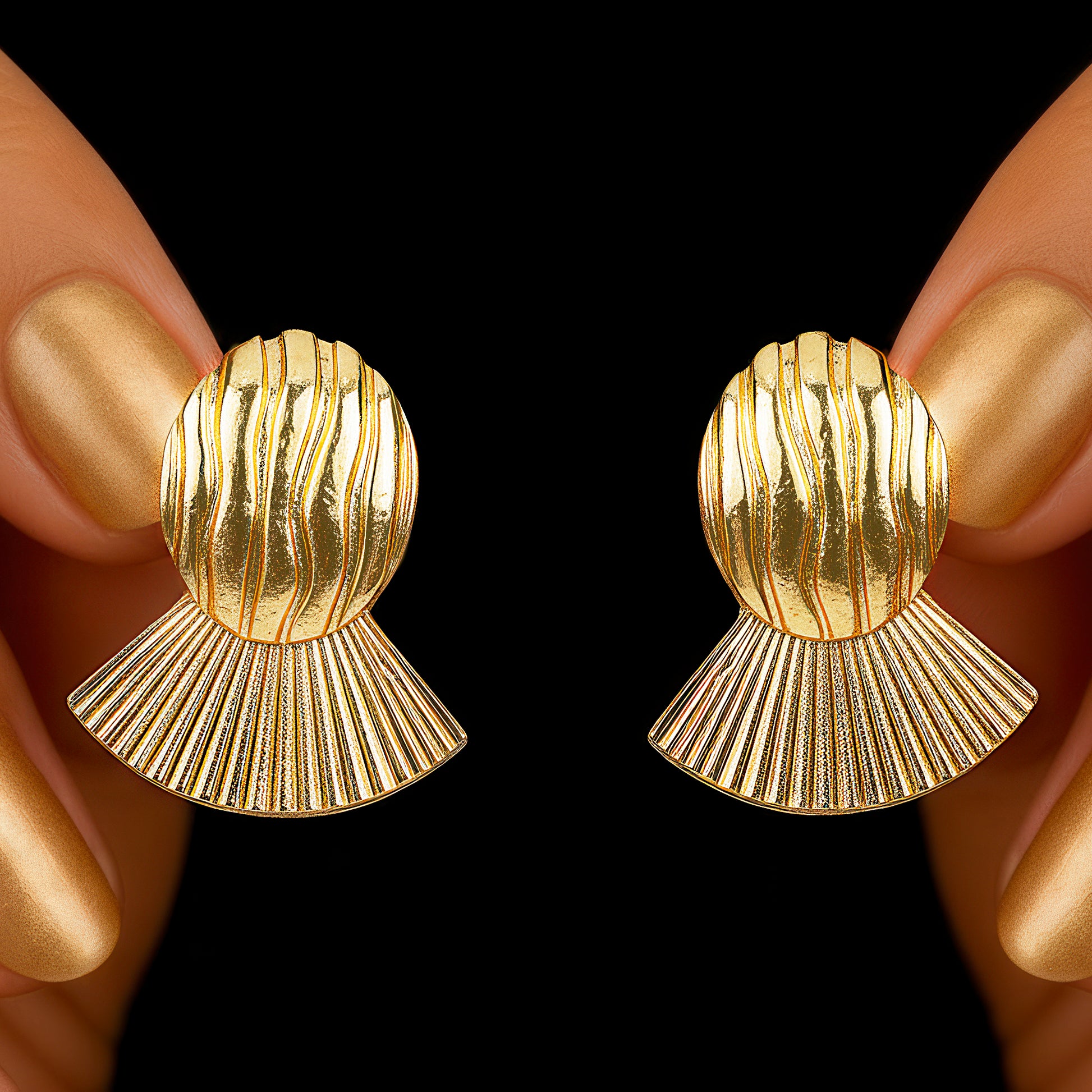 These striking earrings, which are textured oval and fan-shaped, are the epitome of bold creativity with a contemporary twist. They have a distinctive style that attracts attention right away because to the combination of long ovals and fan-shaped embellishments. With each movement, the rough surface wonderfully reflects light, adding depth and complexity. These earrings, which are made to stand out, combine sophistication and modern flair, making them appropriate for both formal events and fashionable daily wear. They guarantee comfort without sacrificing style because they are lightweight but effective. They offer a refined edge and creative touch whether worn with elegant evening wear or stylish casual ensembles. These earrings are perfect for people who enjoy bold, statement pieces since they provide a touch of sophistication to any ensemble while showcasing originality and self-assurance.