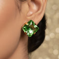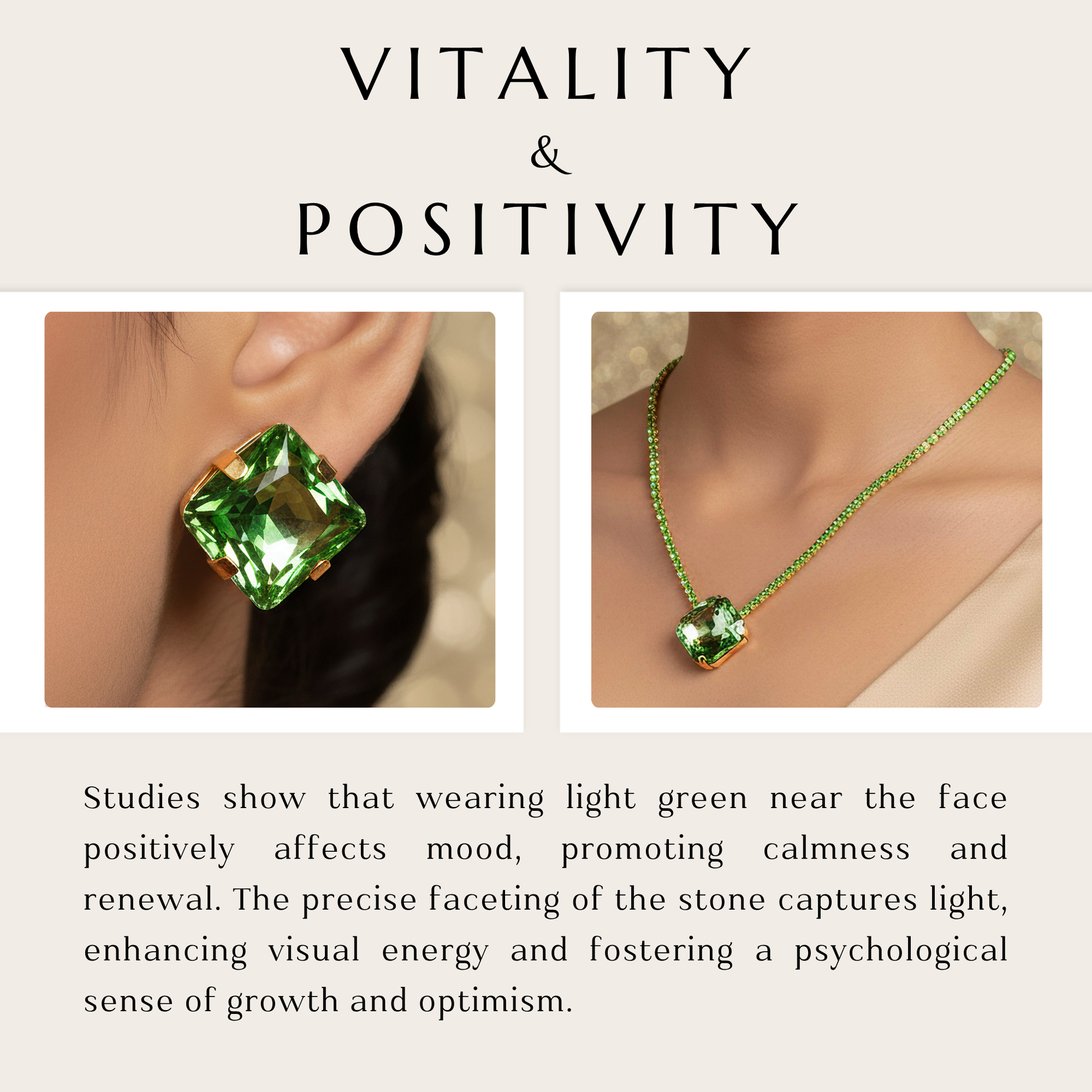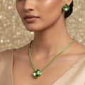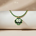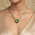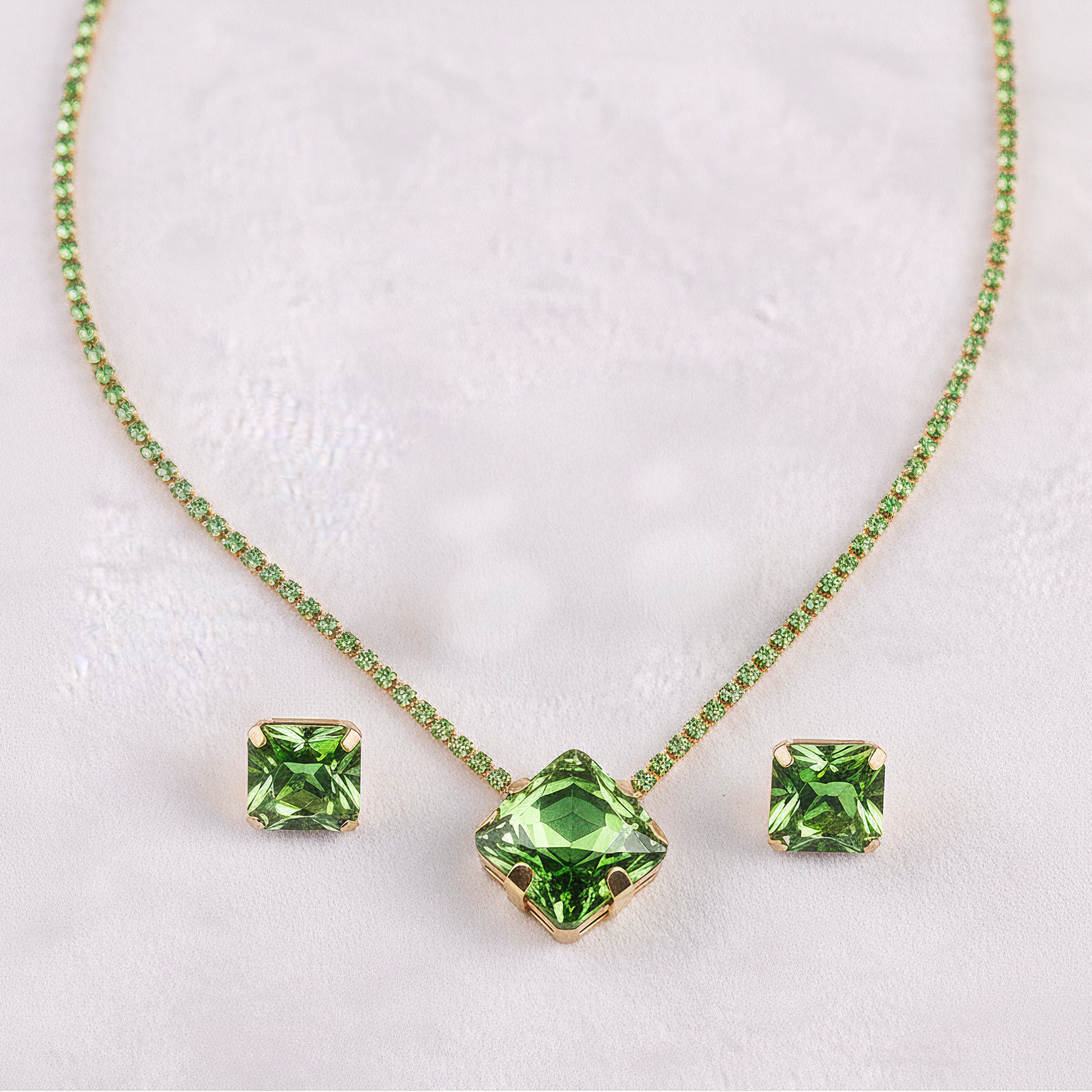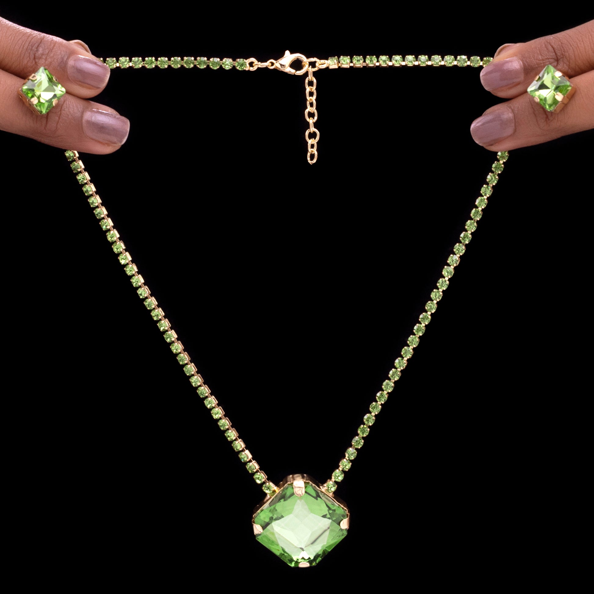 This large cushion-shaped peridot-set rhinestone chain pendant necklace draws attention with its lively and energizing charm. A cushion-cut crystal in a vivid peridot green, surrounded by glistening rhinestones that accentuate its glowing appearance, is the focal point of the arrangement. The pendant, which is tastefully suspended on a chain adorned with rhinestones, reflects light exquisitely, producing an opulent and striking effect. The combination is full and well-balanced for any occasion because it comes with matching earrings. This necklace set gives a distinctive splash of color and sophistication to both traditional and modern ensembles, making it ideal for weddings, festive festivities, or evening parties. For people who enjoy bold yet sophisticated jewelry, the vibrant peridot shade is a must-have statement item since it represents elegance and freshness.