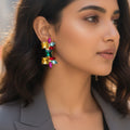 These spectacular earrings with a movable linear design and mixed shapes and colors add a whimsical yet creative touch to any outfit. The earrings' cascading arrangement of geometric forms in vivid hues, which draws inspiration from modern art, creates a dynamic movement that draws attention at every turn. The sculptures sway beautifully because to their mobile-like form, which adds elegance and rhythm. Their adaptability is enhanced by the striking color combination, which makes them appropriate for both festive occasions and informal get-togethers. They provide a stylish, modern style statement and are lightweight yet effective at framing the face. These earrings, which blend innovation, color, and balance into one eye-catching piece that quickly lifts any ensemble, are ideal for anyone who enjoy experimenting with fashion.
