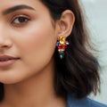A remarkable combination of geometry, color, and contemporary craftsmanship can be found in these multicolored, mixed-shape statement earrings with a mobile triangular pattern. They are made using a variety of striking colors and whimsical shapes, and their tumbling triangle arrangement produces a dynamic and sculpture-like silhouette. The earrings have a mobile-like look that catches light and adds fluidity with each step since each form moves individually. They stand out thanks to their vivid color scheme, which makes them ideal for celebrations, parties, or just adding individuality to regular outfits. They are bold yet lightweight, striking a mix between artistic charm and modern edge. These earrings, which are made to elegantly frame the face, are a multipurpose statement item for people who appreciate bold, imaginative, and vibrant fashion.