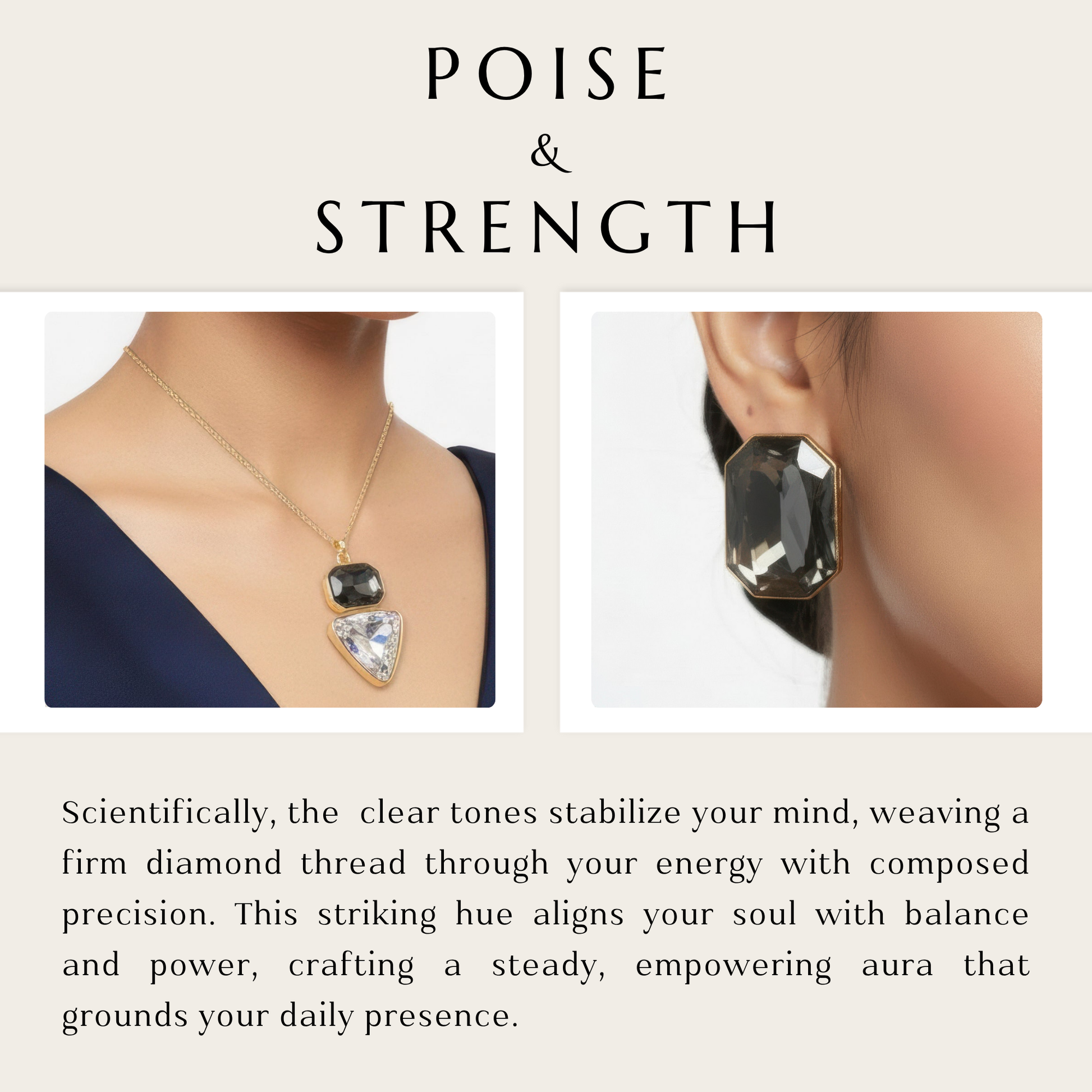 This pendant necklace features an eye-catching dual-shape design that combines the crisp elegance of a triangle with the tidy geometry of a rectangle. The crystals make a striking yet elegant statement because of their enticing crystal and black contrast. A beautiful blend of classic and modern design is achieved by the triangular pendant adding a contemporary edge and the rectangular stone radiating a timeless refinement. The pendant, which is elegantly suspended from a thin chain, gleams in the light, showcasing its smooth finish and faceted embellishments. This necklace exudes charm and adaptability, making it ideal for enhancing both formal and informal ensembles. It adds a touch of elegance and contemporary artistry to any ensemble, whether it is worn alone as a centerpiece or stacked with other items.
