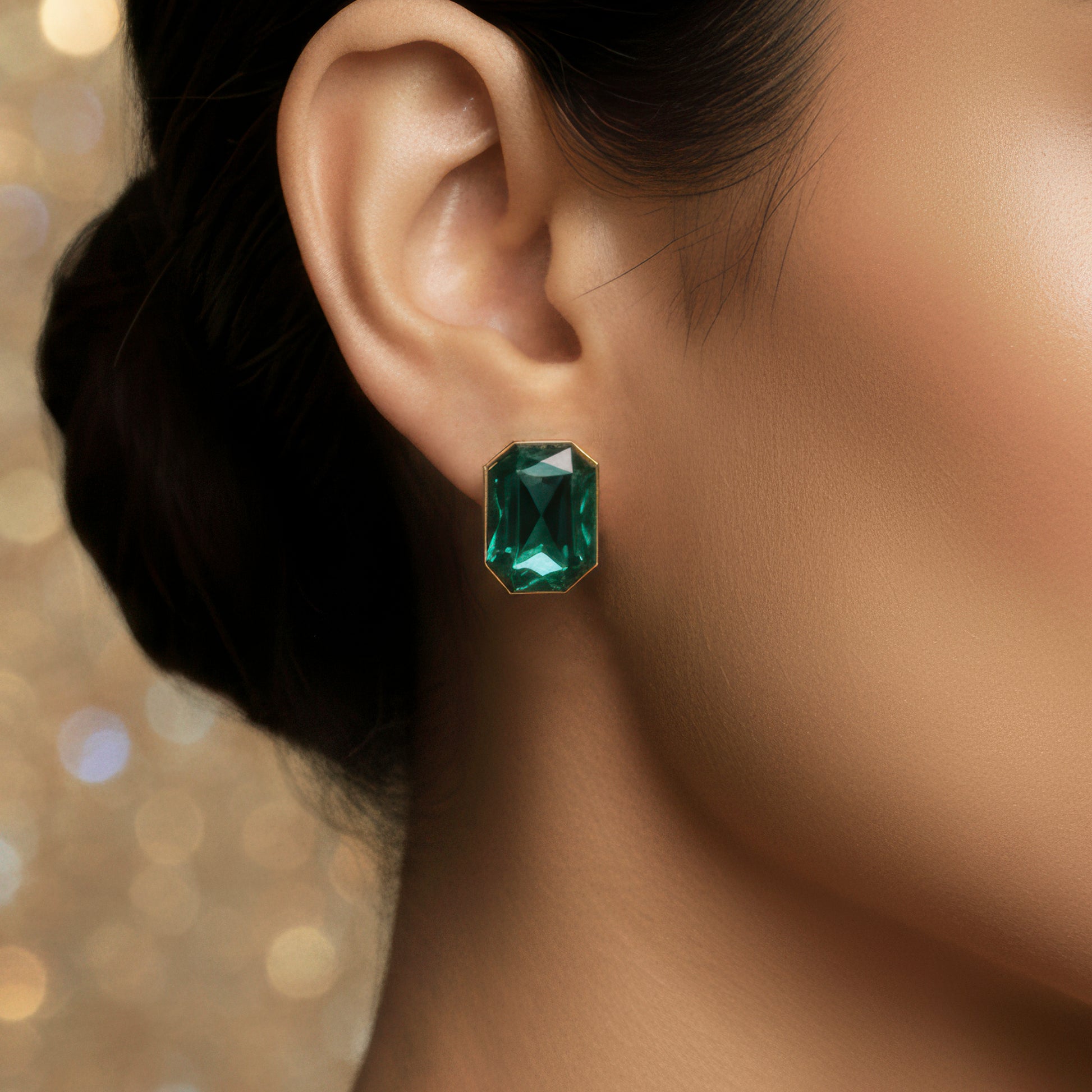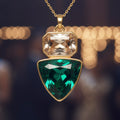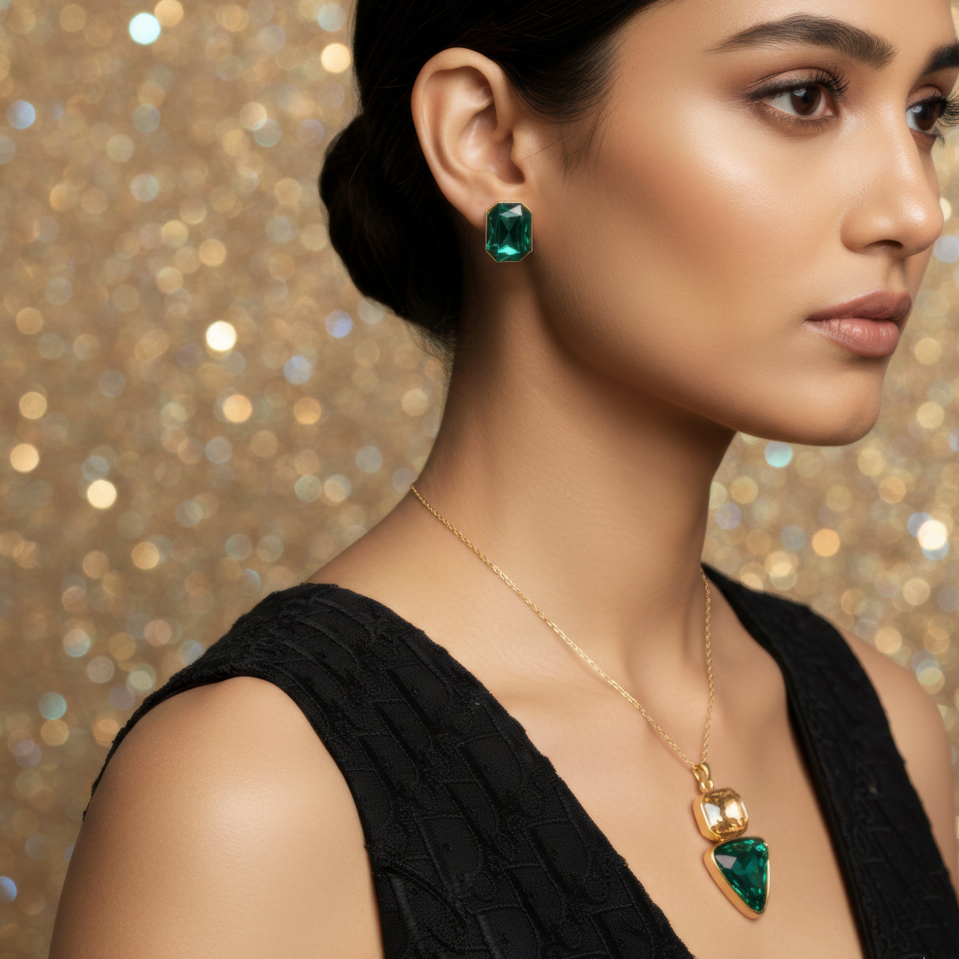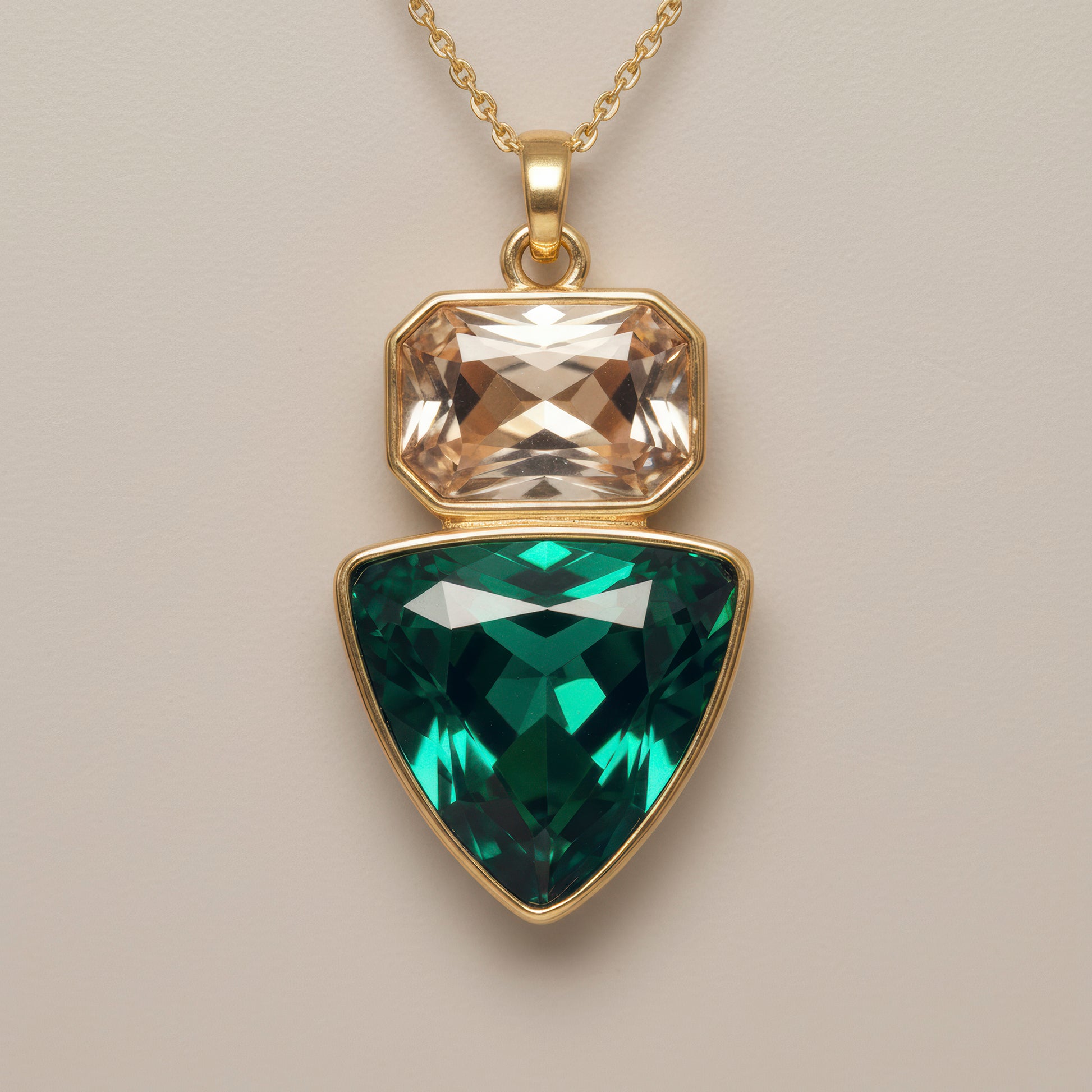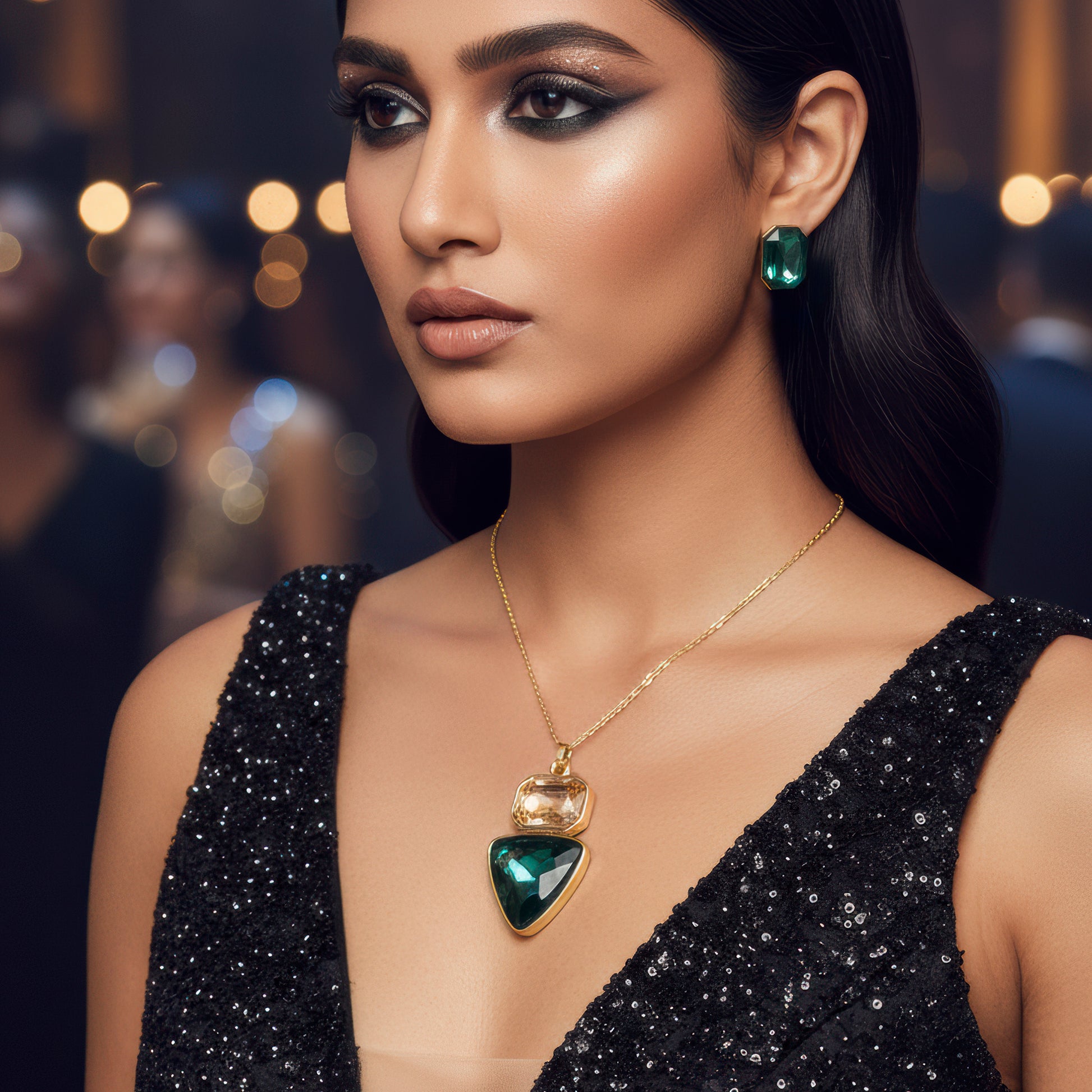 This pendant necklace combines the strong edge of a triangle with the smooth symmetry of a rectangle to create a sophisticated dual-shape design. The piece's brilliant champagne crystal and eye-catching emerald stone combine to create a sophisticated contrast that feels both opulent and modern. The design simply stands out thanks to the emerald's subtle depth and richness and the champagne crystal's warmth and sophistication. The pendant's faceted brightness and contemporary composition are highlighted by its stunning light reflection when it is suspended from a polished chain. It is a multipurpose item that enhances casual looks or goes well with formal wear. It adds classic charm and contemporary artistry either worn alone as a statement piece or layered for a stylish edge.