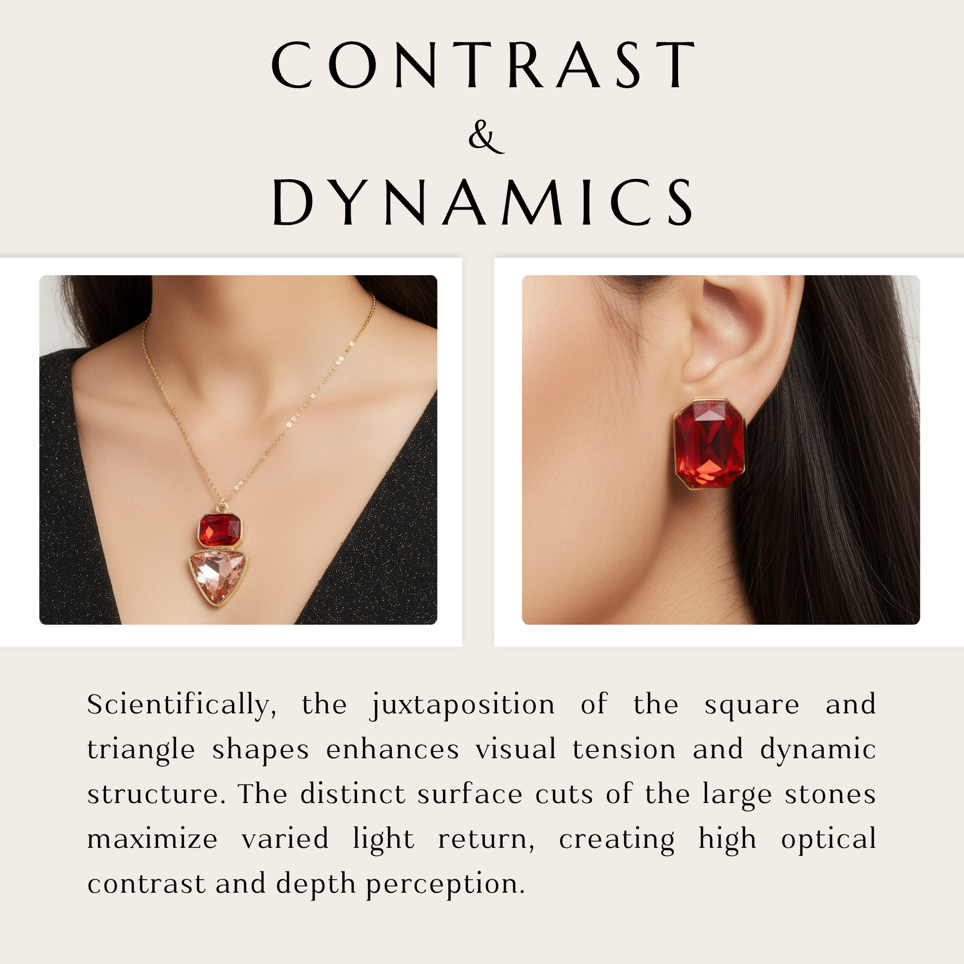 This pendant necklace's distinctive dual-shape design showcases an eye-catching blend of strong geometry and vivid color pairing. Sharp structure and classic beauty are combined in this piece, which features a sleek rectangle and an edgy triangle. The delicate light peach stone offers a gentle, feminine glow, and the brilliant Siam red crystal radiates strength and desire, making for a stunning contrast that effortlessly draws attention. The pendant's brilliance and contemporary appeal are enhanced by its ability to reflect light from all directions while hanging from a polished chain. This necklace is adaptable, fashionable, and expressive, making it ideal for bringing sophistication to evening attire or a striking touch to casual ensembles. It is elegant and makes a statement of originality, making it a valuable addition to any collection.