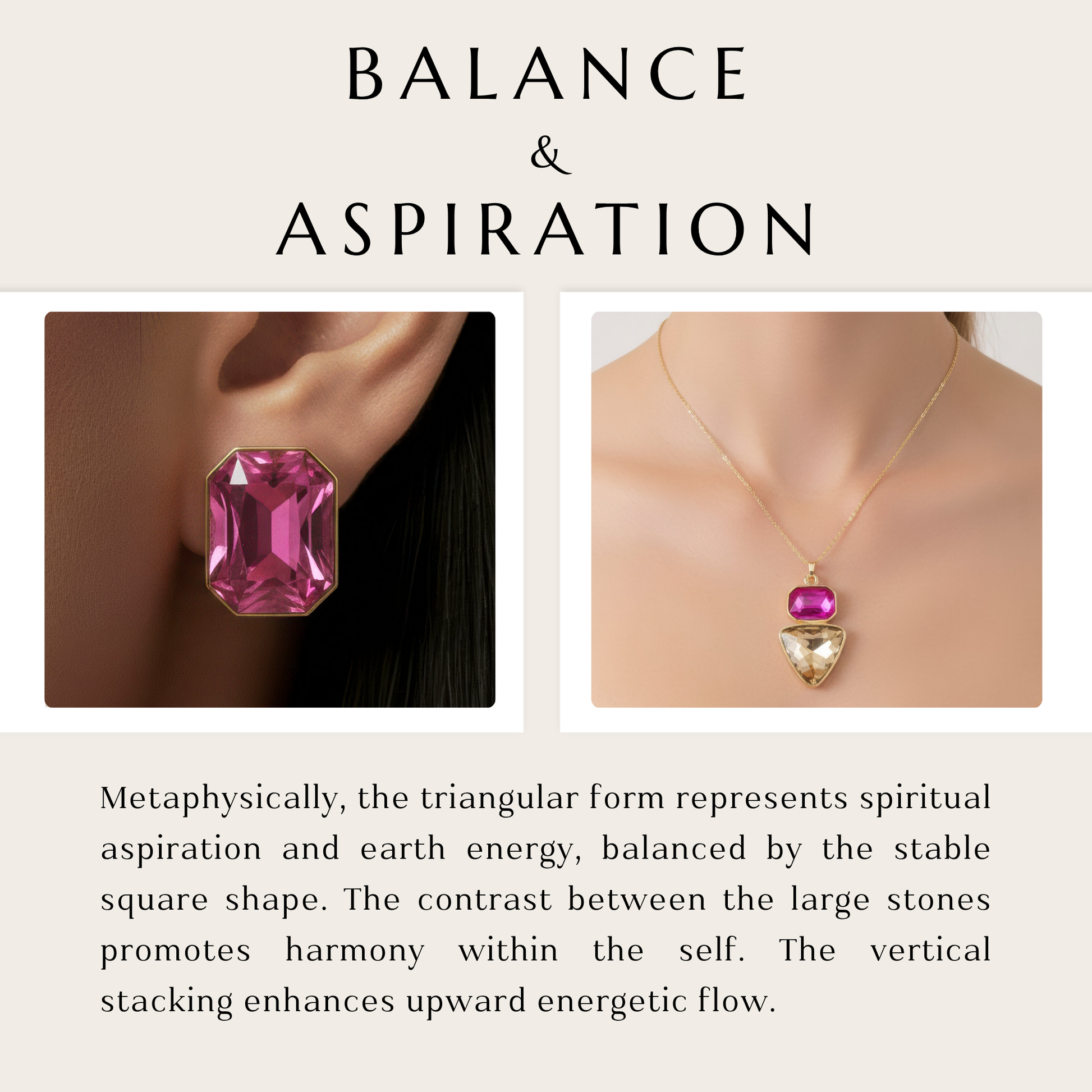 In order to create a powerful impression, this pendant necklace has a contemporary fusion of crisp geometry and seductive color contrasts. Two crystals in different shapes—a sleek rectangle and an angular triangle—combined harmoniously to provide a striking yet sophisticated silhouette in the centerpiece. A perfect combination of brightness and refinement is provided by the smokey crystal, which gives depth and mystery, and the brilliant fuchsia stone, which adds a burst of dynamic energy. The pendant's brilliance is enhanced by its ability to catch and reflect light while hanging elegantly on a polished chain. This necklace adds flair to everyday style and is perfect for special occasions and evening outings. It is a striking addition to any jewelry collection because of its distinctive shape and color play.