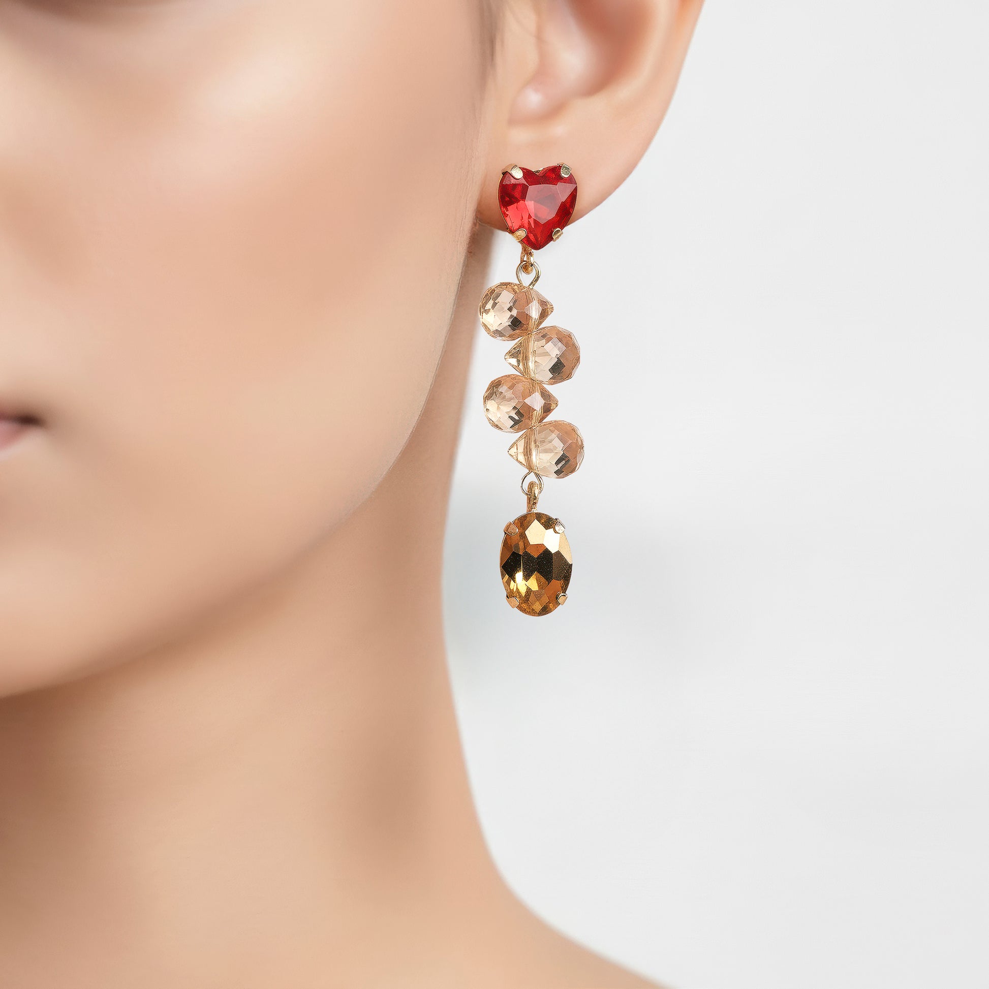These sophisticated earrings are the ideal statement piece for any event since they blend classic style with a contemporary twist. A dazzling red heart-shaped crystal, representing passion and charm, rests at the top and attracts attention right away. Delicate champagne-colored beads hang elegantly below, creating a subtle glitter that goes well with the striking red centerpiece. A gorgeously dangling opaque gold oval crystal completes the design, adding movement and elevating the earrings' overall attractiveness. They seem opulent and are lightweight and striking, making them easy to wear for extended periods of time. They combine well with both formal and celebratory attire because of their distinctive combination of rich gold, delicate champagne, and striking red. An enthralling composition that emphasizes uniqueness and refinement.