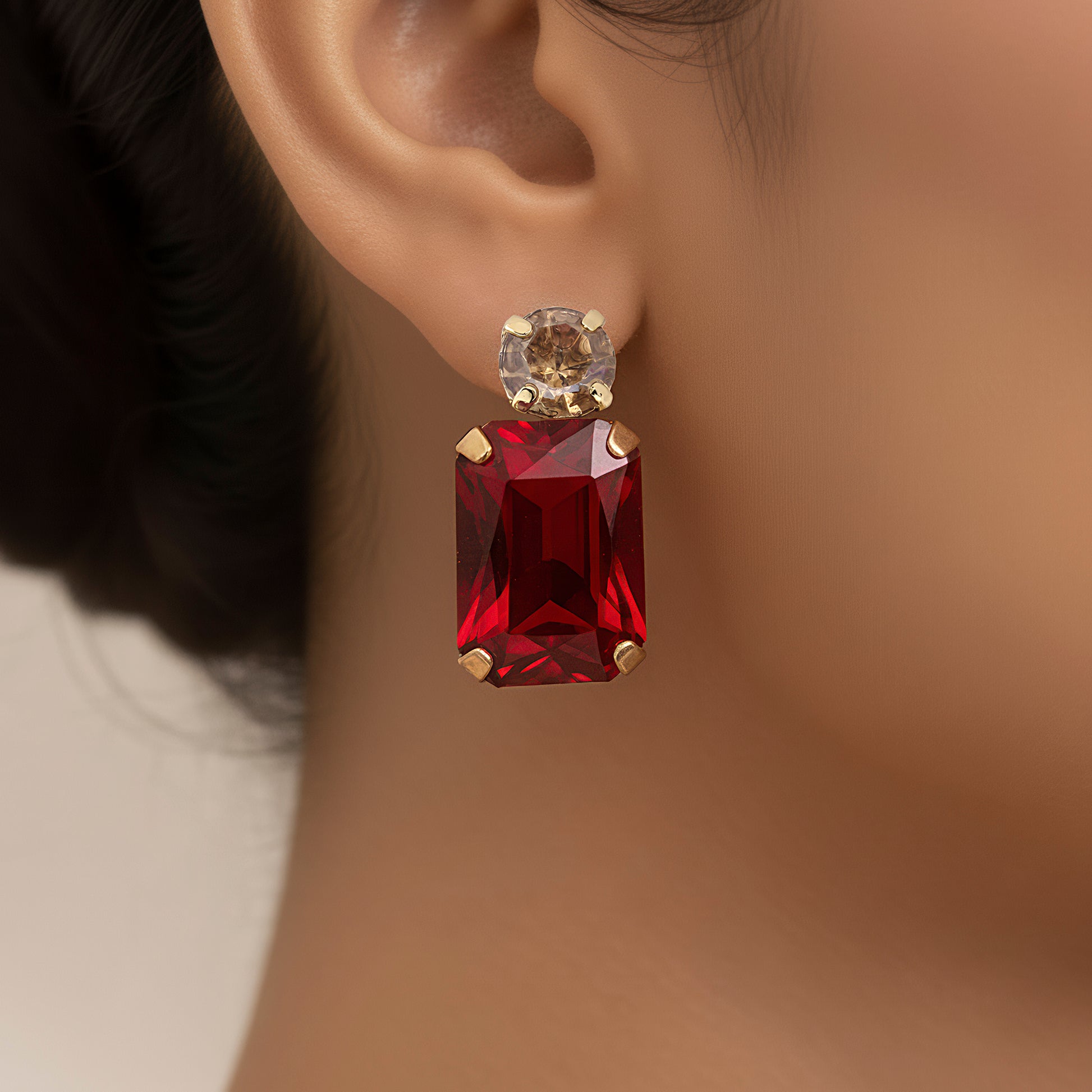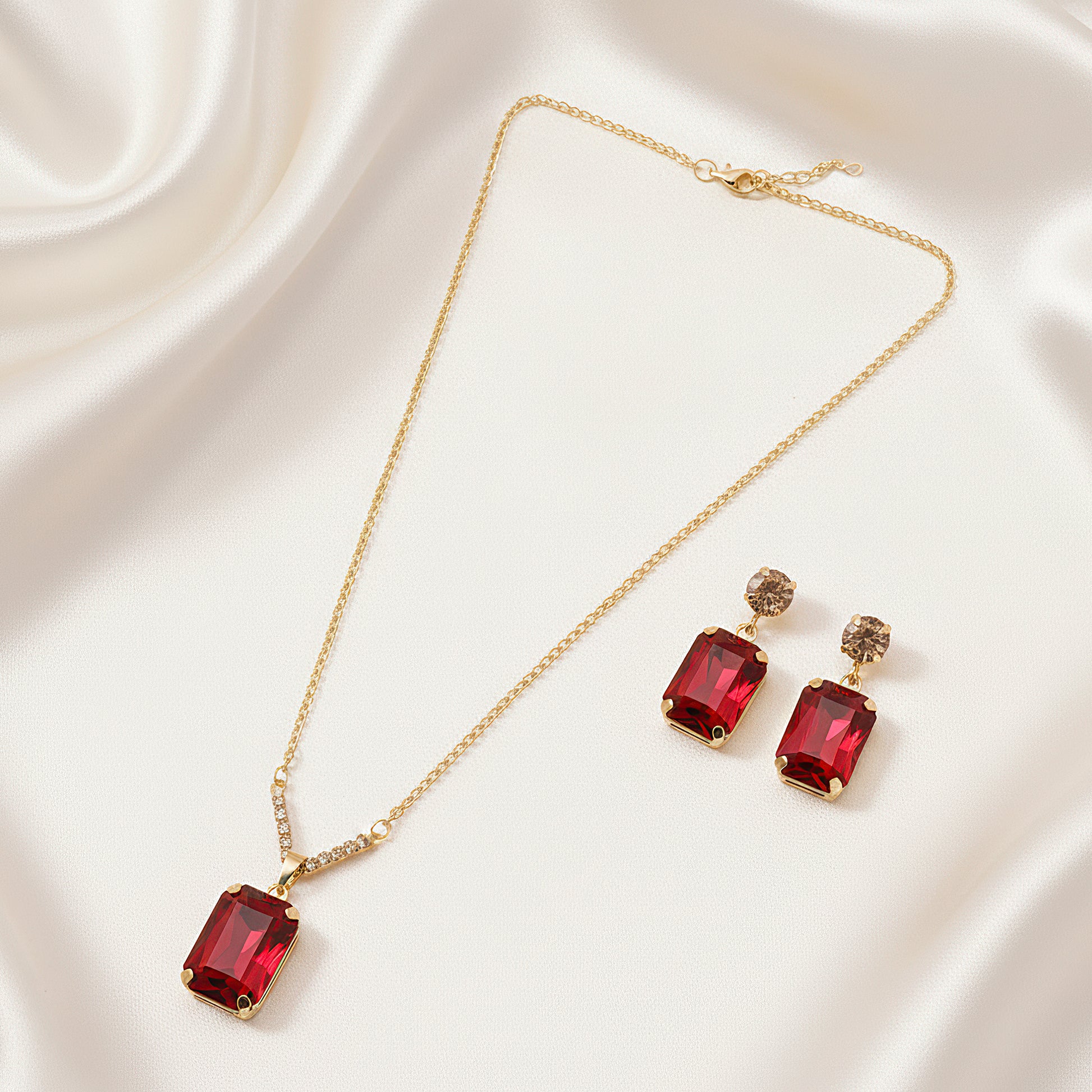 This sophisticated jewelry set is made to gracefully shine every event. A stunning pendant sits at the center of the necklace, which is framed exquisitely by a delicate V-shaped rhinestone chain. The pendant, which comes in Siam Red or Peach hues, effortlessly catches the light to produce a sophisticated and glitzy appearance. The set offers a well-balanced combination of refinement and charm when paired with matching earrings. It is lightweight and pleasant to wear, making it ideal for festive festivities, weddings, parties, and as a thoughtful present for a special someone. It is a versatile addition to any jewelry collection because of its classic style, which guarantees that it goes well with both traditional and modern ensembles. This combo is sophisticated, striking, and fashionable, and it effortlessly elevates any ensemble.