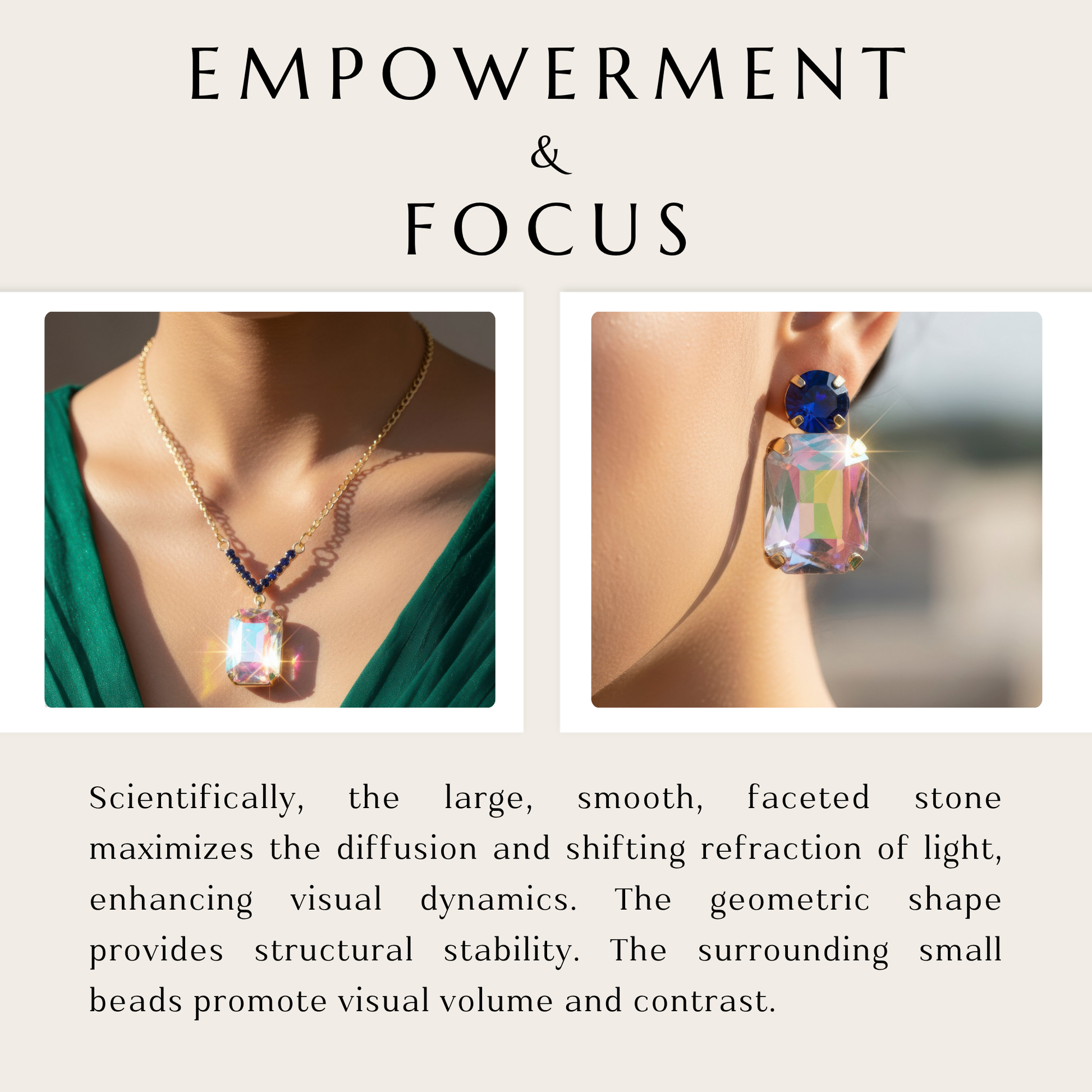 This gorgeous jewelry set is made to add elegance and sparkle to any ensemble. The necklace's elegant V-shaped rhinestone chain accentuates the neckline and leads to a striking emerald-cut pendant that commands attention. The pendant, which comes in vivid rainbow or rich blue sapphire hues, gives a dramatic splash of color and is ideal for both understated refinement and statement design. The set is completed with matching earrings, which provide beauty and balance to every ensemble. It guarantees comfort while keeping an opulent appearance because it is lightweight and portable. This adaptable set goes well with both traditional and contemporary apparel, making it perfect for weddings, celebrations, parties, or giving. It instantly elevates any ensemble with its classic style and glowing finish.