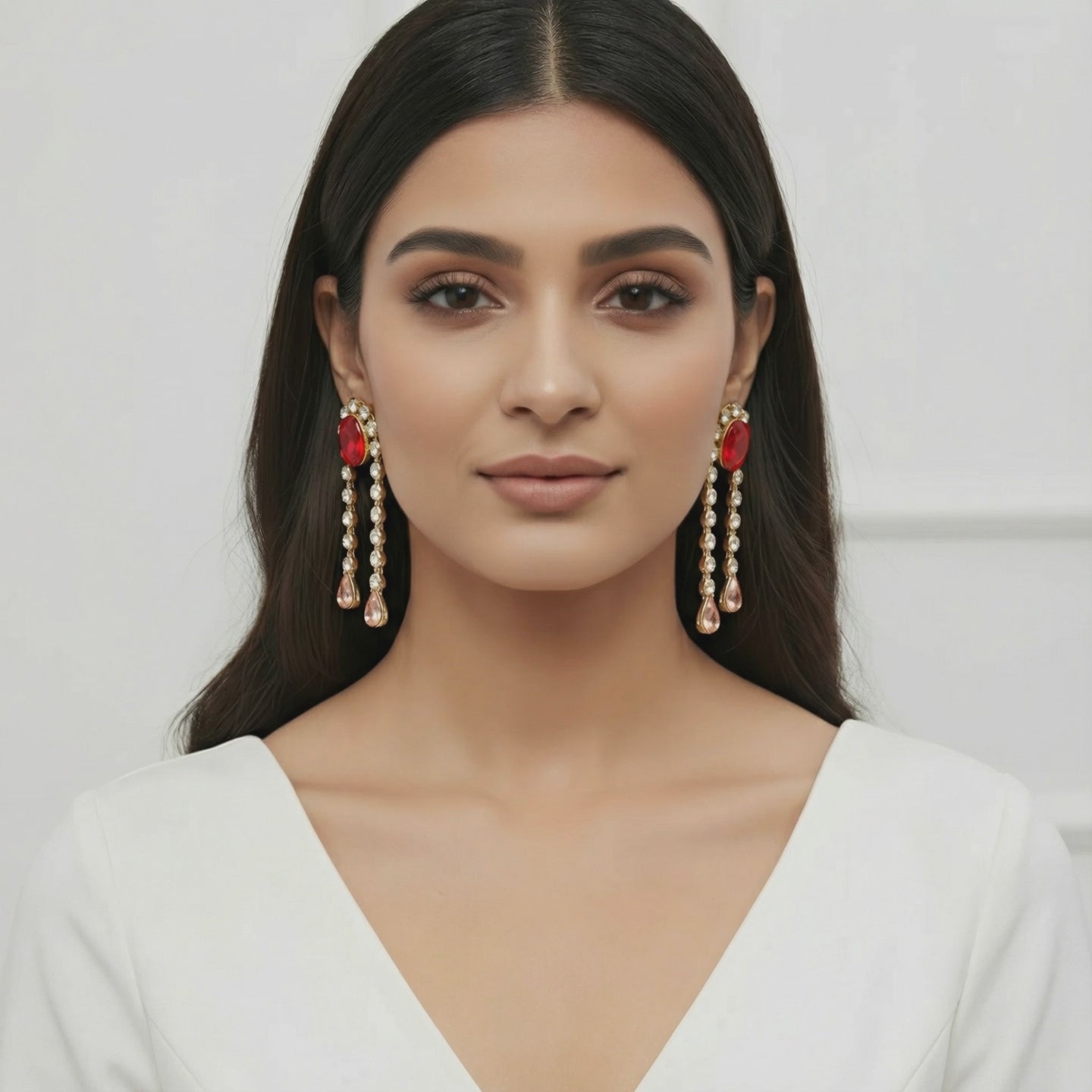 These geometric oval dangling earrings are modern yet classic, adding a touch of refinement to any ensemble. A delicate studded chain that adds texture and sparkle to the sleek oval frame makes for a dramatic contrast between flair and refinement. At the end, a drop-shaped crystal hangs elegantly, capturing the light with each movement. They combine modern style with a sophisticated finish, and they are lightweight and pleasant to wear. Perfect for combining with both western and traditional attire, these earrings complement casual appearances as well as evening ensembles. They are appropriate for celebrations, weddings, and parties due to their adaptable attractiveness. These earrings are a fashionable addition to any jewelry collection and a considerate present for anyone who appreciates a mix of traditional and trendy styles.