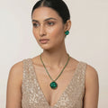 With its large round crystal in a vivid emerald hue, this exquisite jewelry set exudes classic elegance and sophistication. The matching earrings and pendant necklace are accentuated with a glistening rhinestone chain that offers a sophisticated glitter. The enormous crystal centerpiece is ideal for making a statement because it reflects light from all directions. This set effortlessly strikes a balance between striking design and elegant charm while remaining lightweight and pleasant to wear. It goes well with both traditional and modern attire and is appropriate for weddings, celebrations, and evening events. With its beautiful emerald shine, it symbolizes elegance, confidence, and timeless style. It is a flexible and striking addition to any jewelry collection and also makes a wonderful gift.