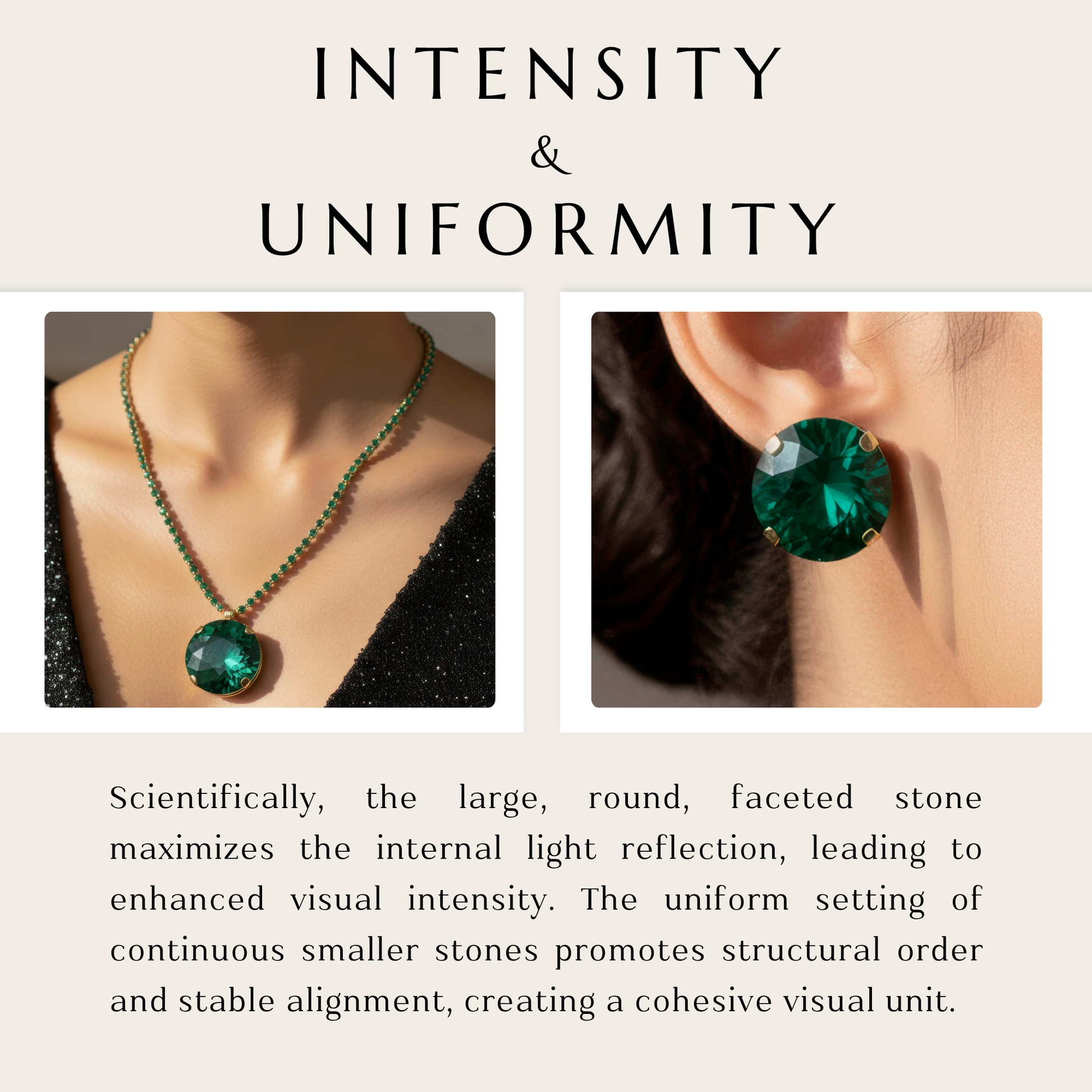 With its large round crystal in a vivid emerald hue, this exquisite jewelry set exudes classic elegance and sophistication. The matching earrings and pendant necklace are accentuated with a glistening rhinestone chain that offers a sophisticated glitter. The enormous crystal centerpiece is ideal for making a statement because it reflects light from all directions. This set effortlessly strikes a balance between striking design and elegant charm while remaining lightweight and pleasant to wear. It goes well with both traditional and modern attire and is appropriate for weddings, celebrations, and evening events. With its beautiful emerald shine, it symbolizes elegance, confidence, and timeless style. It is a flexible and striking addition to any jewelry collection and also makes a wonderful gift.