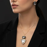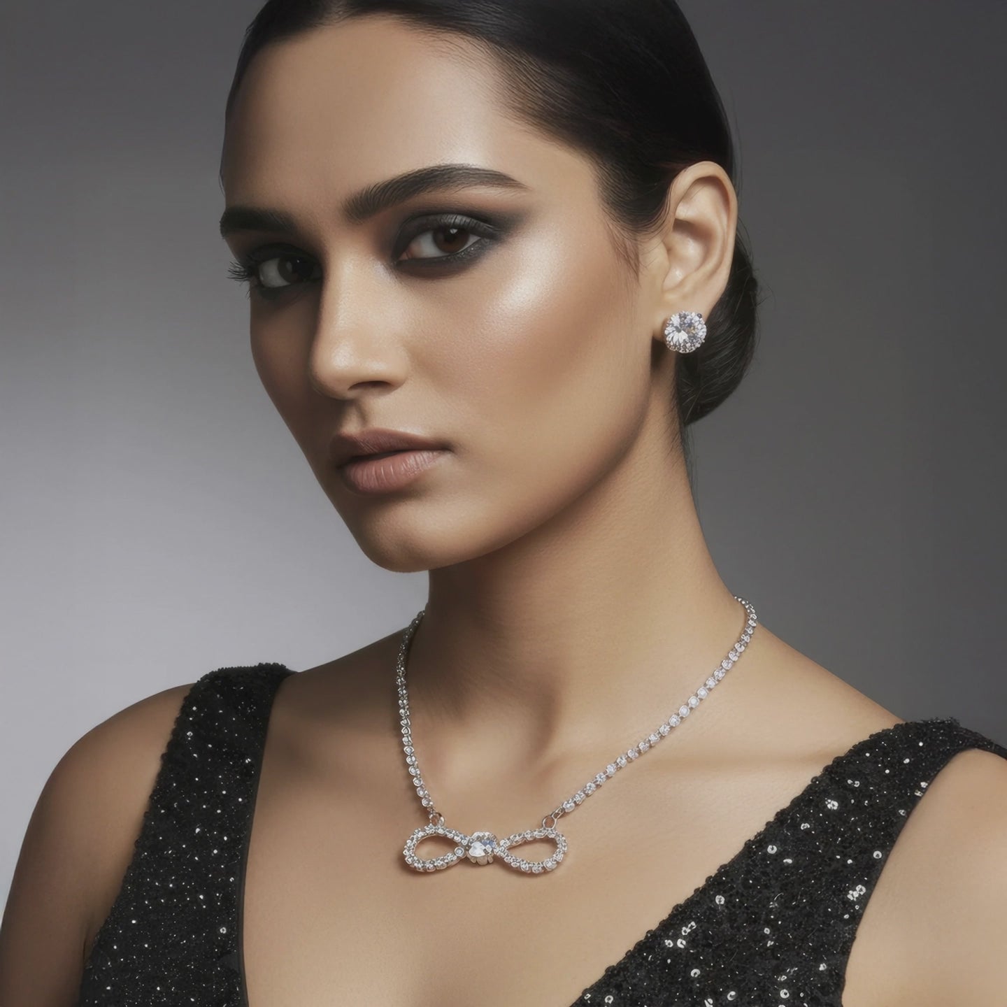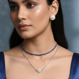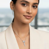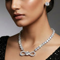 This rhinestone chain pendant set is a gorgeously created piece of jewelry that will add classic beauty to your collection. An infinity-shaped pendant with glittering crystals, representing unending possibilities and eternal love, is the focus. Every crystal is expertly positioned to capture and reflect light, providing a stunning sheen that subtly elevates your look. The pendant's sleek, lightweight shape is complemented by the elegant rhinestone chain, which is both comfortable for daily wear and eye-catching enough for exceptional events. This combination provides a comprehensive design that strikes a mix between sophistication and simplicity when paired with matching earrings. It goes well with both ethnic and western clothing, making it ideal for weddings, parties, anniversaries, and informal get-togethers. It adds elegance and charm to every occasion and is a lovely present.