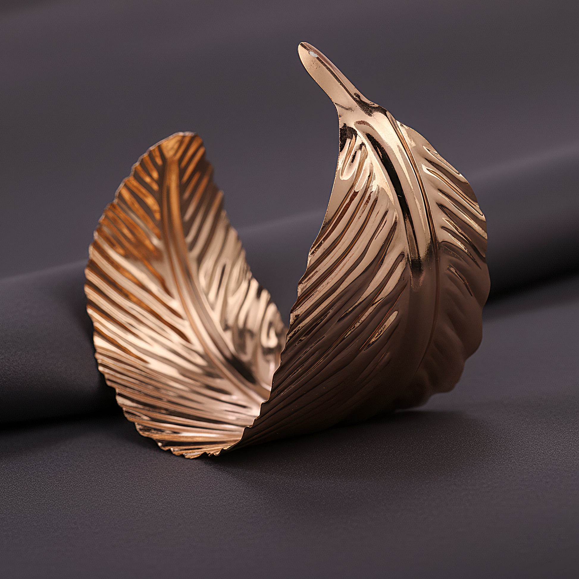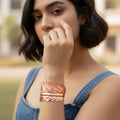 With its wide, textured leaf-inspired design, this exquisite rose gold cuff bracelet perfectly embodies the beauty of nature. It is a flexible accessory for every event because of the exquisite detailing, which strikes a lovely balance between refinement and charm. The wide cuff design is comfortable and lightweight for all-day wear, while making a striking impression. Because to its smooth inner finish, it fits wrist sizes of all kinds with ease. Its warm rose gold hue offers a contemporary yet classic charm that goes well with both formal and informal ensembles. This bangle adds a touch of refinement to your style and is a must-have for jewelry aficionados, whether it is worn alone as a headline piece or combined with other accessories.