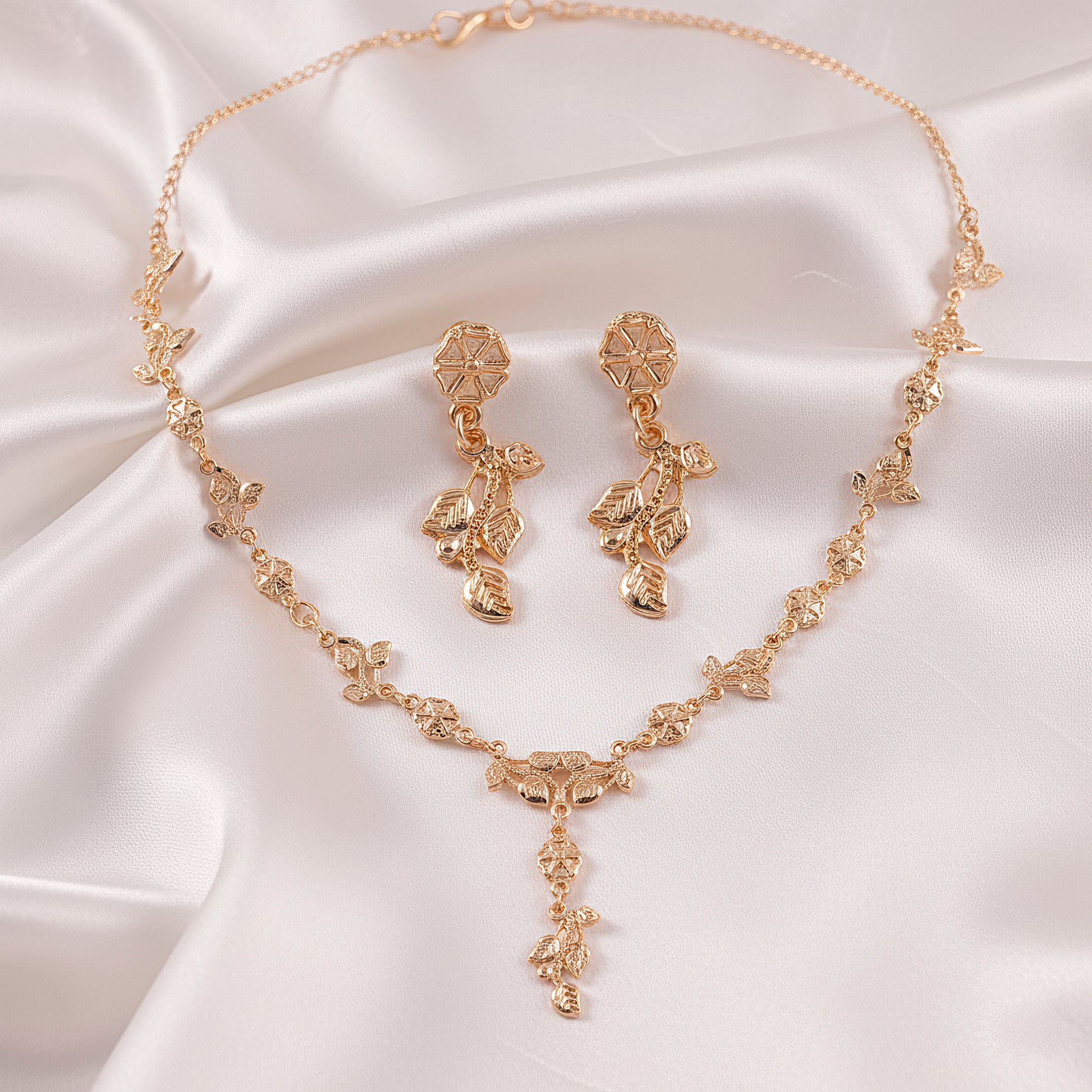 This rose gold necklace set has a sophisticated leafy pattern that exudes charm and sophistication, drawing inspiration from the delicate beauty of nature. The exquisitely designed necklace, with its leaf designs that perfectly combine contemporary design with classic elegance, hangs elegantly around the throat. The set produces a matched look that is eye-catching and adaptable when paired with matching earrings. Because of its comfortable lightweight design, it may be worn for extended periods of time at celebrations, weddings, and parties. Its delicate rose gold finish enhances warmth and a sophisticated sheen, going well with both classic and modern ensembles. This jewelry set easily improves your appearance, whether it is used as a striking accent to regular clothing or as a statement piece for special events.