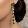 This necklace set is sophisticated and alluring, with a single-line chain exquisitely adorned with glistening emerald stones that exude a timeless, rich charm. The elegant design adds a refined glitter to any ensemble while showcasing the emeralds' inherent brilliance. The combination features a lovely flow that beautifully balances the neckline and face when worn with matching long earrings that dangle. This jewelry set skillfully combines traditional artistry with contemporary appeal, making it ideal for joyous festivities, weddings, parties, or sophisticated evenings. Its lightweight design guarantees comfort for prolonged use while preserving an opulent appearance. This set is a versatile item that adds sophisticated splendor to both ethnic and modern ensembles since the deep green tint of the emeralds represents refinement and class.