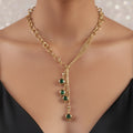 With its slender capsule chain, this Y-shaped necklace set is both elegant and modern, adding a modern twist to traditional jewelry designing. Sparkling emerald crystal accents give the necklace a deep green glow that represents elegance and refinement. Its Y-shaped drop design highlights the neckline, making it the perfect addition to formal gatherings, evening wear, and celebrations. The combination instantly elevates any ensemble when paired with matching earrings, creating a flawlessly balanced and harmonized look. It is comfortable to wear and lightweight, allowing for all-day elegance without sacrificing style. This jewelry set's distinctive combination of brilliant emerald detailing and minimalist design makes it an adaptable addition to any collection, lending it both timeless charm and contemporary flair.