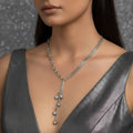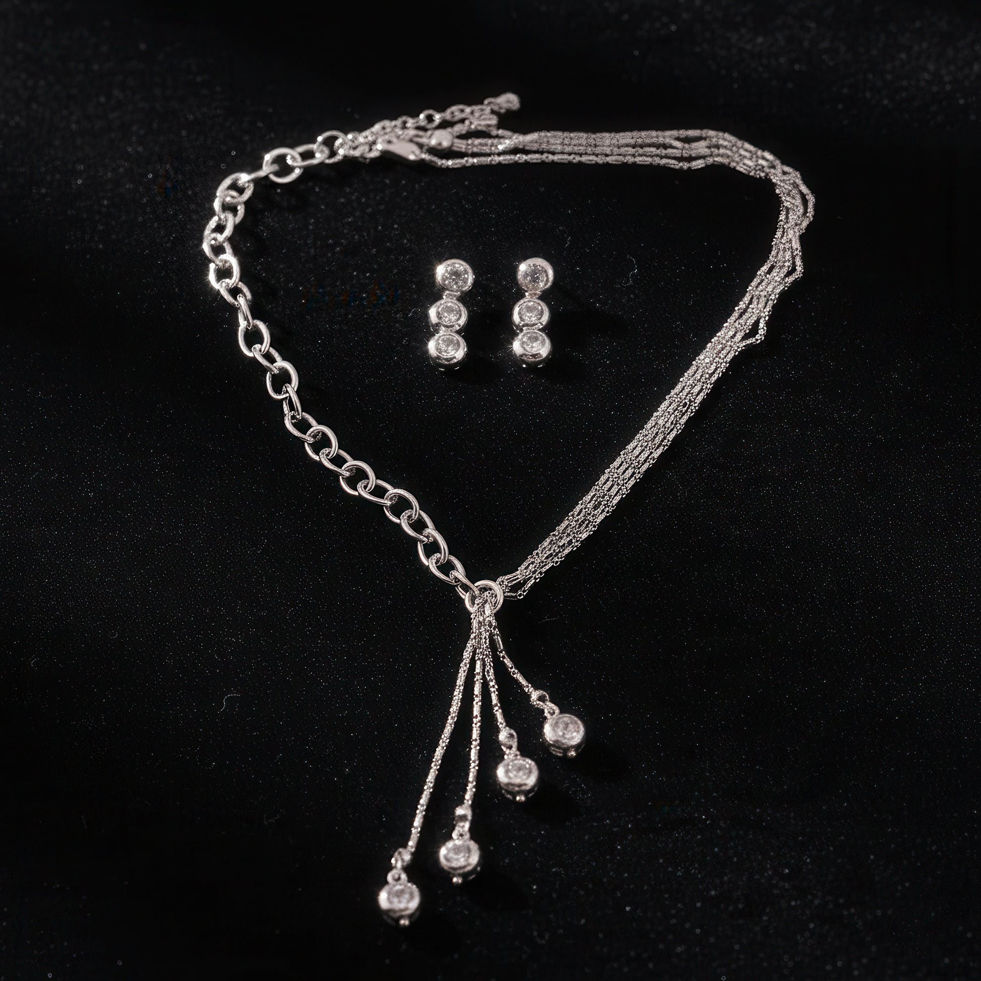 This Y-shaped necklace set is stylish and up to date, with a sleek silver chain in the shape of a capsule that radiates contemporary refinement. Subtle crystal accents give the chain a sophisticated glitter that heightens its sophisticated appeal. The elegant silhouette created by the Y-shaped drop directs attention to the neckline, making it ideal for formal events, parties, and evening wear. The set creates a refined and well-coordinated appearance that goes well with both traditional and western clothing when paired with matching earrings. Long hours of comfort are guaranteed by its lightweight design, which also preserves the opulent finish. This set's versatility and style allow it to be worn as a statement piece or layered with other items for a chic look. A must-have jewelry set that blends brilliant highlights with understated elegance.