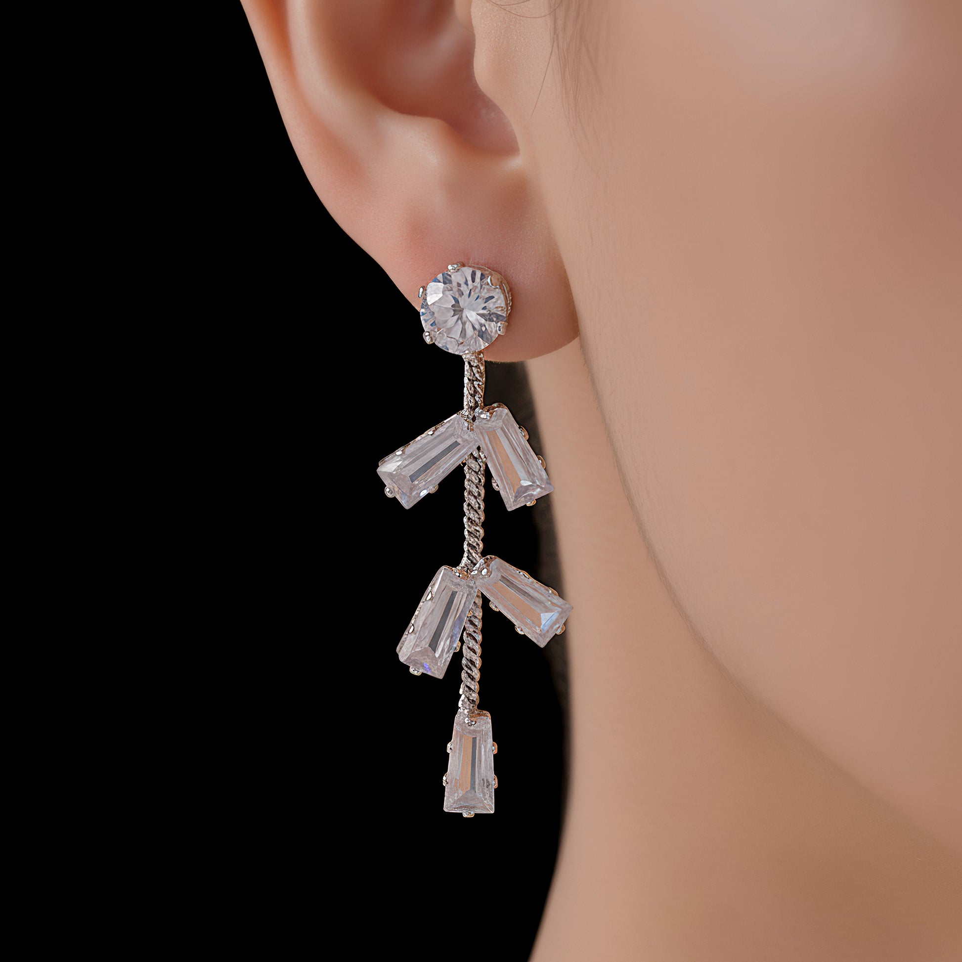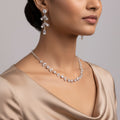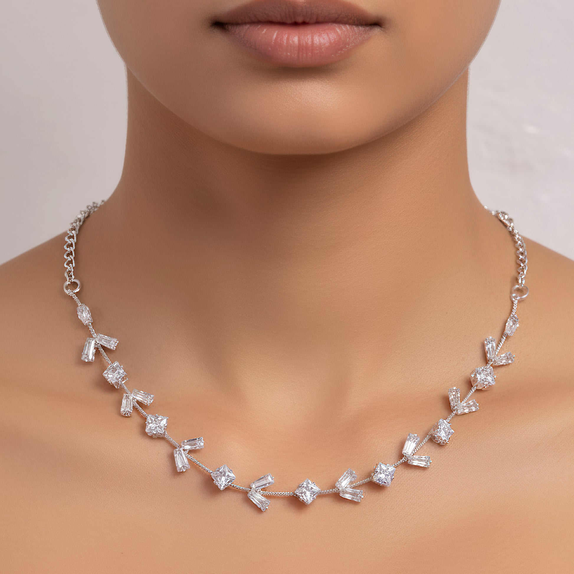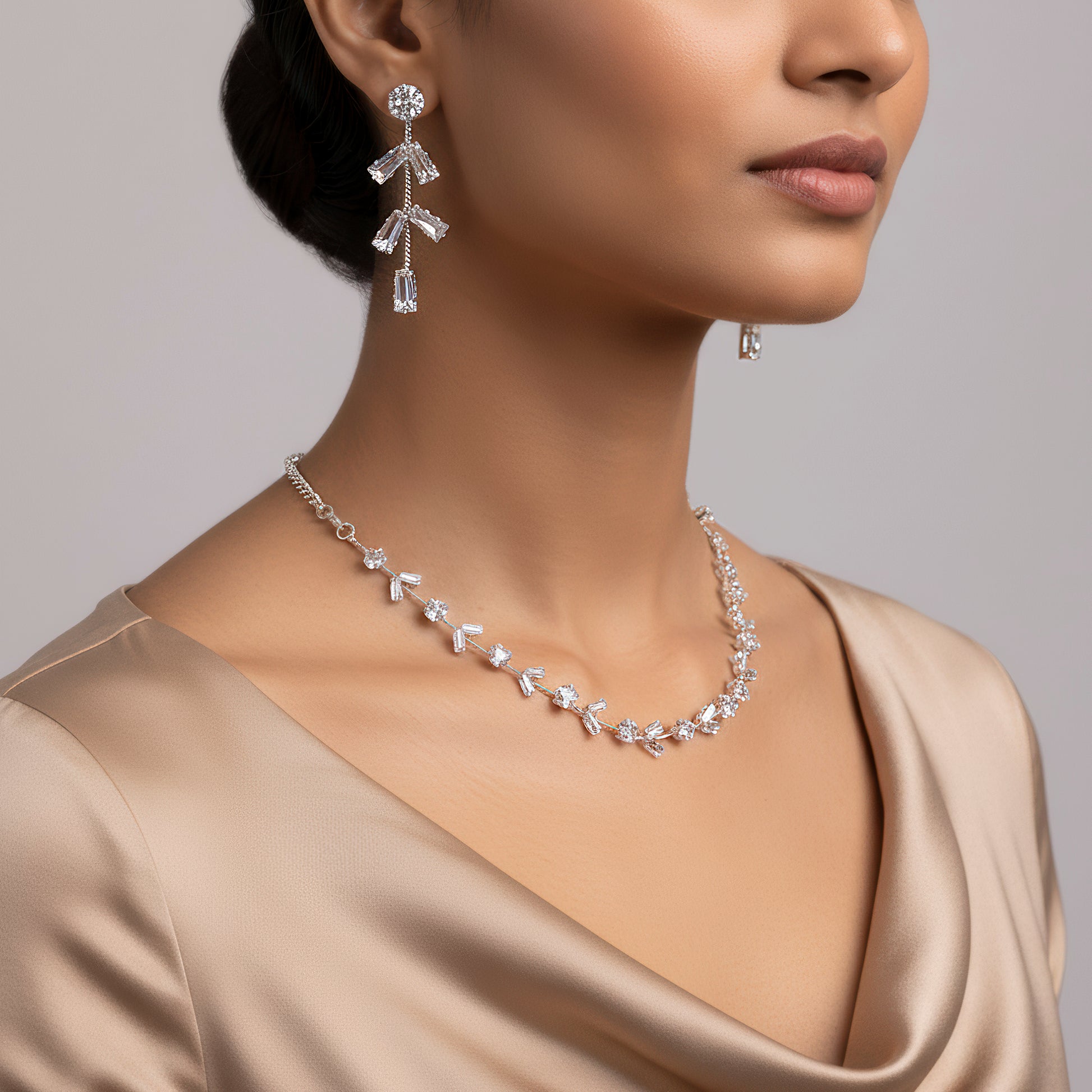 The necklace in this stunning jewelry set is embellished with baguette and square white crystals that are precisely spaced to produce a sophisticated and attractive appearance. The dazzling gems add sparkle and sophistication to any ensemble by catching the light from all directions. Matching earrings that mimic the geometric crystal design complete the necklace, providing a tasteful and fashionable look. The lightweight pieces, which are designed to be both comfortable and glamorous, are perfect for wearing all day, whether for nighttime events, parties, or special occasions. This set's adaptable style makes it easy to mix with everything from stylish formal attire to modern casual ensembles. This line radiates classic elegance and contemporary charm, making it ideal as a thoughtful present or a striking addition to your personal collection.