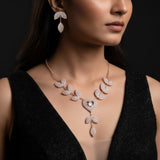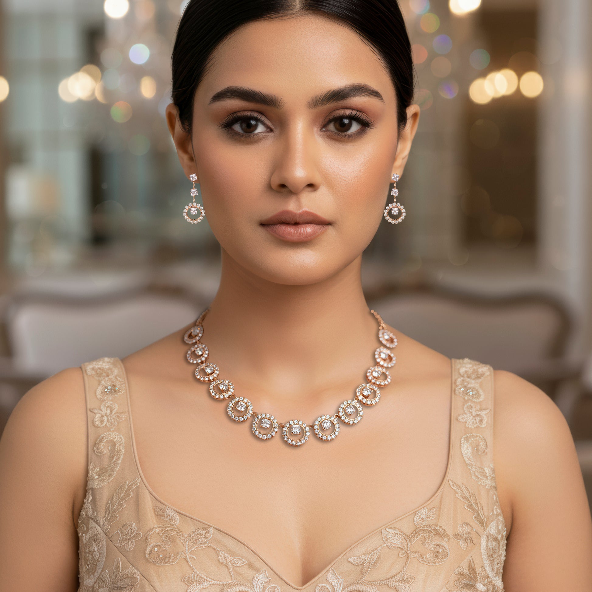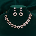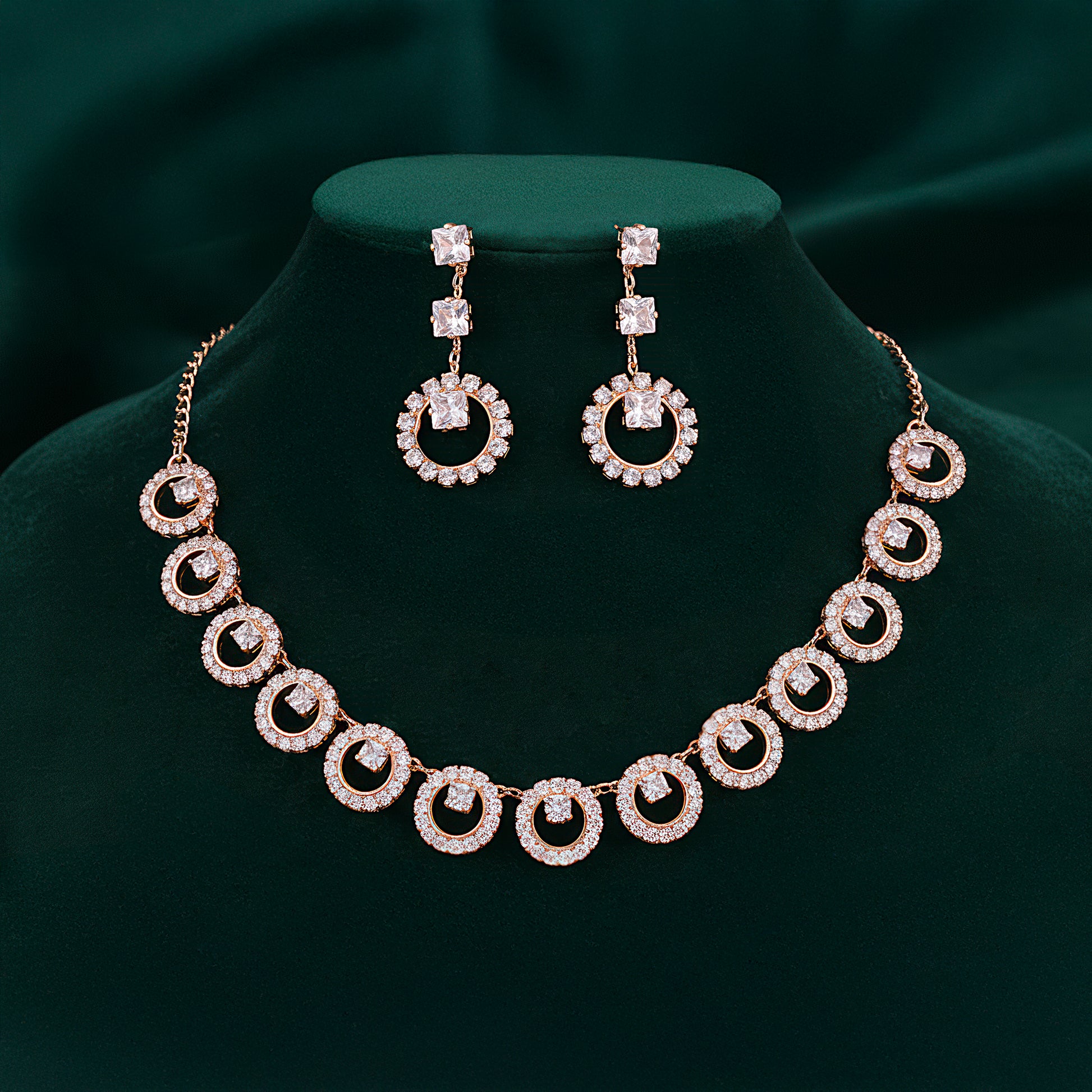 The brilliant rhinestone chain necklace in this sophisticated jewelry set has exquisitely placed round accents that give it a contemporary and striking look. The elaborate rings spectacularly catch the light, giving every ensemble a dash of refinement and glitz. Matching earrings that reflect the circular design complete the necklace, creating a unified and fashionable ensemble. The outfit is ideal for special occasions, parties, nighttime gatherings, and all-day wear because it is comfy and lightweight. Its adaptable style makes it a must-have addition to any collection since it goes well with both formal and casual settings. This set, which blends classic shine with modern design, is perfect for giving or treating yourself. It will add elegance and charm to your look.