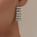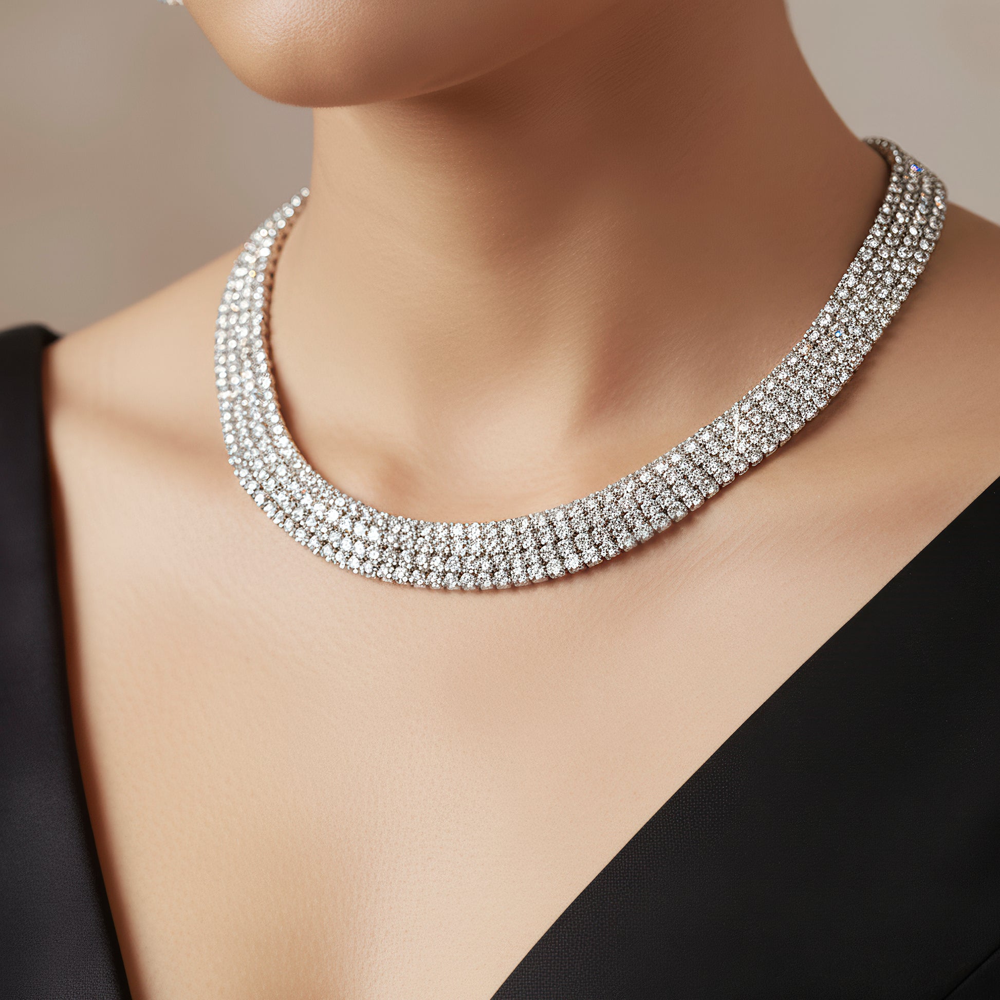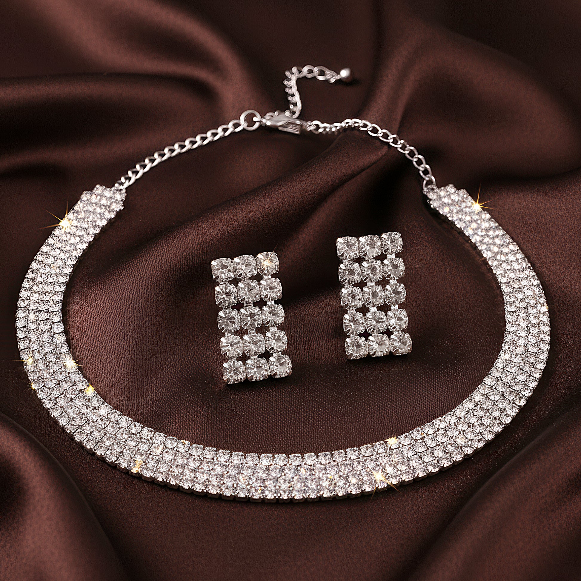 This exquisite jewelry set includes a wide necklace that is elegantly and sophisticatedly created with four glittering rhinestone strands. The carefully placed glistening rhinestones produce a dramatic, eye-catching pattern that elevates any ensemble. The necklace completes the unified and glitzy ensemble with matching earrings that mimic the multi-chain design. The set is ideal for parties, special occasions, and nighttime gatherings because it is lightweight and long-lasting, allowing for comfortable wear for lengthy periods of time. Its adaptable silver finish goes well with many different looks and hues, giving both formal and informal clothing a dash of glitz and sophistication. This set blends contemporary style with classic charm, making it the perfect thoughtful present or a striking addition to your own collection.
