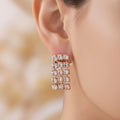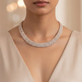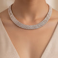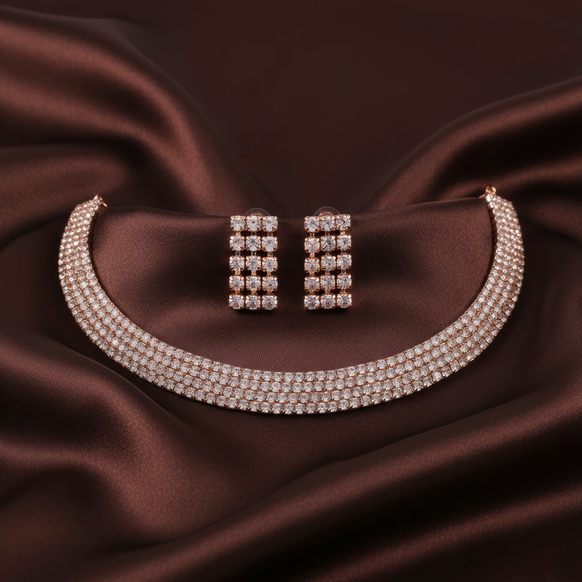 This gorgeous jewelry set includes a wide necklace with four dazzling rhinestone chains in an opulent rose gold finish, giving it a chic and glitzy appearance. Any ensemble is made more elegant and brilliant by the exquisitely placed rhinestones, which catch the light delightfully. Matching earrings complete the necklace's coherent and fashionable look by reflecting the multi-chain pattern. This set guarantees pleasant wear for parties, nighttime gatherings, or special occasions because it is lightweight and long-lasting. It is a distinctive accessory because of its adaptable rose gold tone, which goes well with both formal and casual ensembles. This set blends classic brilliance and charm with modern style, making it the ideal present or a spectacular addition to your own collection.