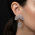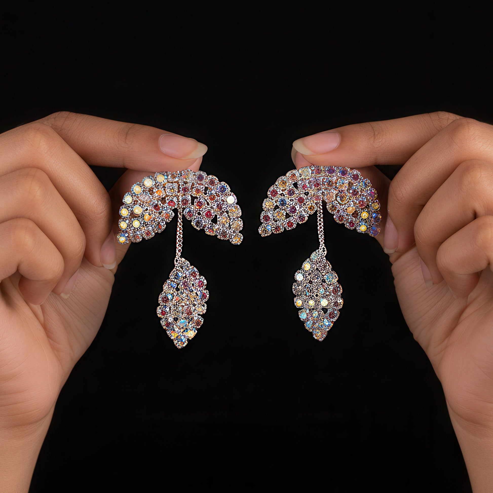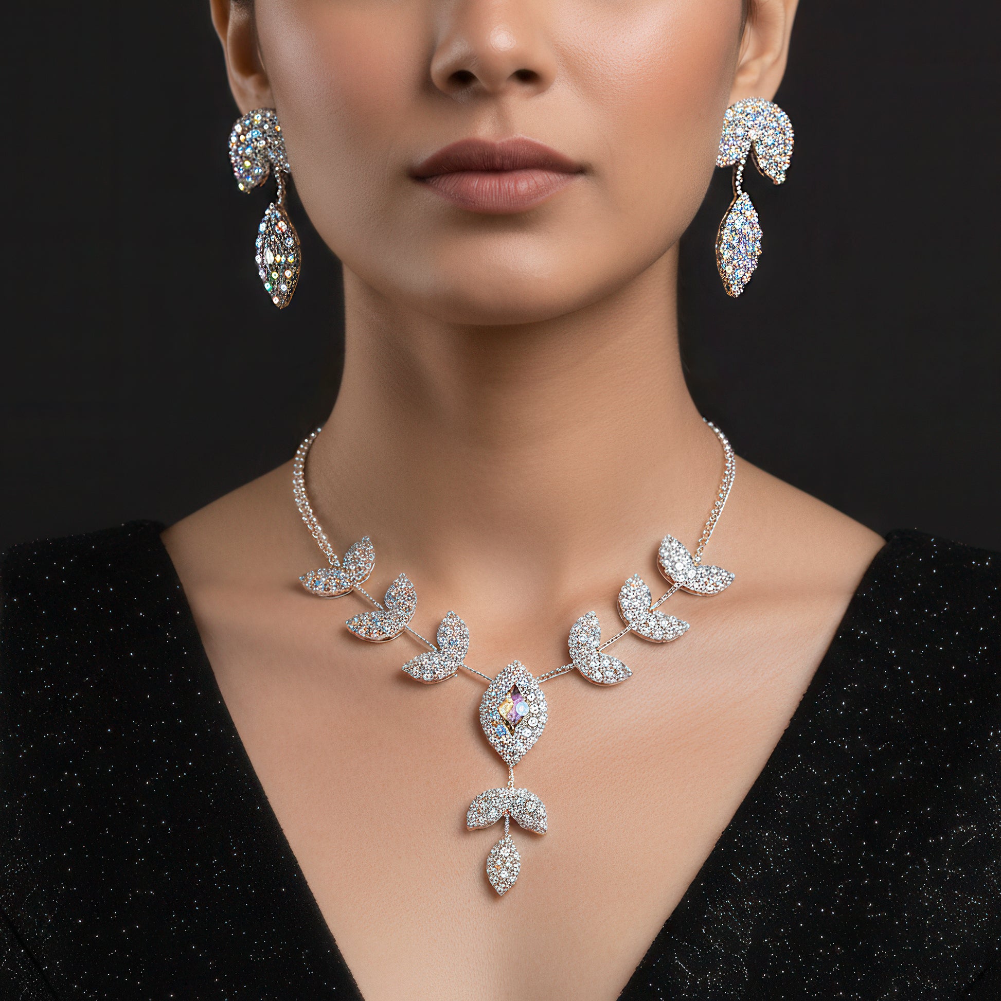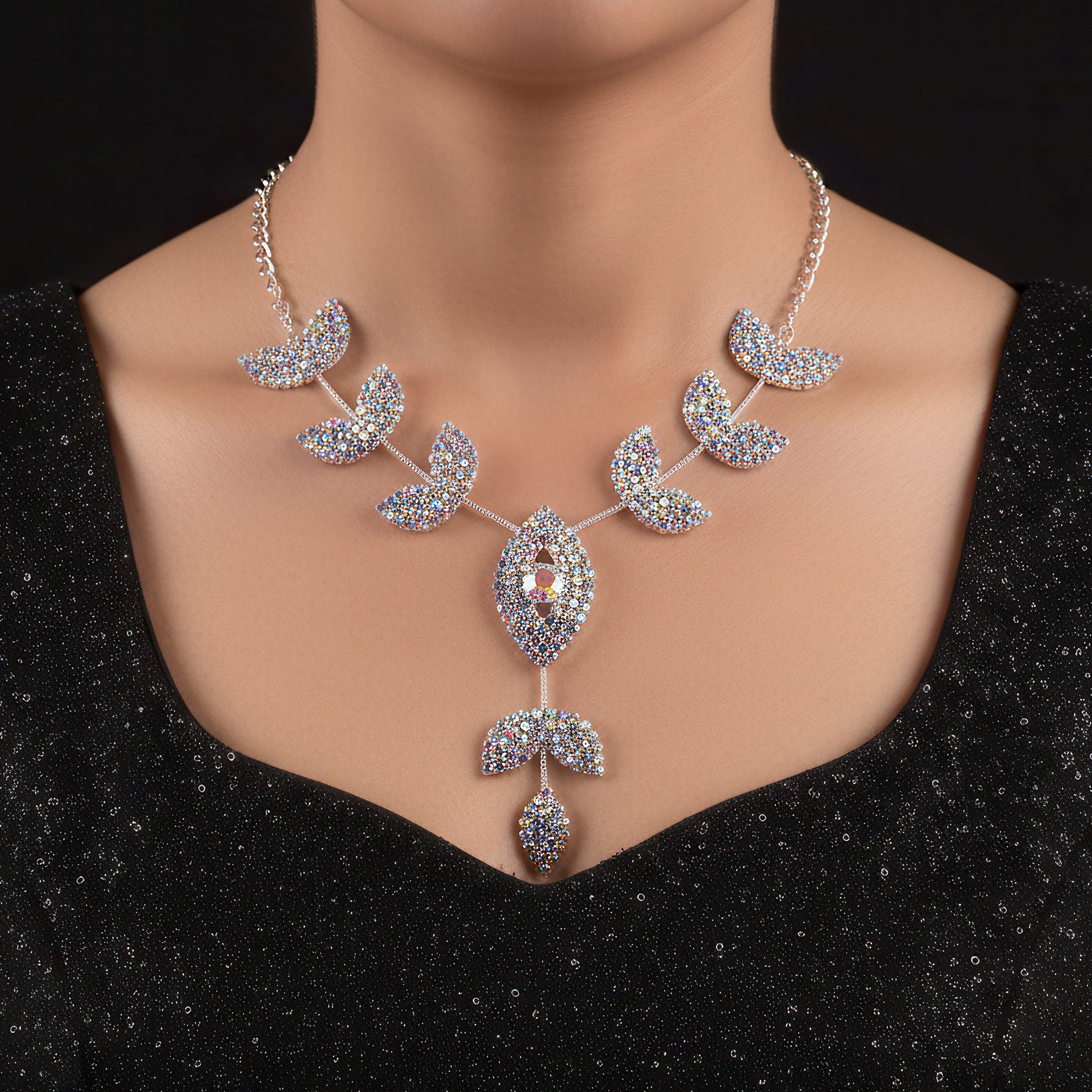 The necklace in this colorful jewelry set is focused around a protecting evil eye symbol and is embellished with a complex foliage pattern and sparkling rainbow crystals. Any ensemble is enhanced by the whimsical, yet sophisticated sparkle created by the rainbow crystals, which catch the light from all directions. Matching earrings that reflect the evil eye and leafy pattern complete the necklace, making it a cohesive and fashionable pair. This set is comfy and lightweight, making it ideal for special celebrations, festive events, and everyday use. Because of its adaptable style, it can be worn with both formal and casual settings, bringing a special touch of color and charm. This set, which combines significant significance with modern design and elegance, is perfect as a thoughtful gift or a striking addition to your own collection.