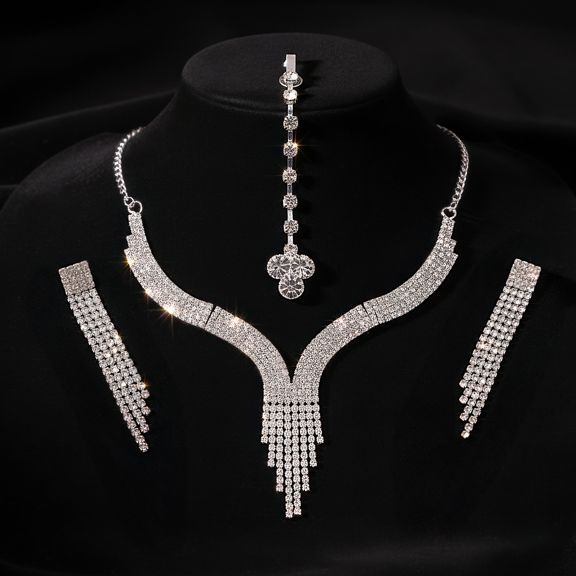 A lovely sweetheart-shaped pendant and a sparkling rhinestone chain necklace combine to create a delicate and romantic appeal in this exquisite jewelry combination. The glittering stones gleam brilliantly in the sunlight, giving every ensemble a hint of refinement and glitz. Matching earrings that re-create the sweetheart motif complete the necklace's elegant and well-coordinated design. This set offers both style and ease of wear, making it ideal for special occasions, evening gatherings, and everyday wear. It is lightweight and comfy. Its adaptable style makes it a classic complement to any jewelry collection and goes well with formal, informal, and party wear. This set radiates sophistication, charm, and modern flair, making it the perfect choice for a thoughtful present or a statement piece.