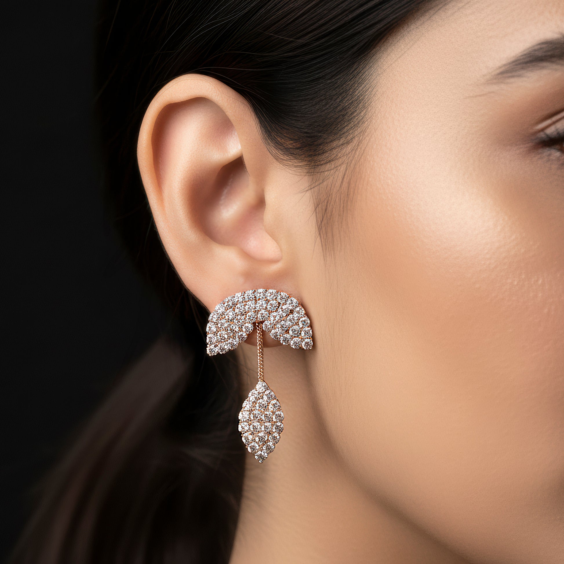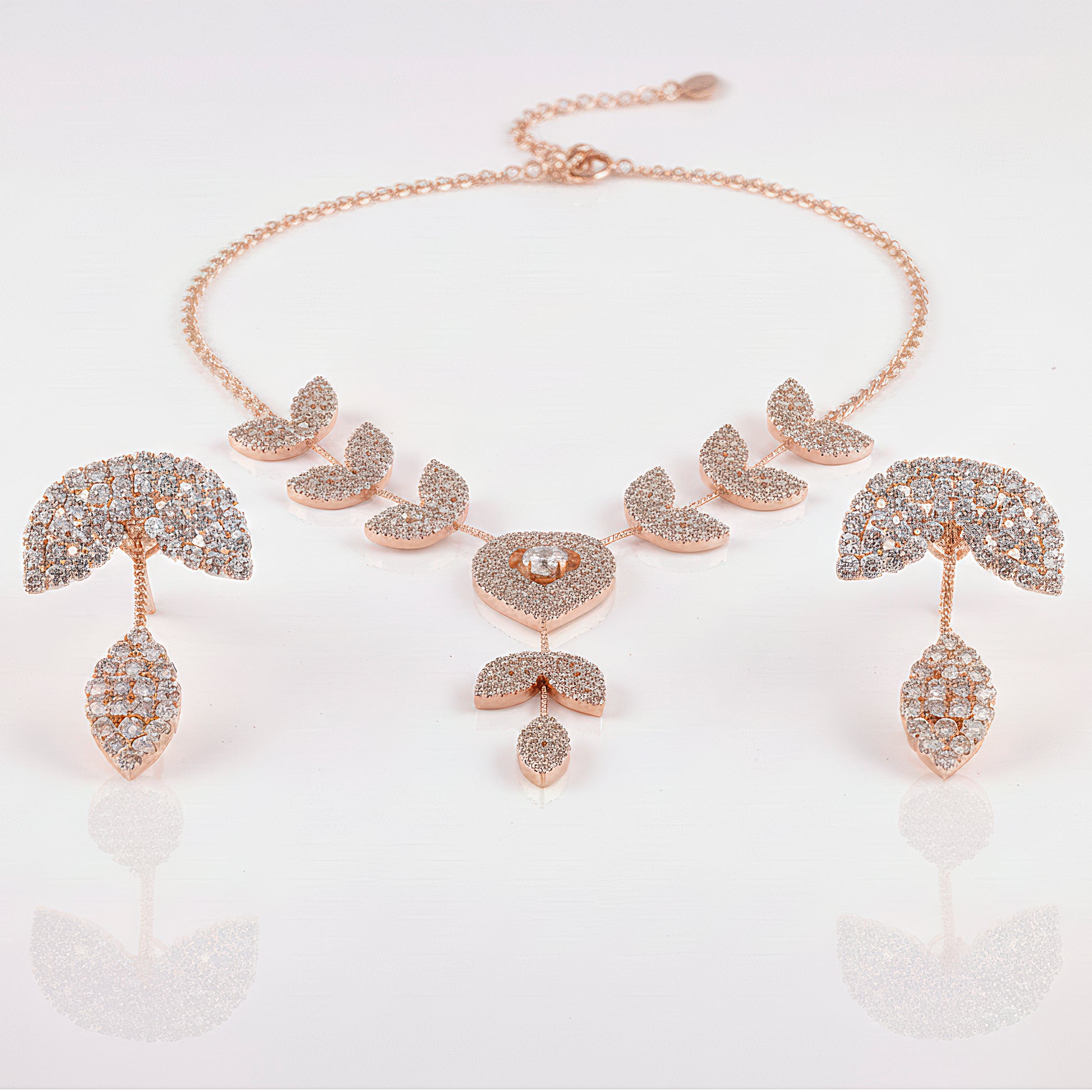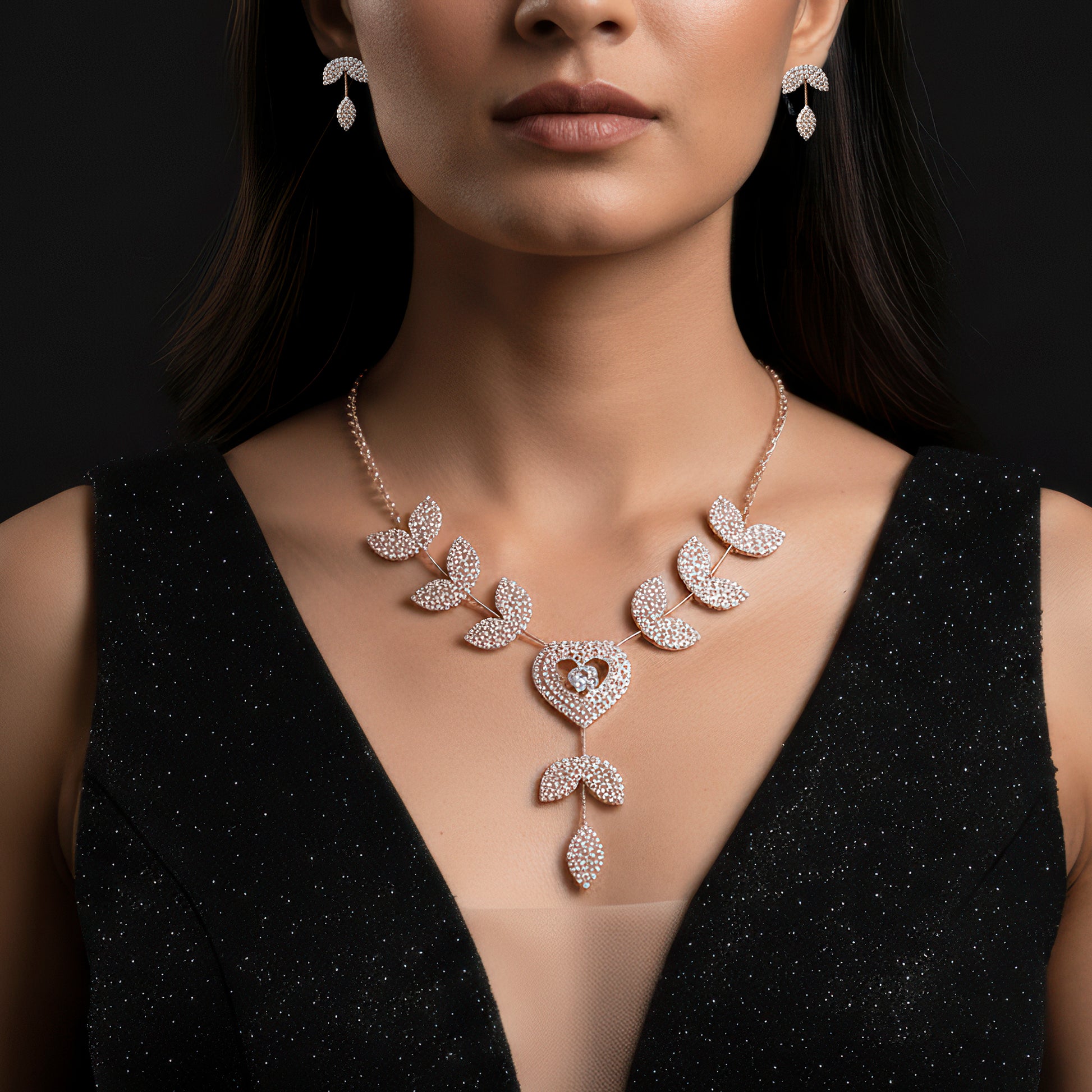 The necklace in this lovely jewelry set has a delicate heart motif entwined with a leafy pattern, giving it a romantic and natural-inspired appearance. It is a unique accessory for any event because of the exquisite detailing, which adds elegance and charm. Matching earrings that re-create the heart and leaf pattern complete the necklace, making the ensemble unified and fashionable. It adds a touch of luxury to any ensemble and is comfortable and lightweight enough to be worn every day, on special occasions, or at nighttime gatherings. Its adaptable style makes it a classic addition to any jewelry collection and goes well with both formal and casual settings. With its exquisite blend of modern design and traditional elegance, this set is ideal as a thoughtful present or a statement piece.