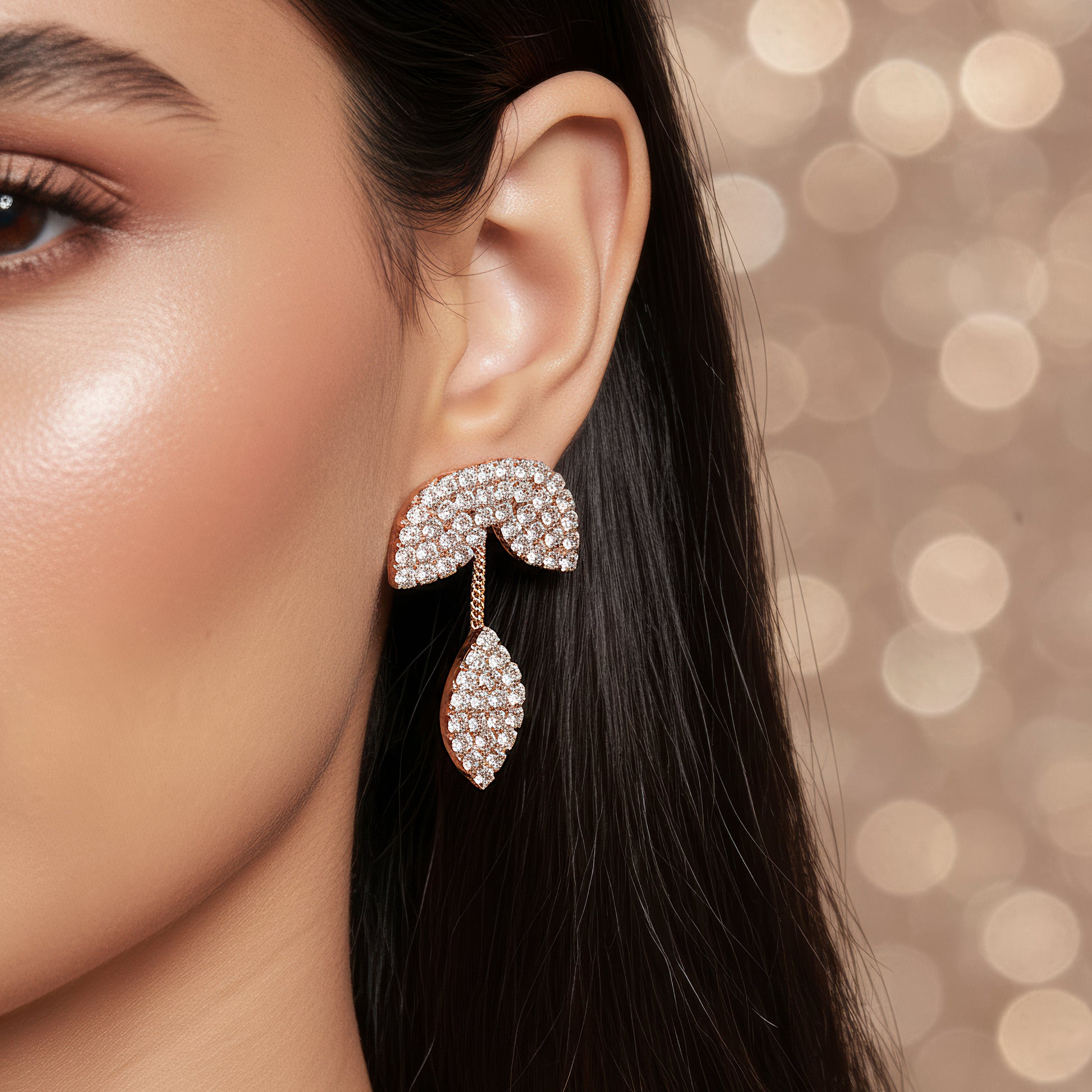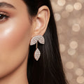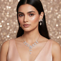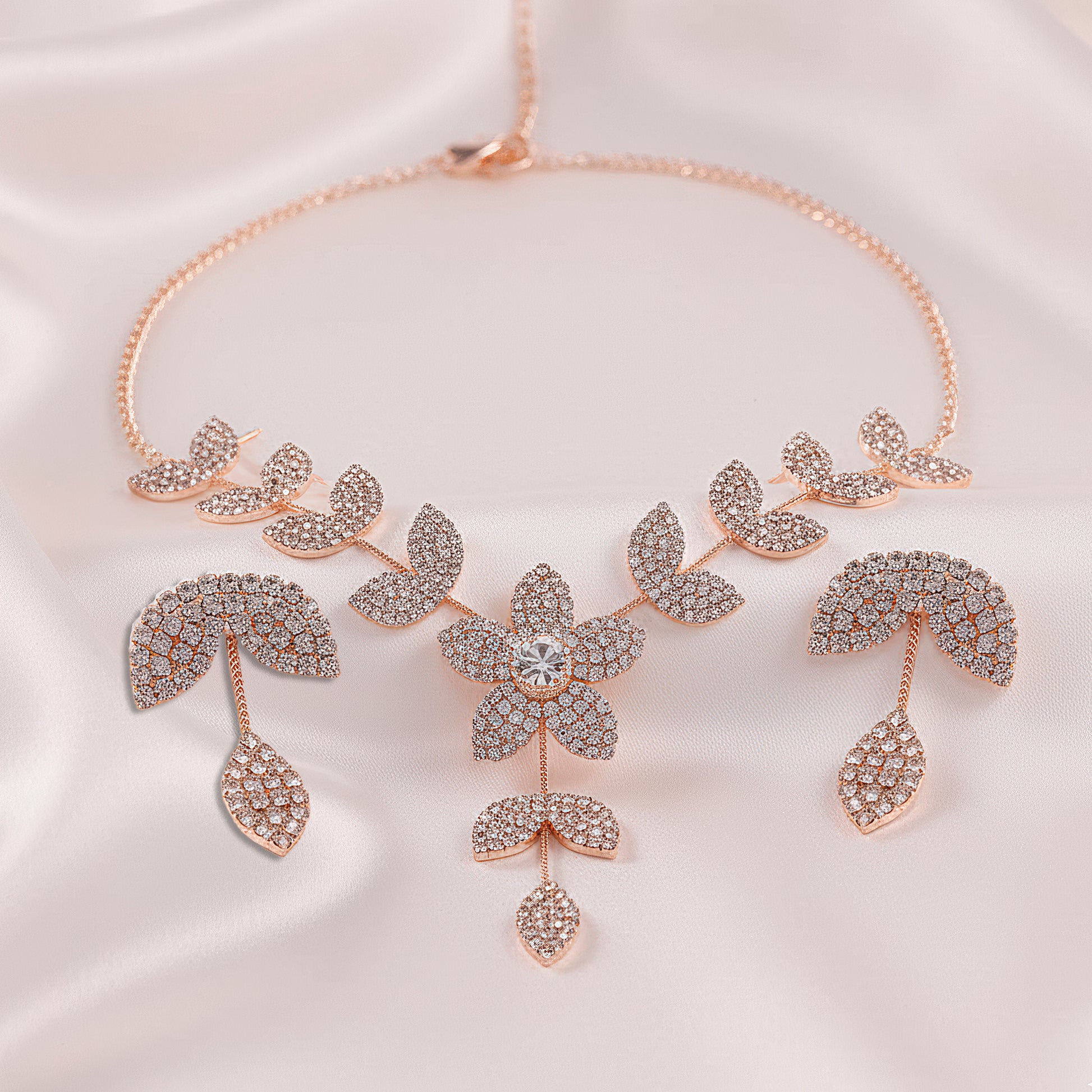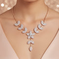 This gorgeous jewelry set includes a necklace with a detailed flower and leaf design that is encrusted with brilliantly glinting white crystals. A lovely accessory for any event, the delicate floral design radiates charm and elegance. The necklace and matching earrings complete the elegant and well-coordinated set by echoing the flower and leaf theme. It adds a touch of sophistication and sparkle to any ensemble and is lightweight and comfortable, making it ideal for everyday wear, parties, and special occasions. Its adaptable style makes it a classic complement to any jewelry collection and goes well with evening, business, or casual wear. This set, which combines contemporary design with traditional beauty, is perfect as a thoughtful present or a statement piece.