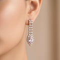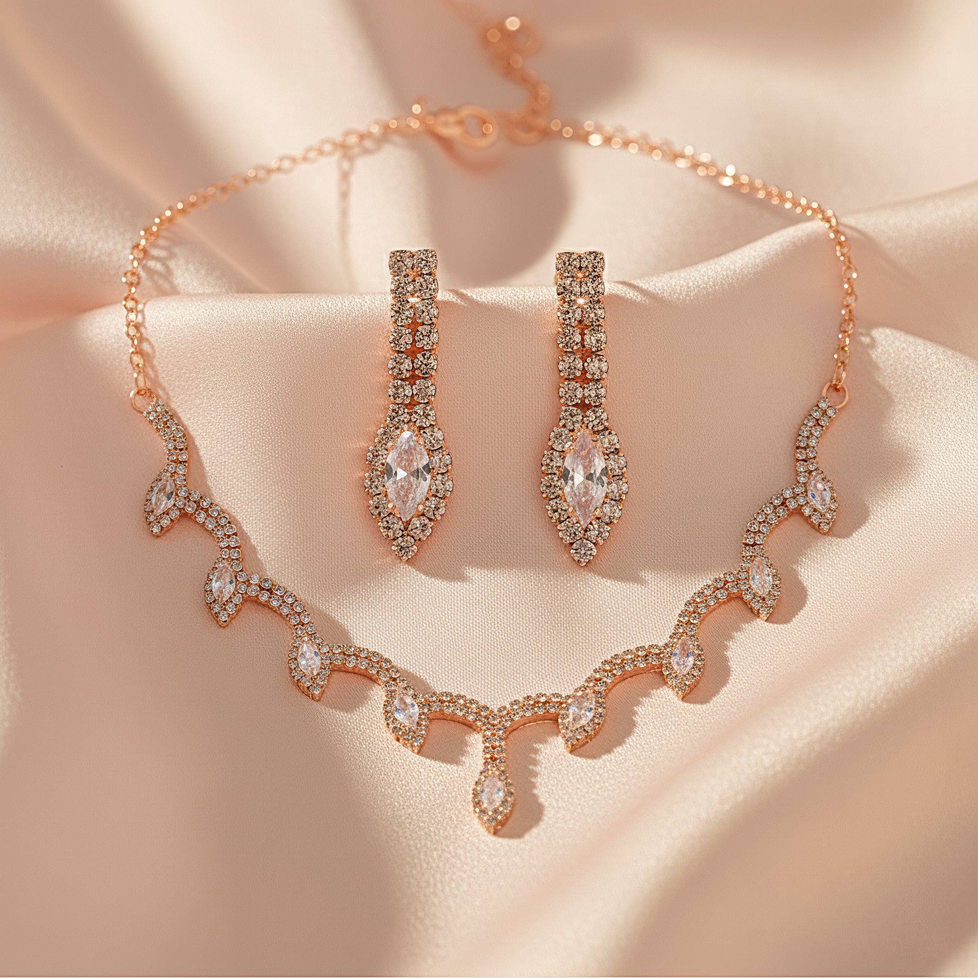 This gorgeous necklace and earring set has a stylish and eye-catching style thanks to the marquise-shaped crystals placed in an exquisite bunting pattern. Beautiful light reflection from each crystal gives the set a glittering brilliance that elevates any ensemble. The matching earrings complete the matched and glitzy ensemble by echoing the necklace's style. This combination gives your clothing a touch of refinement and elegance, making it ideal for festive festivities, nighttime gatherings, and special occasions. It easily enhances both formal and semi-formal clothes and is lightweight and pleasant to wear. Its adaptable design goes well with many different necklines, giving it a distinctive piece that attracts attention while retaining a refined elegance. Anyone looking for a set that strikes a mix between refinement and glitz should choose this one.