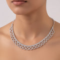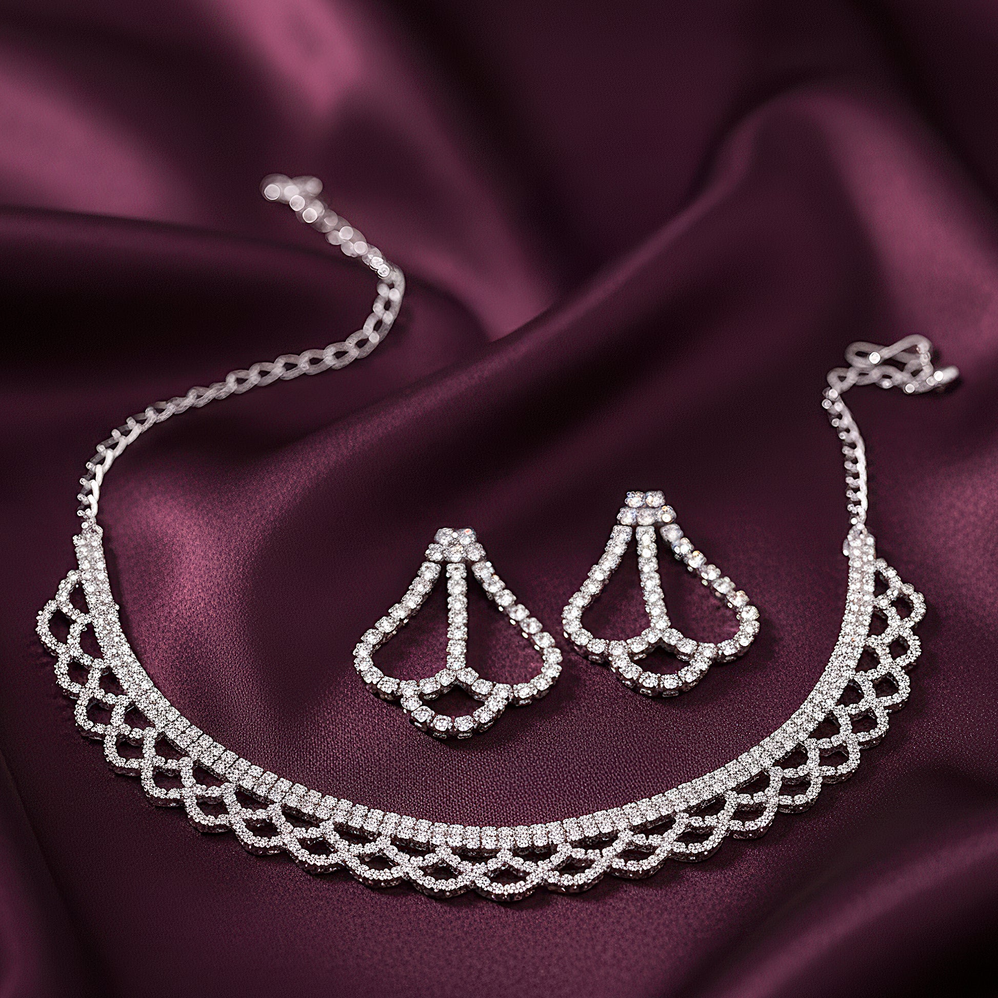 The curving, flowing pattern of glittering rhinestones in this sophisticated necklace and earring combination is intended to provide a beautiful and striking silhouette. Carefully positioned along the curves, each rhinestone creates a stunning, glittering look by reflecting light. The necklace's flowing shape is echoed by the matching earrings, creating a cohesive and elegant appearance. This set is ideal for festive occasions, parties, and nighttime gatherings since it elevates any ensemble with a dash of glitz and refinement. It elegantly elevates both formal and semi-formal outfits and is lightweight and comfy. It is a bold yet elegant accessory because of its adaptable style, which goes well with many different necklines. Perfect for people who value style and glitz, this set adds a stunning final touch to your look.