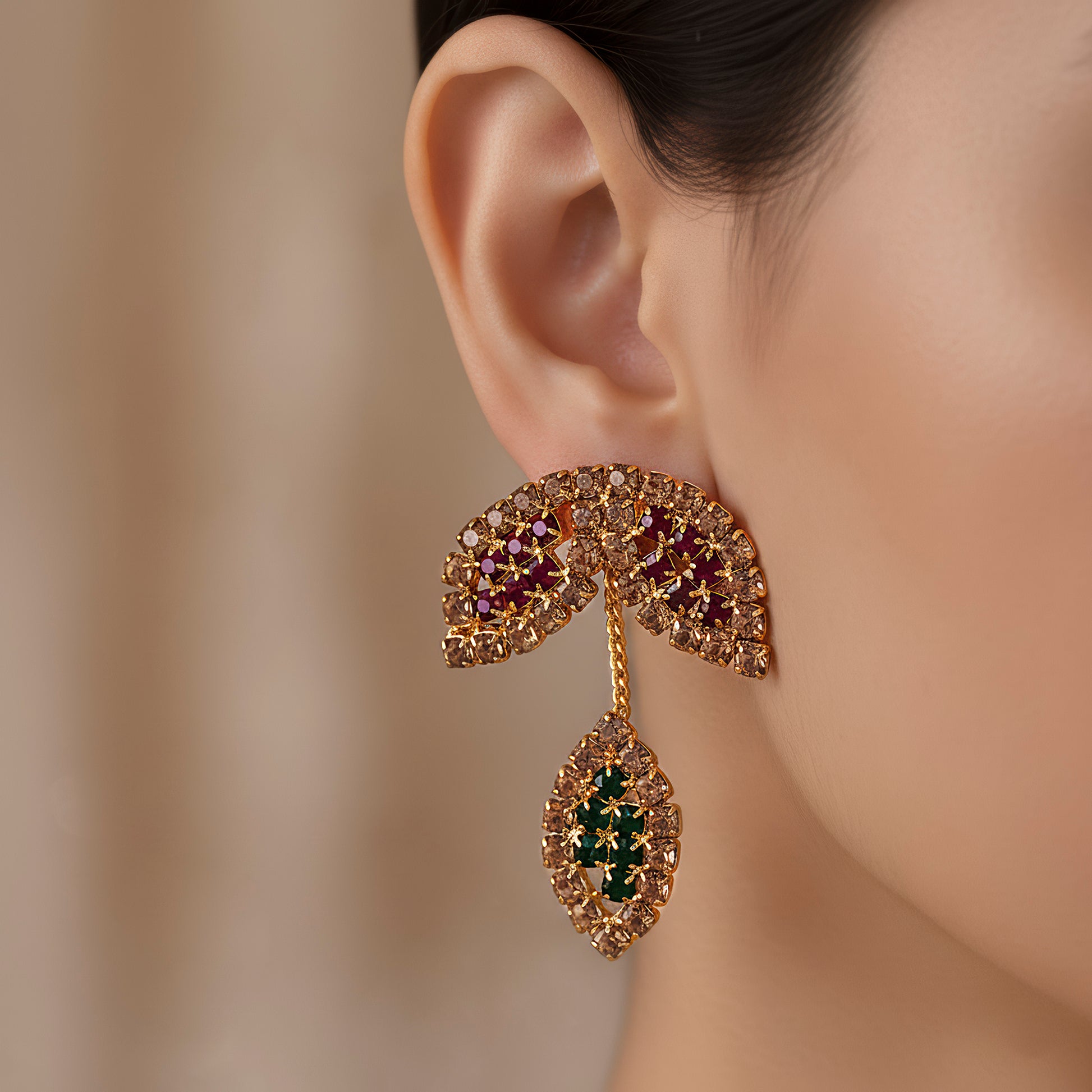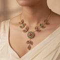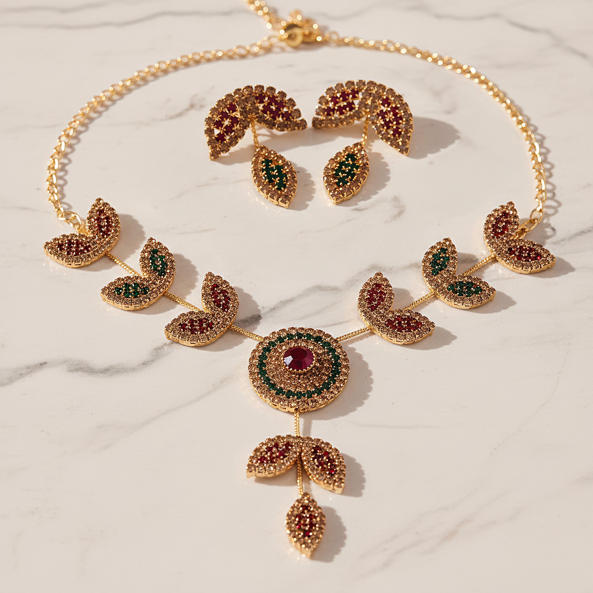 This gorgeous combination of necklaces and earrings includes a spherical pendant with a beautiful foliage design that is finely decorated with red, green, and topaz crystals. Every crystal is positioned with care to accentuate the design's organic flow, producing a vivid and striking glitter from all sides. The delicate motif of the pendant is reflected in the matching earrings, creating an exquisite and well-coordinated ensemble. This combination is perfect for evening gatherings, parties, and celebrations since it elevates any ensemble with a splash of color. It seamlessly elevates both classic and modern ensembles and is lightweight and comfortable to wear. Its adaptable style goes well with a variety of necklines, making it an essential piece for anyone who values exquisitely made, dazzling jewelry that subtly draws attention.