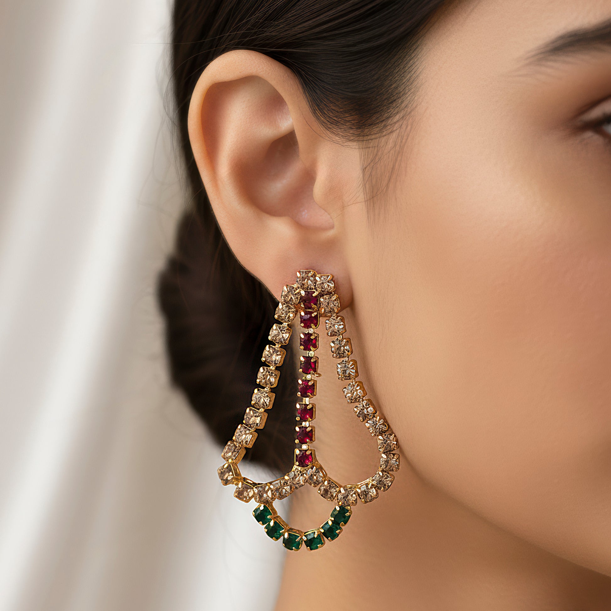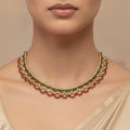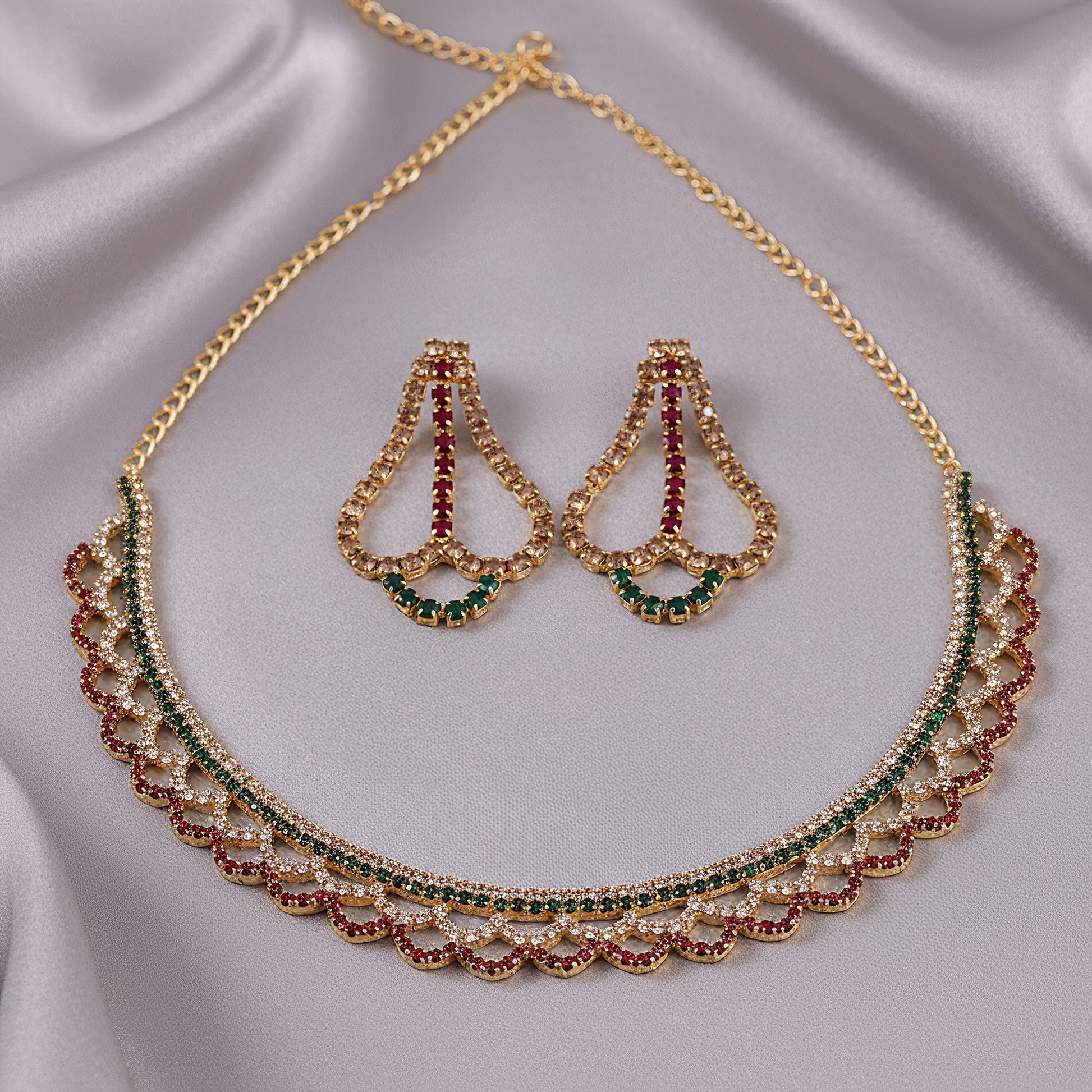 With its flowing, curved design and sparkling rhinestones and vivid crystals in topaz, green, and red hues, this eye-catching necklace and earring set is designed to exude elegance. The design's elegant curves produce a visually appealing and harmonious effect that makes it the ideal statement piece for any setting. The matching earrings reflect the design and provide a well-balanced and matched style, while the necklace sits exquisitely along the neckline, showcasing its exquisite craftsmanship. This set is perfect for weddings, celebrations, parties, or as a kind present because it is portable yet powerful. Its beautiful curving detailing and sparkling crystals give sophistication and appeal, subtly adding a dash of style and sparkle to both classic and modern ensembles.