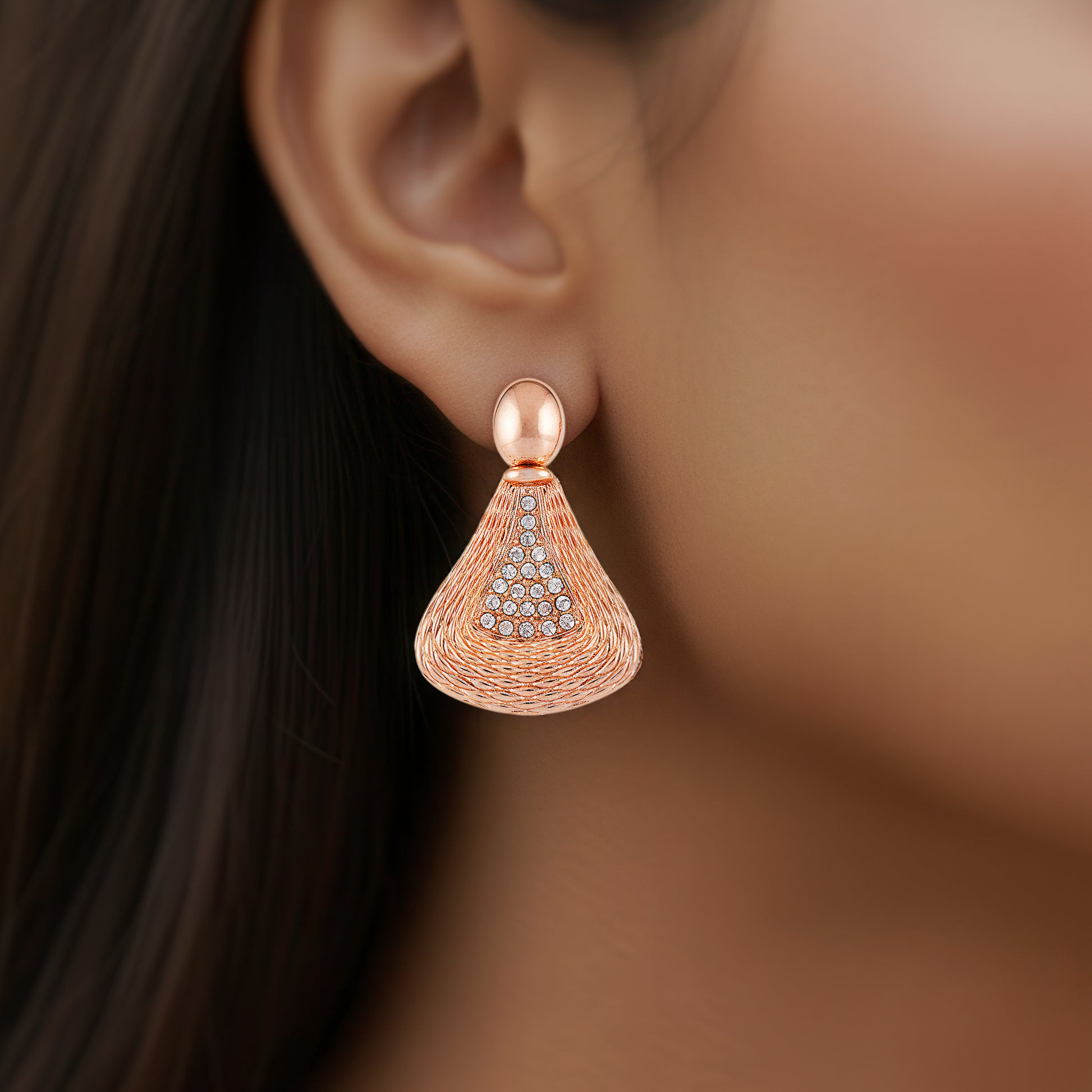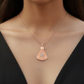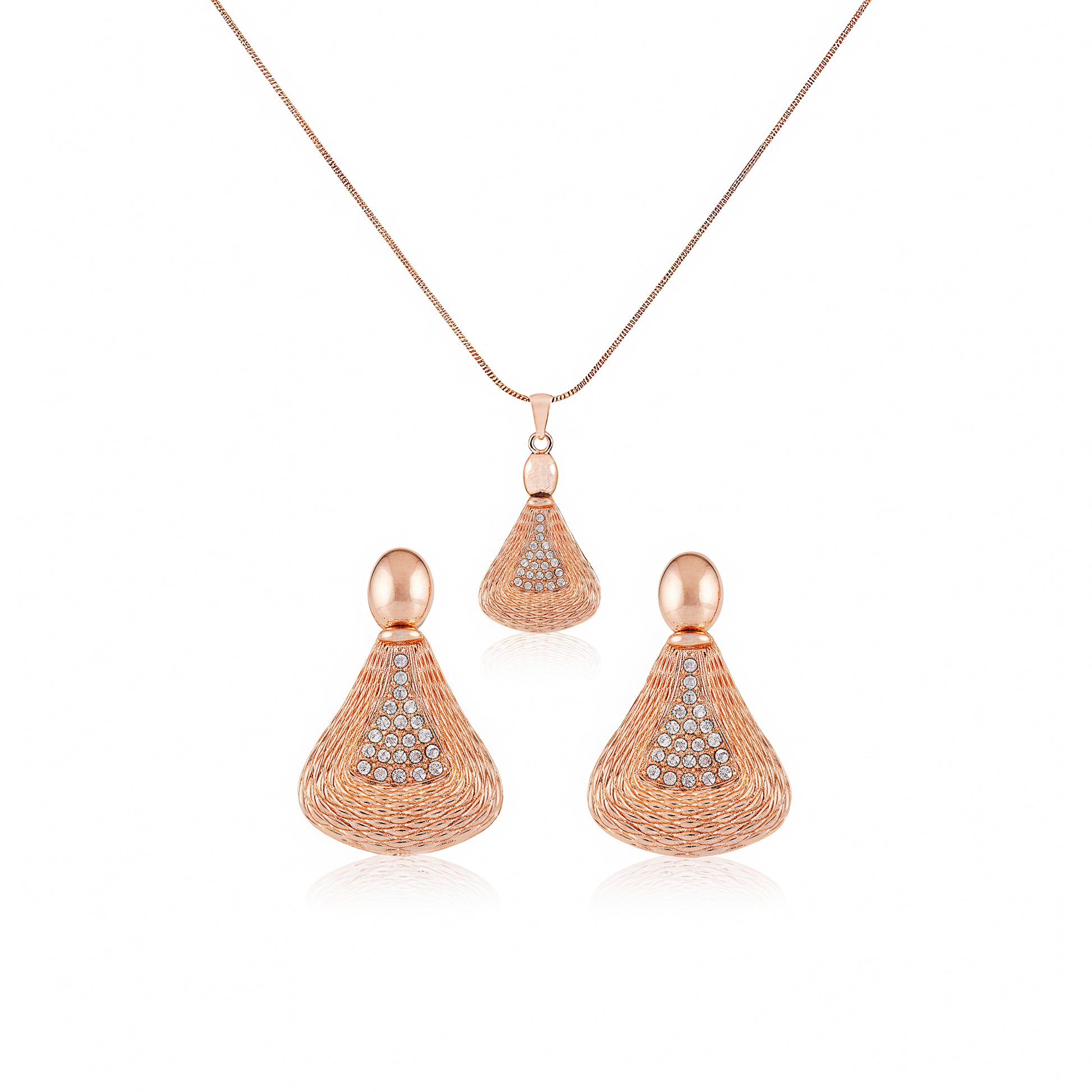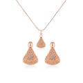 The rough triangle motif of this exquisite pendant set is painstakingly embellished with glittering crystals for a stunning and modern appearance. It is a distinctive accessory because of the geometric shape's contemporary edge and the detailed texturing's depth and aesthetic appeal. The matching earrings repeat the design and add balance and sophistication to the combination, while the pendant sits elegantly and draws attention with its exquisite craftsmanship. This set is comfy and lightweight, making it perfect for parties, weddings, and other festive events. It may also be given as a meaningful present to a particular someone. It is a multipurpose item that effortlessly adds style and refinement to both classic and modern ensembles because to its combination of geometric craftsmanship and bright crystals, which offer charm and grace.