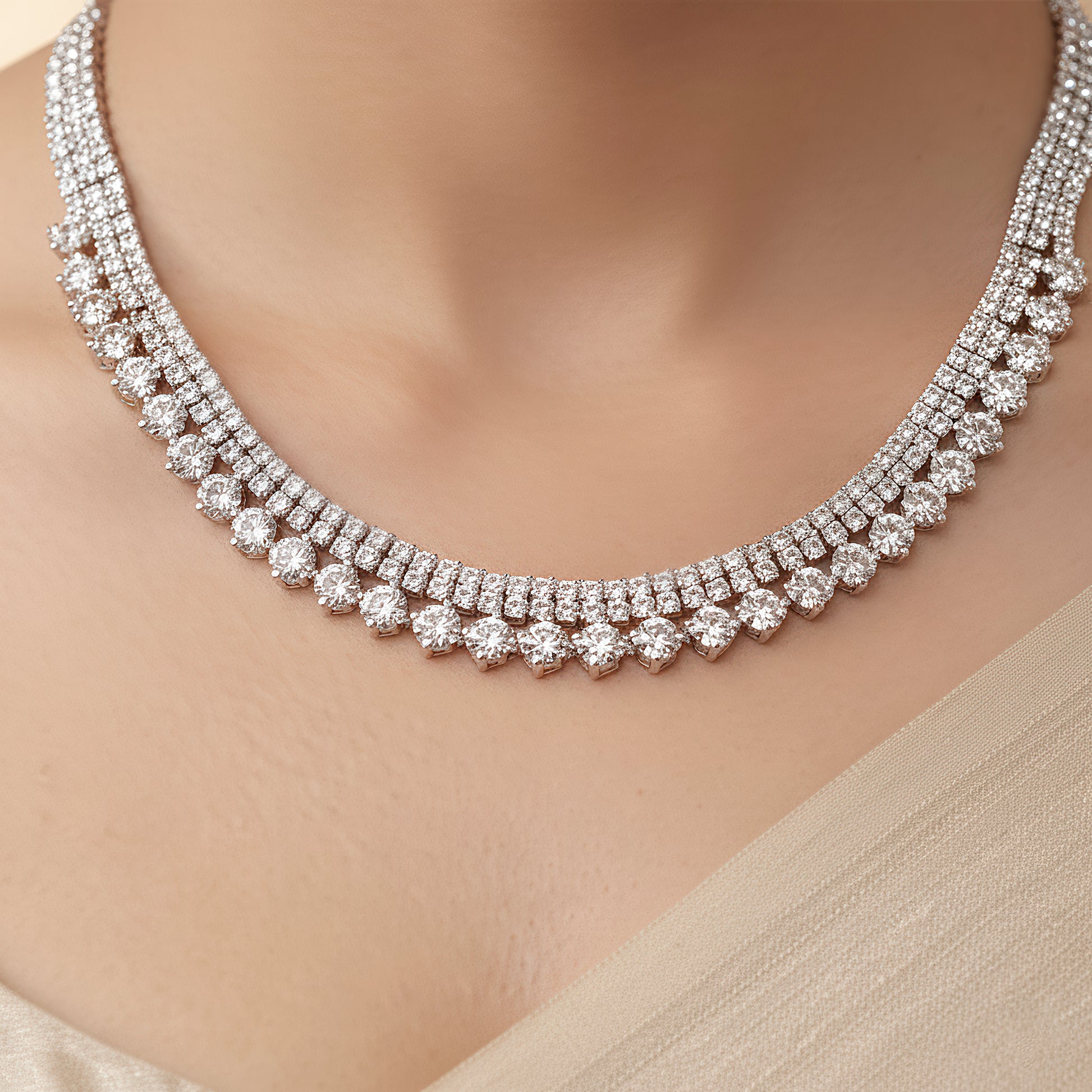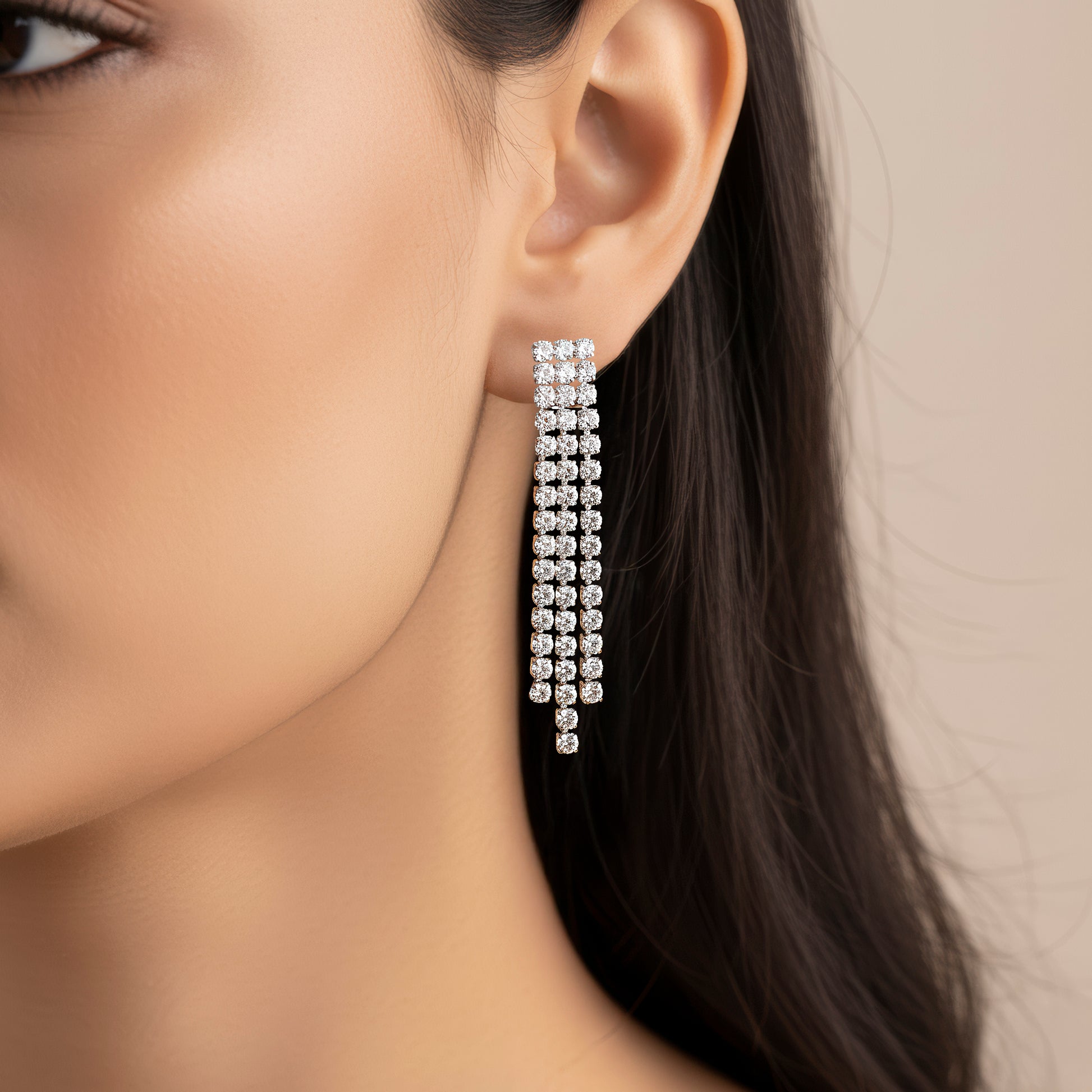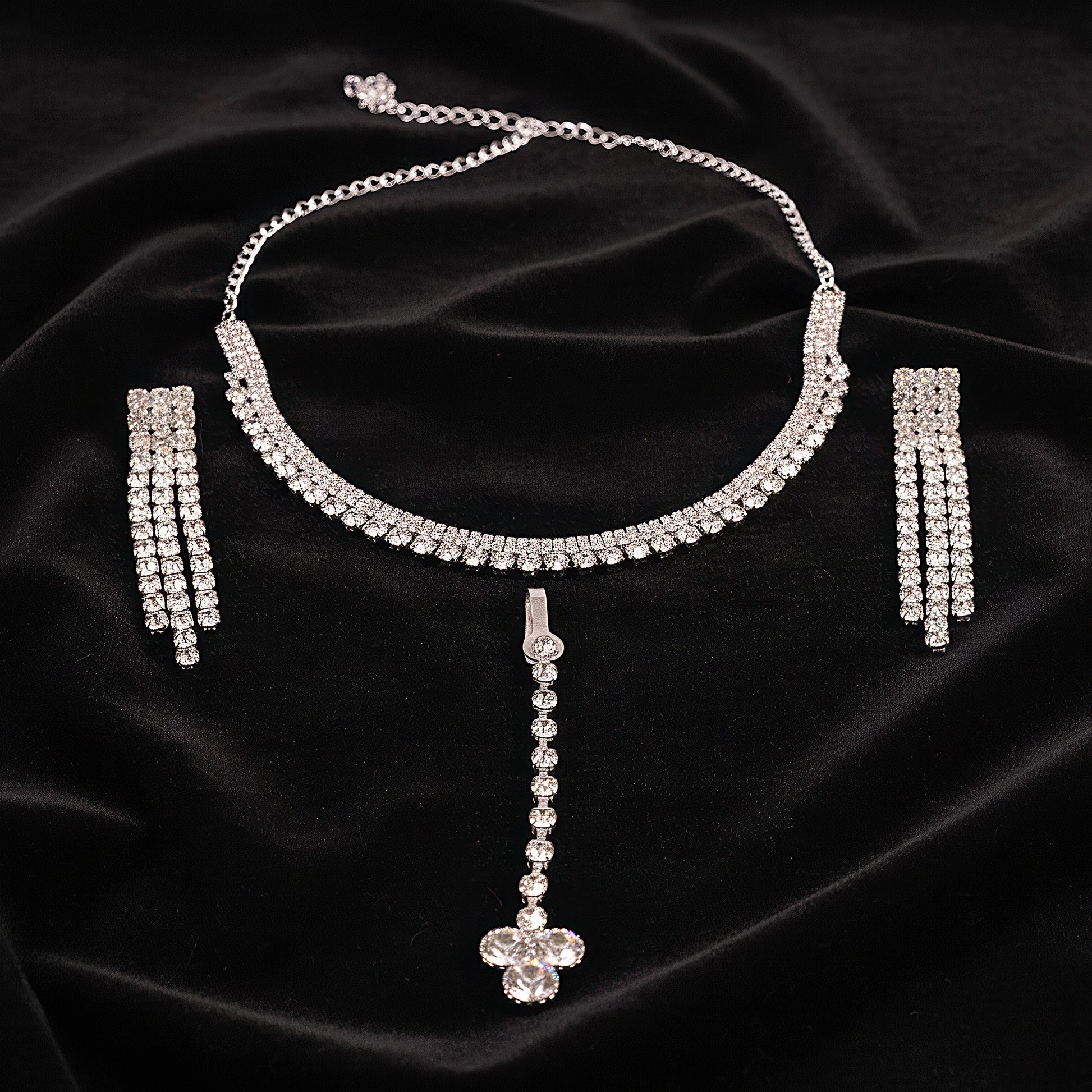 With its sophisticated rhinestone strap detailing, this eye-catching necklace and earring combination is meant to make a big impression. Any ensemble is enhanced by the stunning impact of the shimmering rhinestones as they catch the light. The necklace features a modern yet elegant design that instantly attracts attention as it hangs elegantly along the neckline. The necklace is balanced and elegantly completed by the matching earrings, which also have the same exquisite craftsmanship. This set is perfect for weddings, celebrations, nighttime events, or as a kind present because it is comfy and lightweight. It is a versatile item that adds flair, charm, and a dash of glitz to both traditional and modern ensembles because to its sleek design and bright glitter.