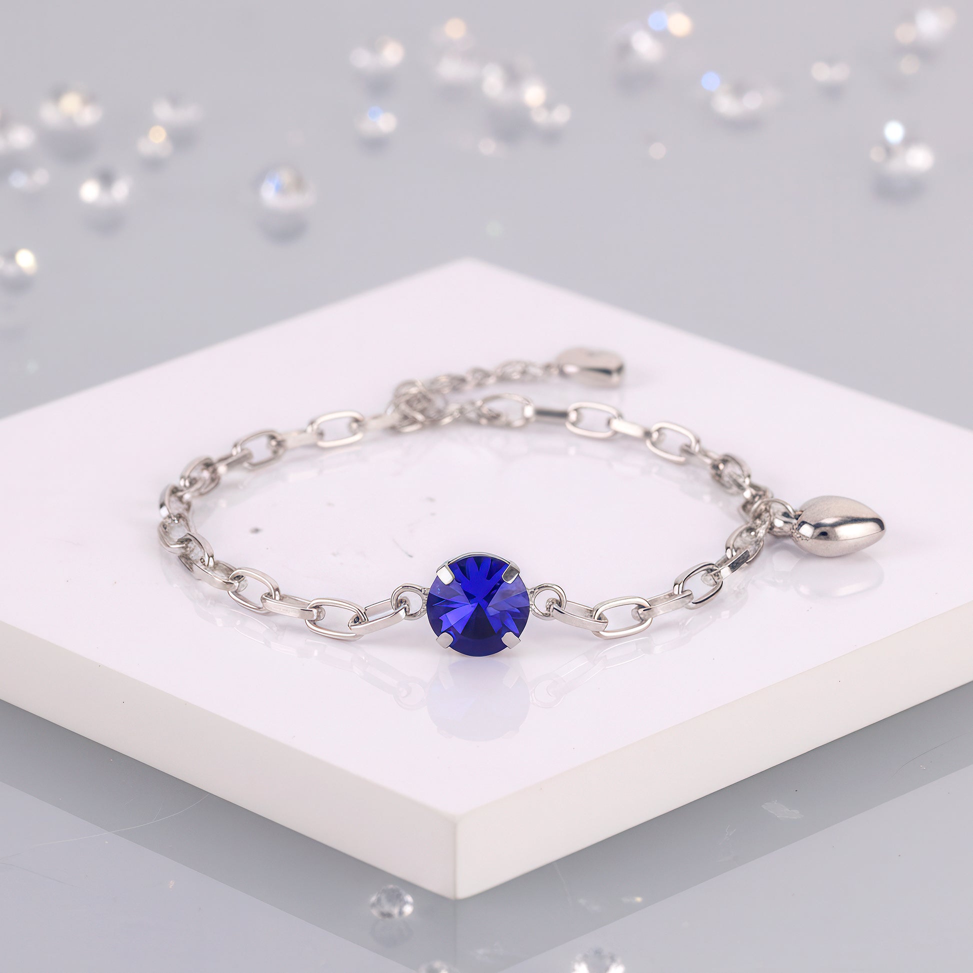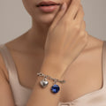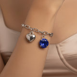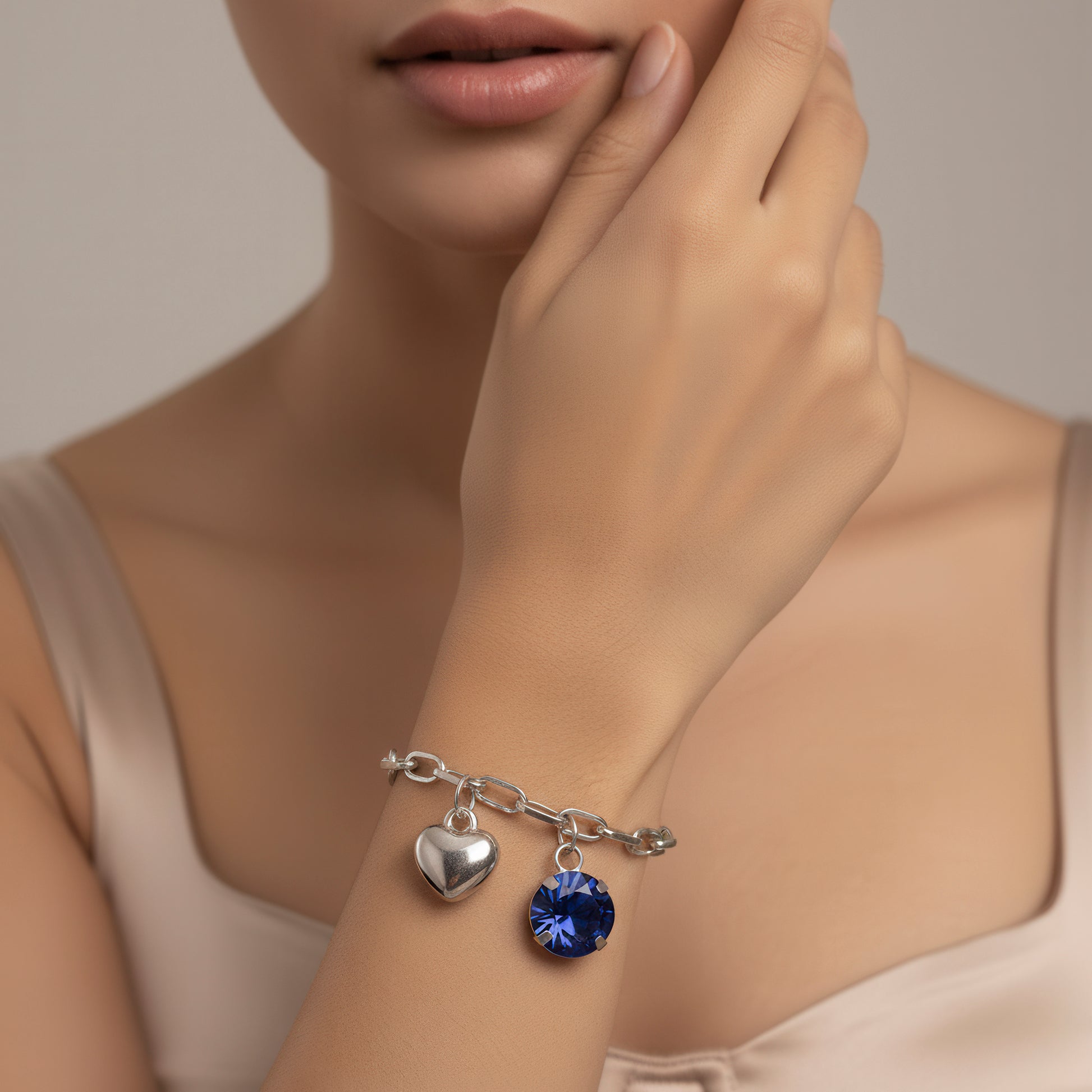 This sophisticated bracelet strikes the ideal mix between elegance and sentiment by fusing the classic charm of a heart-shaped pendant with the brilliance of deep blue sapphire-like crystals. With each movement, the brilliant crystals that are meticulously arranged along the elegant band catch the light beautifully, giving your appearance a sophisticated touch. The dangling heart charm is more than simply an ornament; it's a meaningful piece that represents love, affection, and positive energy. It is comfortable and lightweight, and it goes well with both formal and informal attire for special occasions as well as everyday usage. This bracelet is a charming addition to your personal jewelry collection or a considerate present for a particular someone.