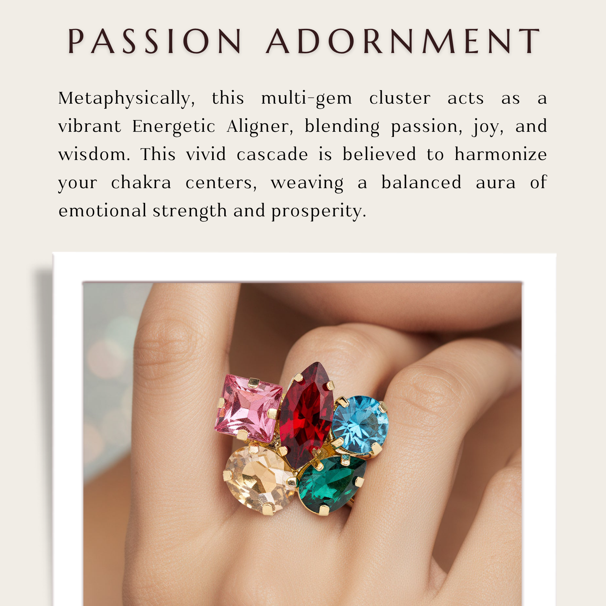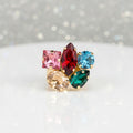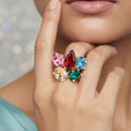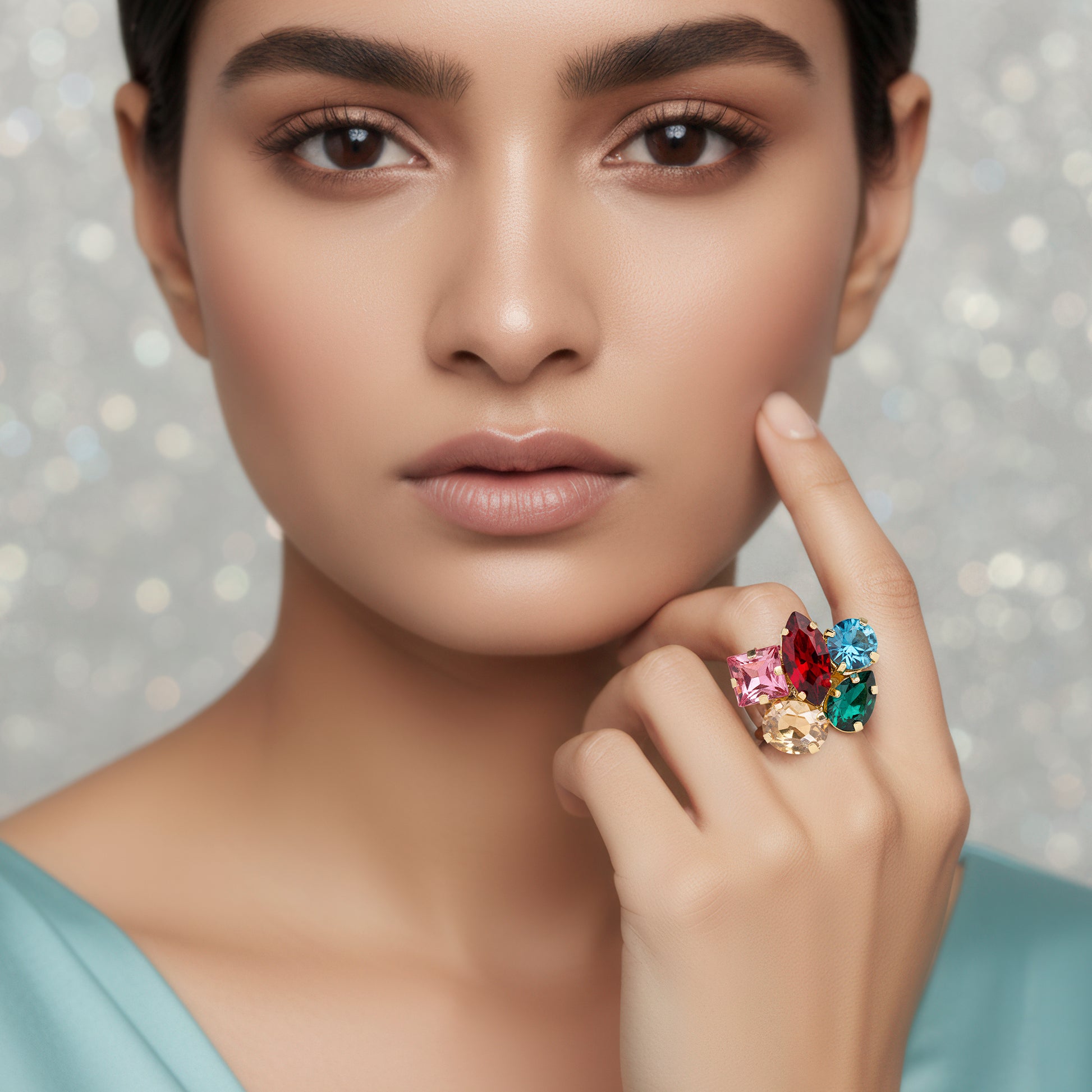 The five stunning crystals in this ring's design, which come in a variety of sophisticated designs like oval, round, drop, square, and marquise, make for a really striking statement. Its brilliance is enhanced by the arrangement of different cuts, which capture light from all directions and display a distinct artistic flair. The ring, which is set on a wide band, provides a striking and modern appearance while guaranteeing comfort and longevity for extended wear. Its adaptable style adds glitz without being overpowering, making it appropriate for both special occasions and everyday fashion. This piece exhibits sophistication and uniqueness whether it is worn alone or combined with other jewelry. It combines classic brilliance with contemporary charm in a single creation, making it perfect for people who value unique designs.