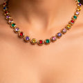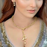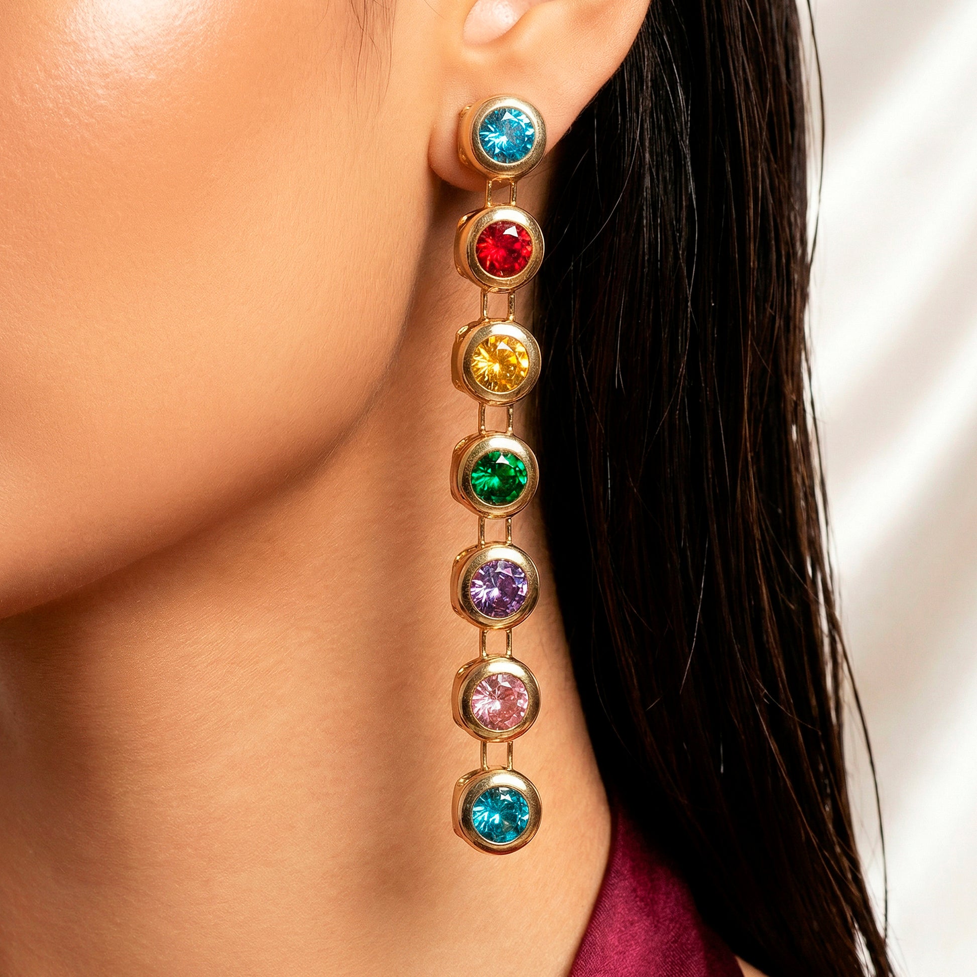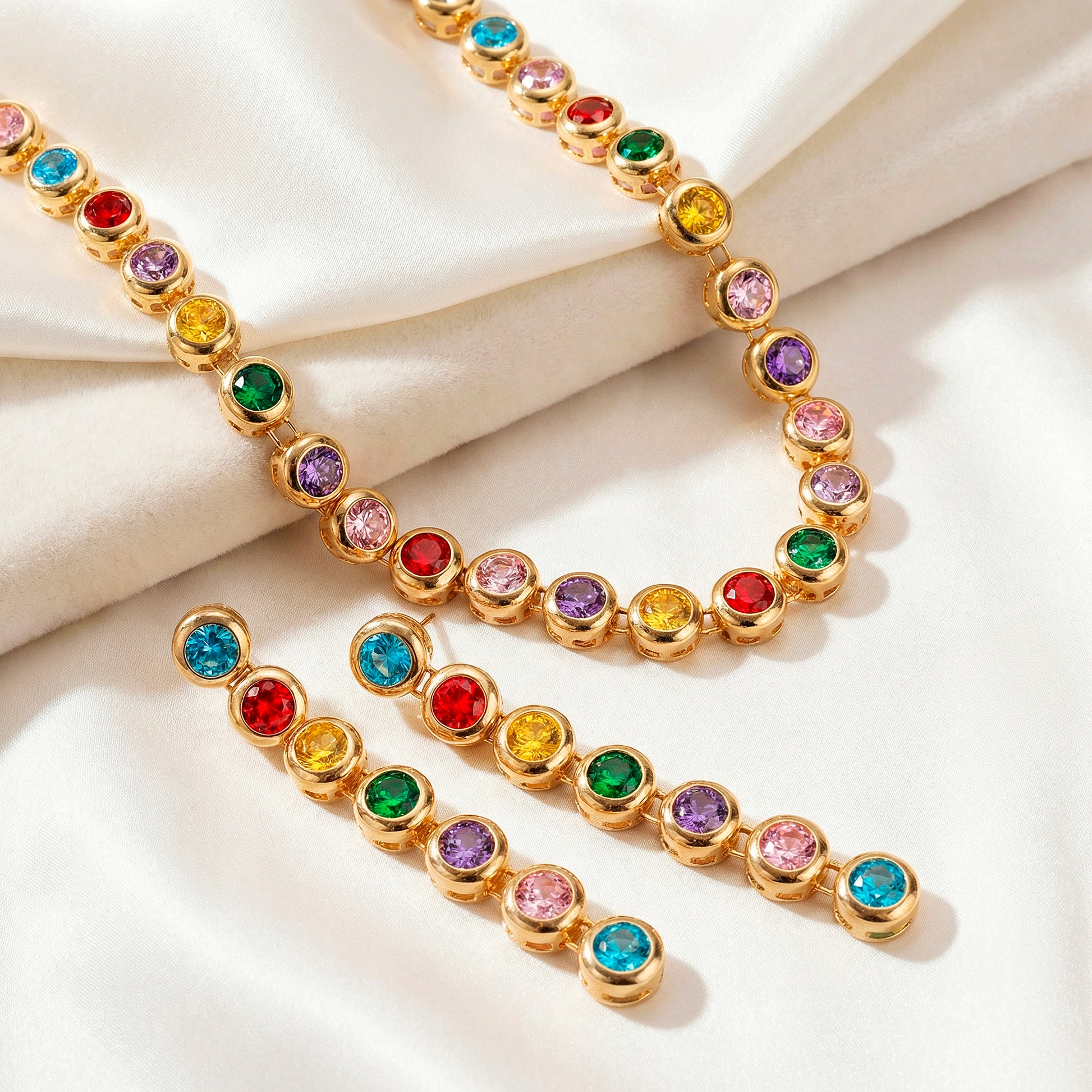A sophisticated single-line necklace with multicolored gems that sparkle exquisitely with each movement is featured in this jewelry set. A splash of color is added without overpowering the design thanks to the thoughtful placement of each crystal along the chain, which results in a vivid yet sophisticated design. In order to lengthen the neckline and provide more glitter with elegant movement, the necklace is paired with matching long dangling earrings. This set is lightweight and comfortable to wear, and it perfectly combines charm and refinement. It goes well with both contemporary and traditional clothing, making it perfect for parties, celebrations, or bringing a little glitz to regular ensembles. It is a multipurpose item that embodies the splendor of vibrant brilliance while retaining a classic and fashionable look.