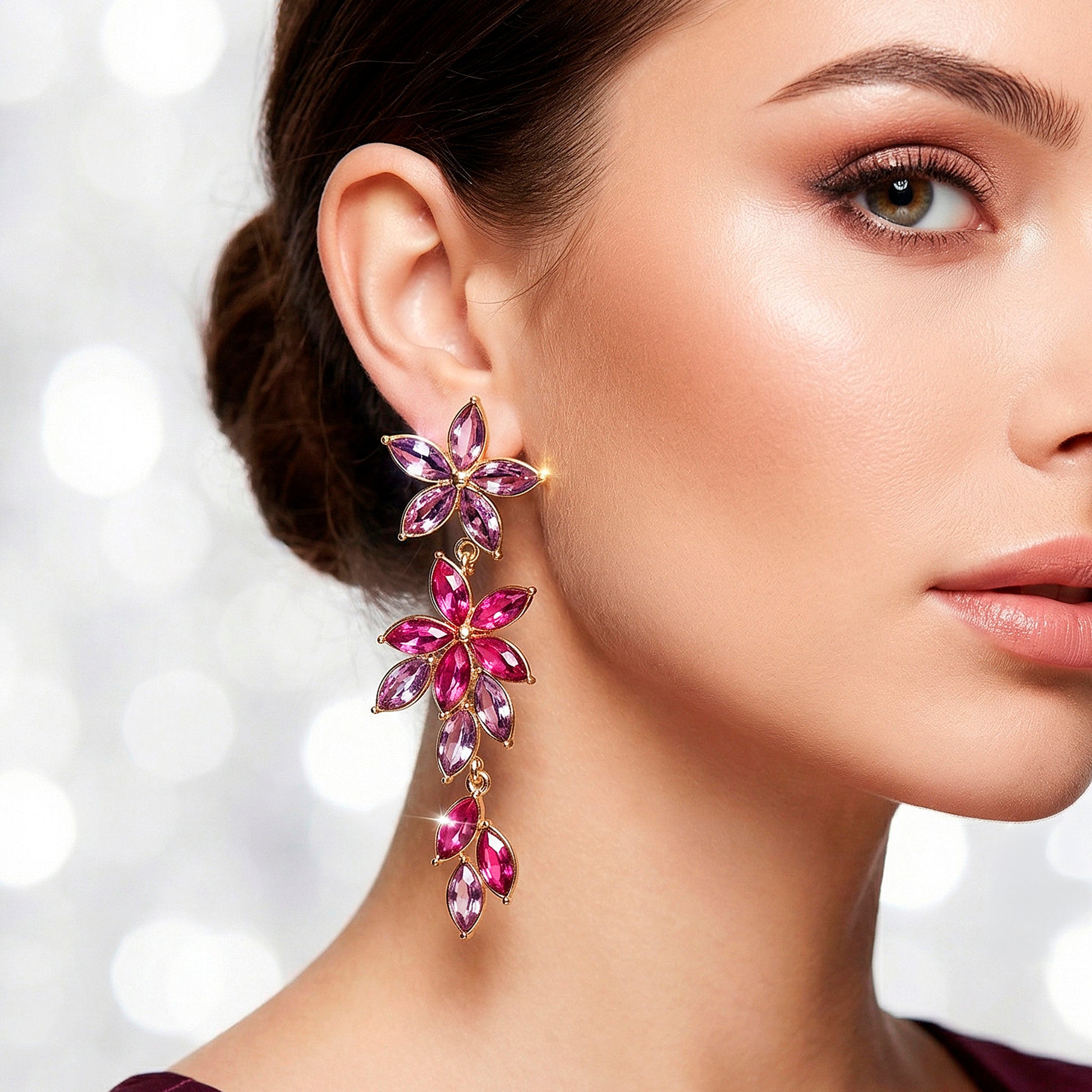 Sparkling crystals that catch the light brilliantly embellish the elaborate flowery design of these long dangling earrings. Every delicate petal is designed to accentuate the crystals' brilliance, producing a stunning and radiant impression. The earrings' elongated shape enables them to sway elegantly, bringing movement and charm to any ensemble. They instantly improve the wearer's appearance and are comfortable and lightweight, making them appropriate for lengthy wear at formal events, parties, and celebrations. They are the ideal accessory for big events or festivities because of its adaptable appeal, which goes well with both traditional and modern clothing. These earrings provide a chic statement item that elevates style and reflects classic elegance and feminine grace thanks to their exquisite craftsmanship and striking sparkle.