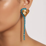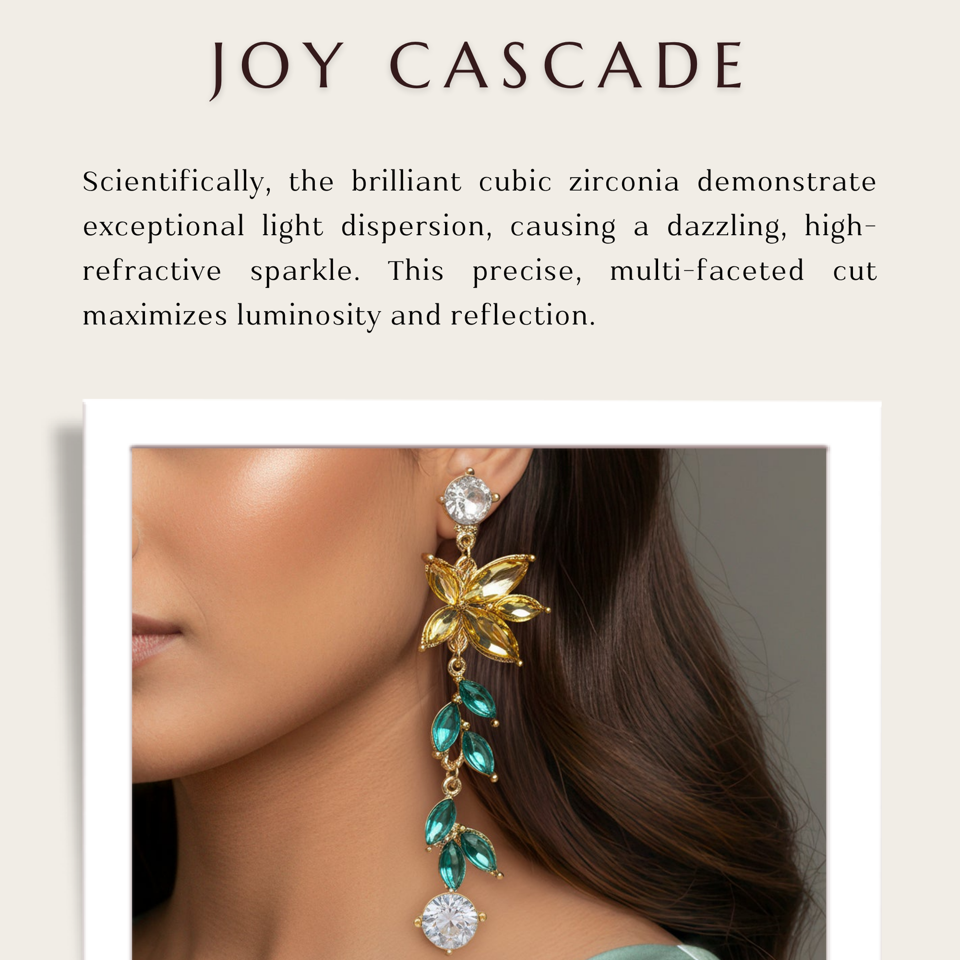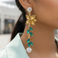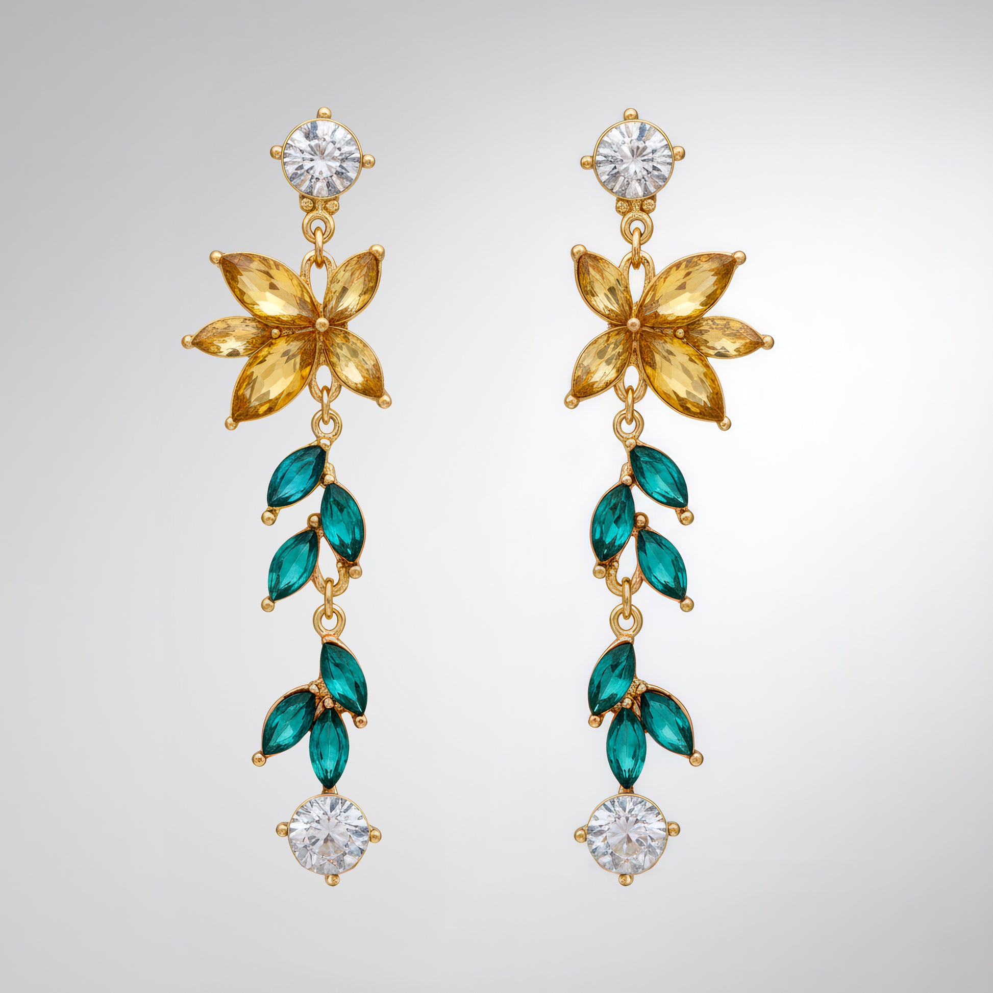 These long dangling earrings are embellished with brilliant crystals that give a radiant sheen to every movement, and they feature an exquisite combination of flower and leaf shapes. A graceful and elegant aesthetic is produced by the detailed design, which emphasizes the delicate interplay between components inspired by nature. The earrings are perfect for formal gatherings, parties, and festive occasions because they are soft and lightweight, allowing for effortless wear for extended periods of time. They go well with both traditional and modern ensembles thanks to their elongated form, which enhances the neckline and adds a bit of drama. These earrings, which are made to draw attention with their understated brightness, are a multipurpose piece that enhances any outfit. They are a classic option for anyone looking for elegance and a jewelry collection that makes a statement, as they are a harmonious fusion of nature-inspired artistry and sophisticated brilliance.