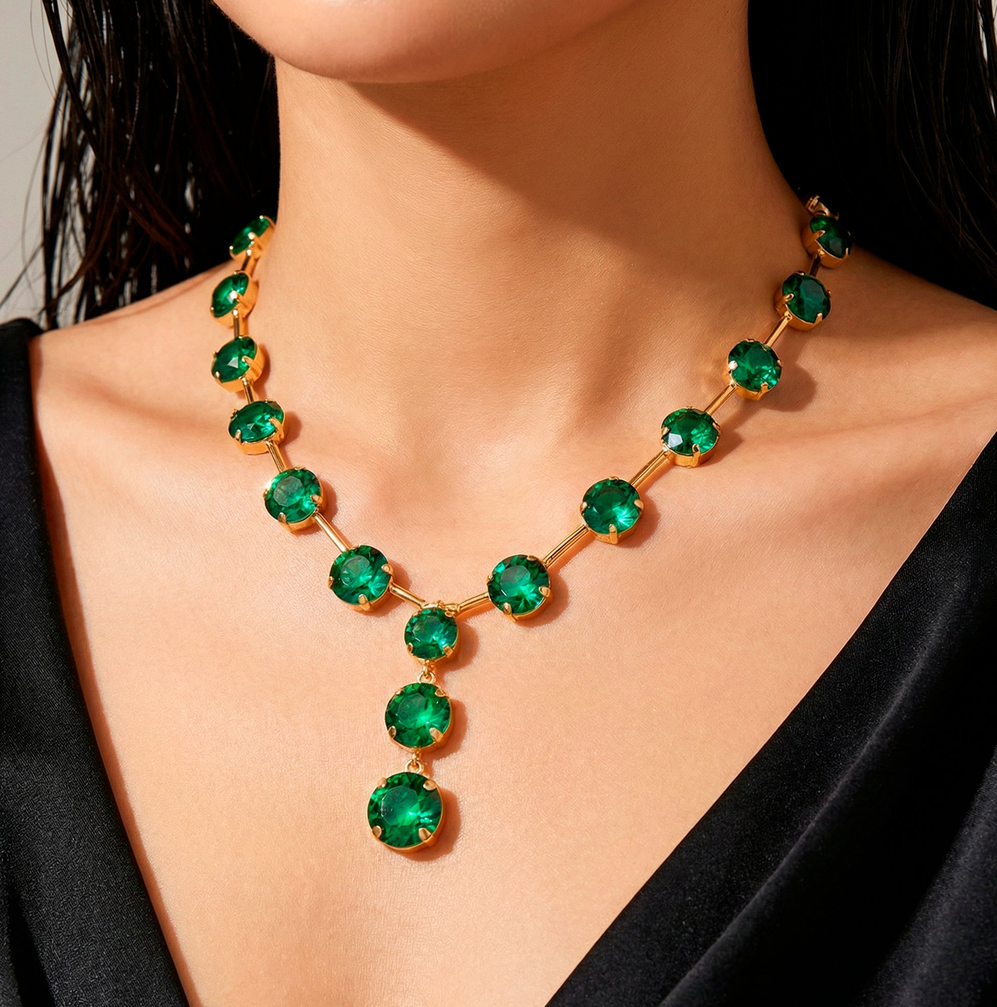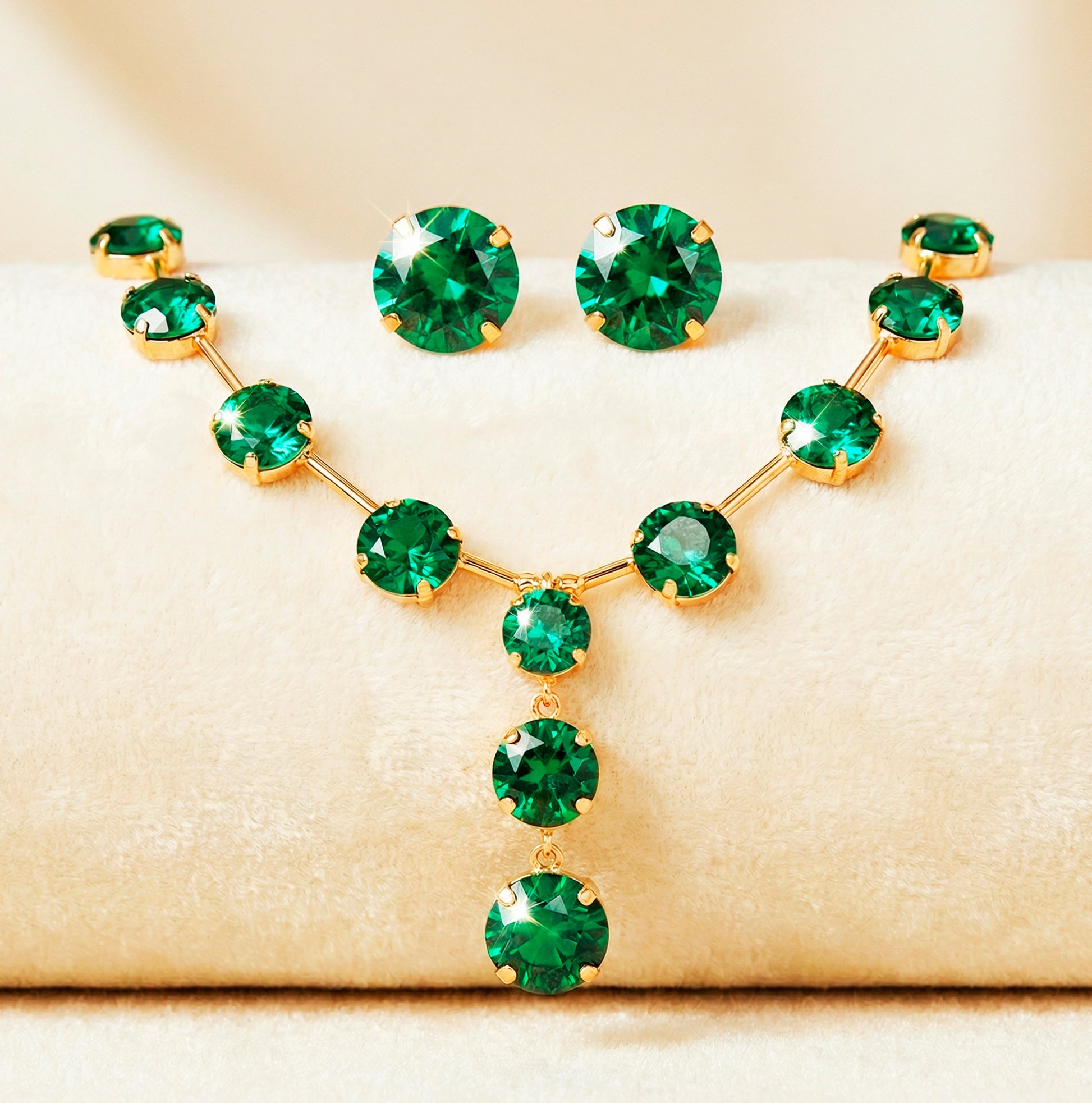 This necklace set strikes a balance between elegance and brightness with its exquisite arrangement of spherical gems and spacer accents in a deep emerald hue. Because the crystals are cut perfectly, light is captured and reflected, adding a slight shine to the overall pattern. The set creates a professional and well-coordinated appearance that is appropriate for both formal and celebratory settings when paired with matching earrings. Its classic design makes it suitable for a wide range of ensembles, and its lightweight construction guarantees comfort. This set adds refinement and appeal to any jewelry collection, whether it is worn as a final touch to formal wear or as a pop of color to casual apparel.