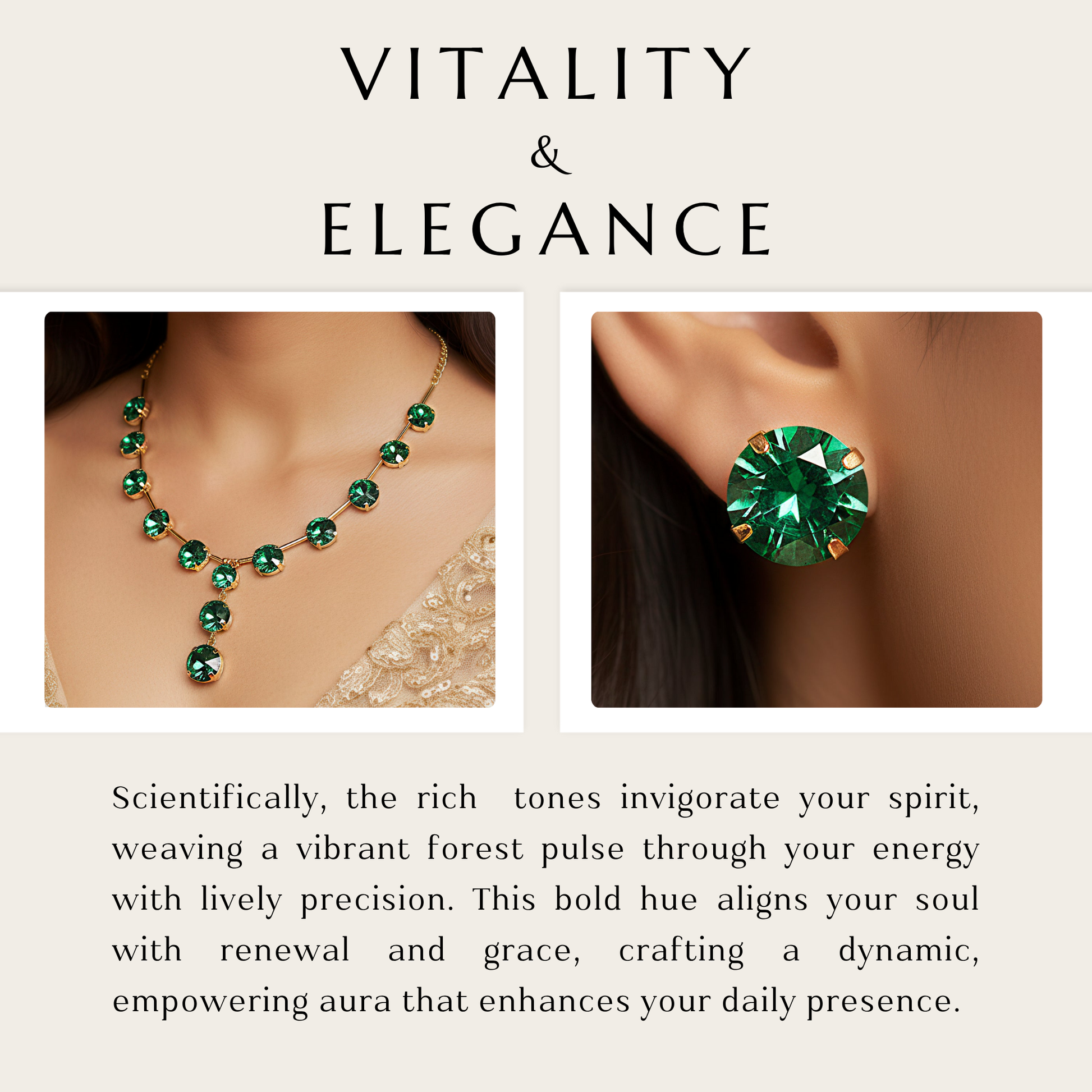 This necklace set strikes a balance between elegance and brightness with its exquisite arrangement of spherical gems and spacer accents in a deep emerald hue. Because the crystals are cut perfectly, light is captured and reflected, adding a slight shine to the overall pattern. The set creates a professional and well-coordinated appearance that is appropriate for both formal and celebratory settings when paired with matching earrings. Its classic design makes it suitable for a wide range of ensembles, and its lightweight construction guarantees comfort. This set adds refinement and appeal to any jewelry collection, whether it is worn as a final touch to formal wear or as a pop of color to casual apparel.