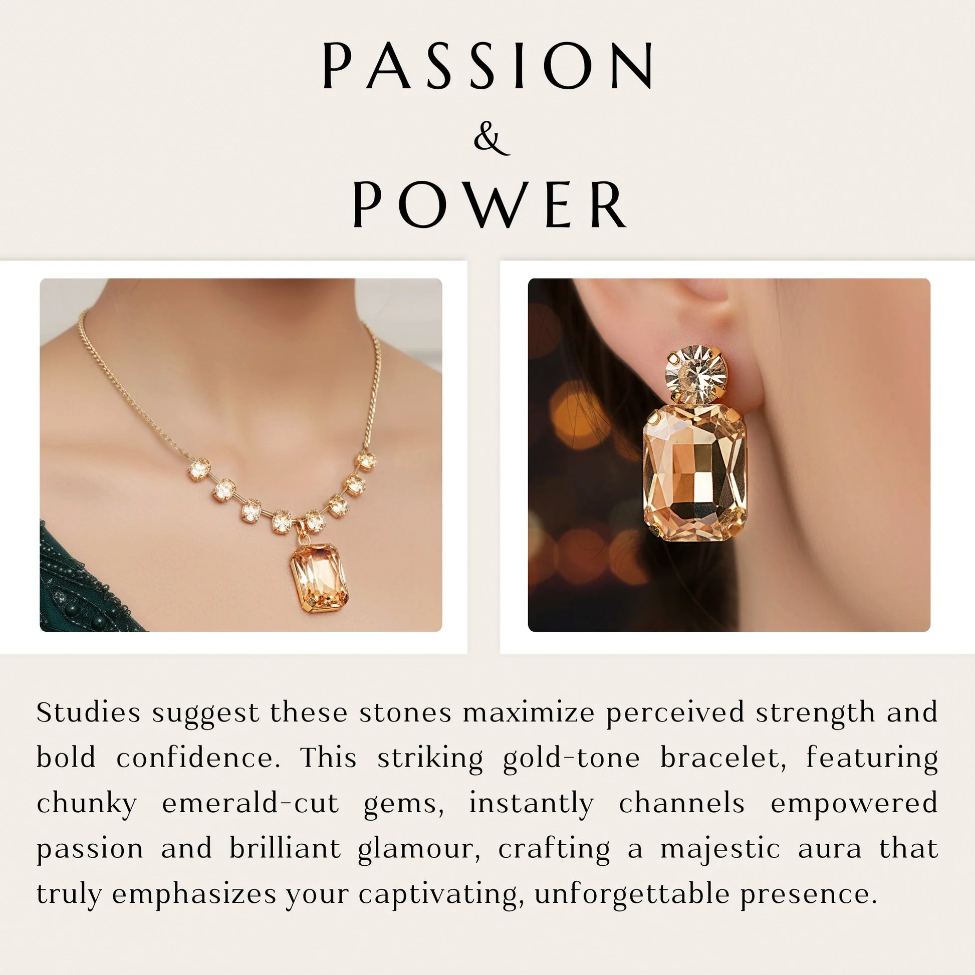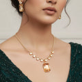 This necklace set exudes sophisticated beauty with its elegant blend of oval champagne crystals and spacer accents. A beautiful rectangular crystal pendant sits in the center, acting as the piece's bold focal point and adding to its overall refinement. The sparkling champagne-toned crystals provide a warm, radiant light that goes well with many different types of clothing. The combination, when paired with matching earrings, produces a well-balanced and cohesive style that is ideal for festive festivities, nighttime get-togethers, and special occasions. It is comfy and light, and it adds glitz without being overpowering. This set is a versatile and alluring addition to any jewelry collection because of its timeless design and brilliant centerpiece, which combine modern artistry with classic charm.