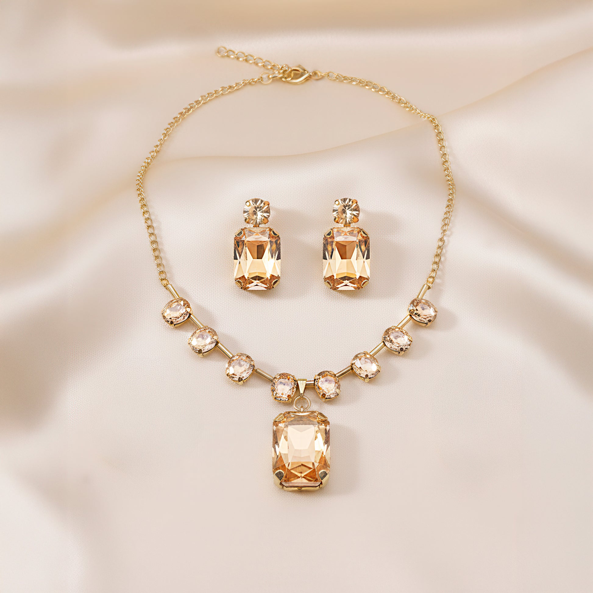 This necklace set exudes sophisticated beauty with its elegant blend of oval champagne crystals and spacer accents. A beautiful rectangular crystal pendant sits in the center, acting as the piece's bold focal point and adding to its overall refinement. The sparkling champagne-toned crystals provide a warm, radiant light that goes well with many different types of clothing. The combination, when paired with matching earrings, produces a well-balanced and cohesive style that is ideal for festive festivities, nighttime get-togethers, and special occasions. It is comfy and light, and it adds glitz without being overpowering. This set is a versatile and alluring addition to any jewelry collection because of its timeless design and brilliant centerpiece, which combine modern artistry with classic charm.